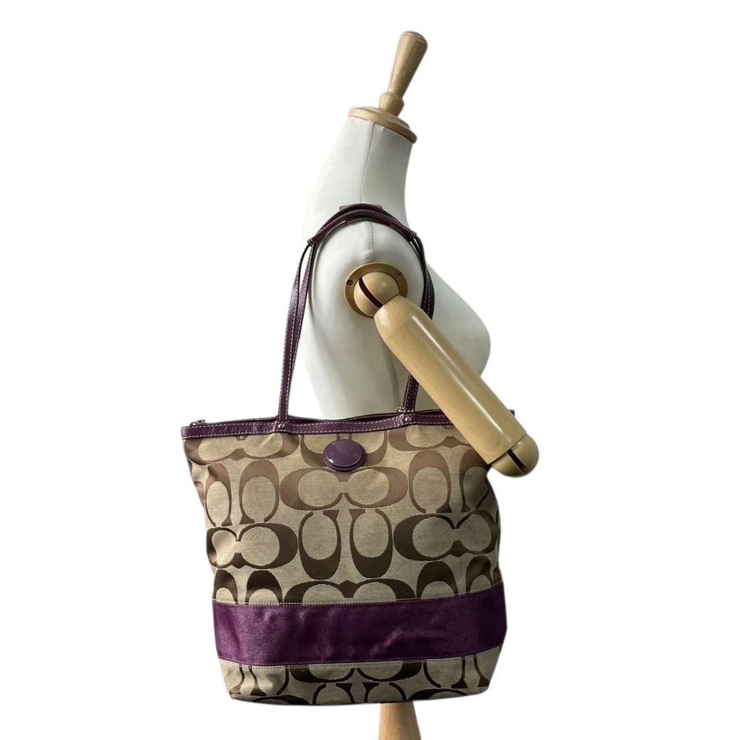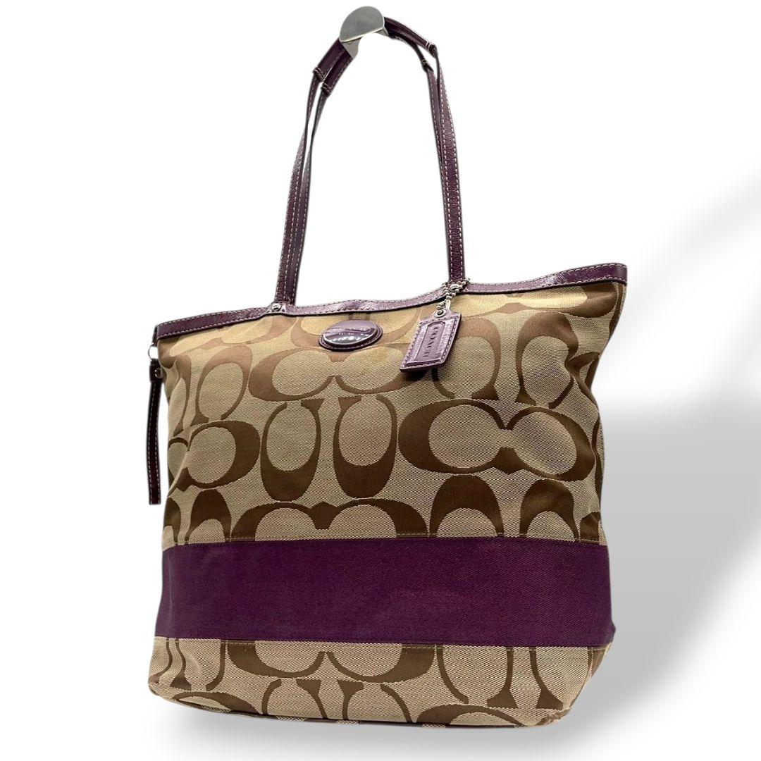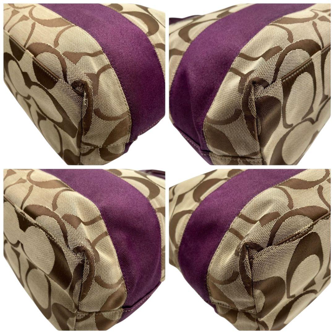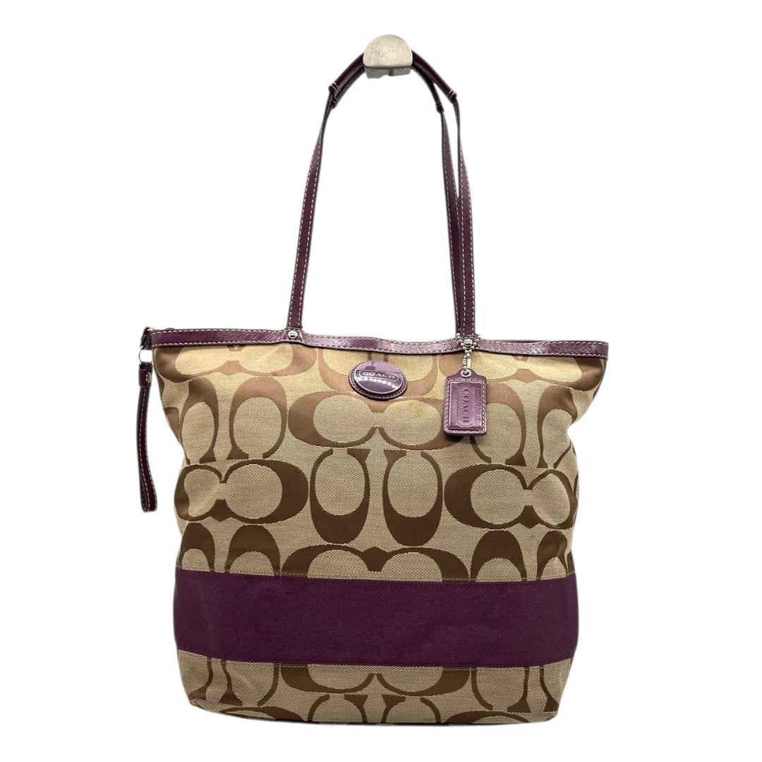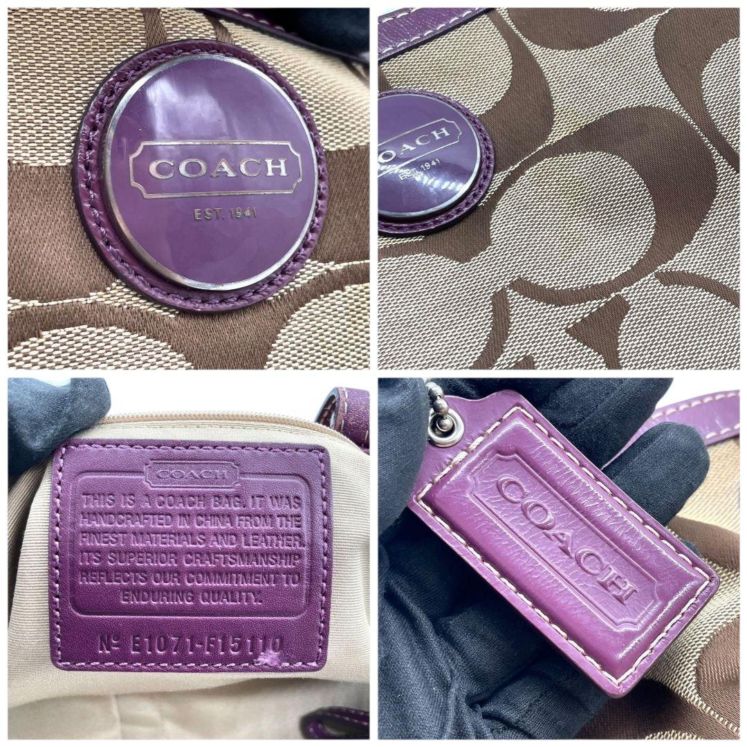 コーチ トートバッグ 茶 ブラウン パープル シグネチャー ワンショル A4収納可 ハンドバッグ キャンバス レザー 本革 肩掛け可 シルバー金具 ロゴタグ ロゴプレート COACH F15110
