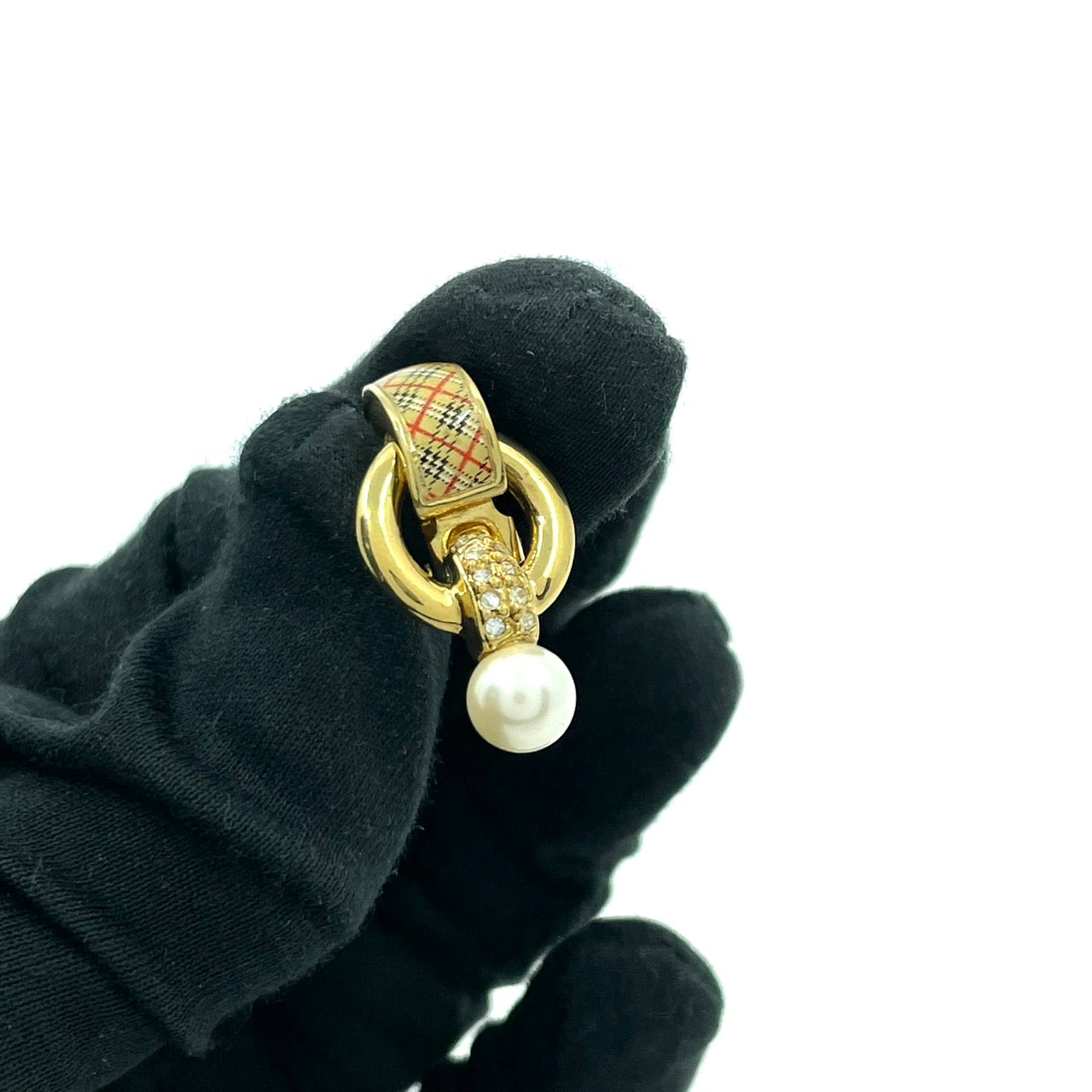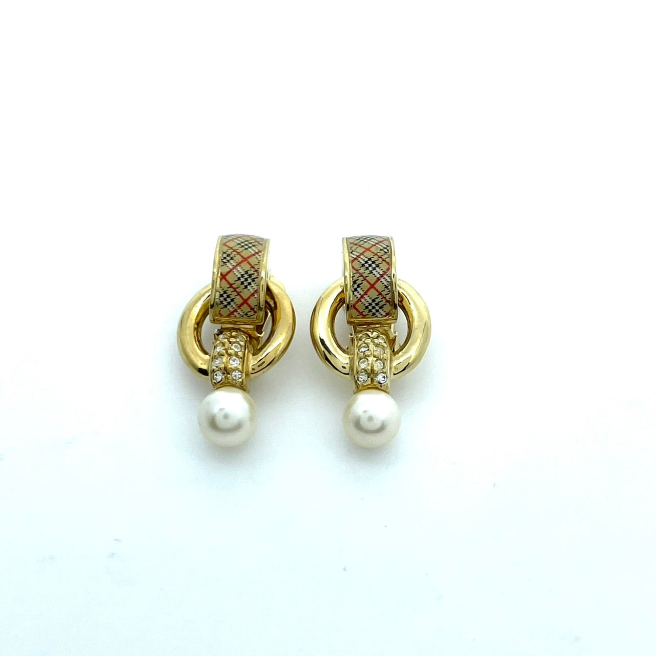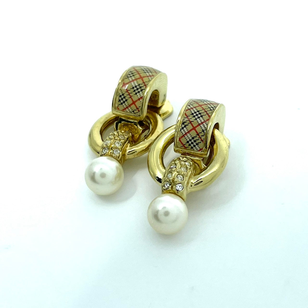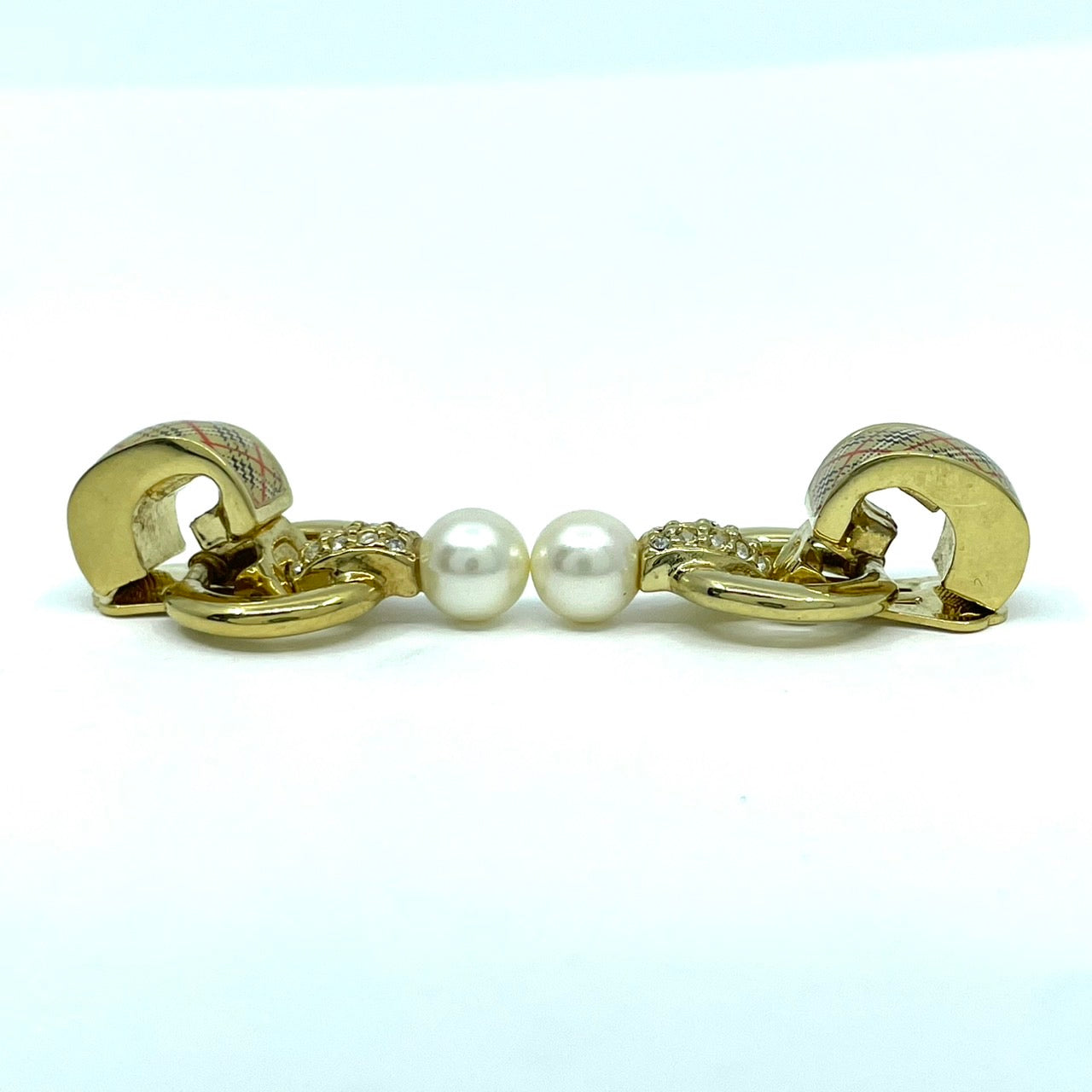 美品 BURBERRY バーバリー ノバチェック イヤリング ゴールド×クリスタル パール調チャーム ヴィンテージ アクセサリー 正規品 金 ラインストーン I1