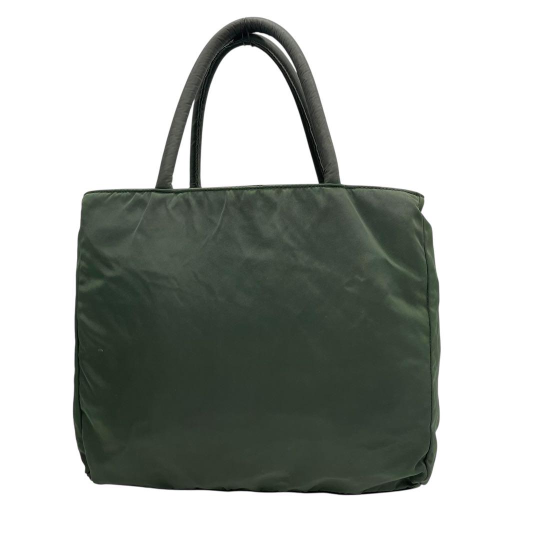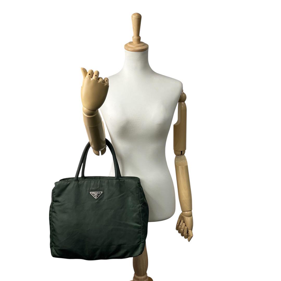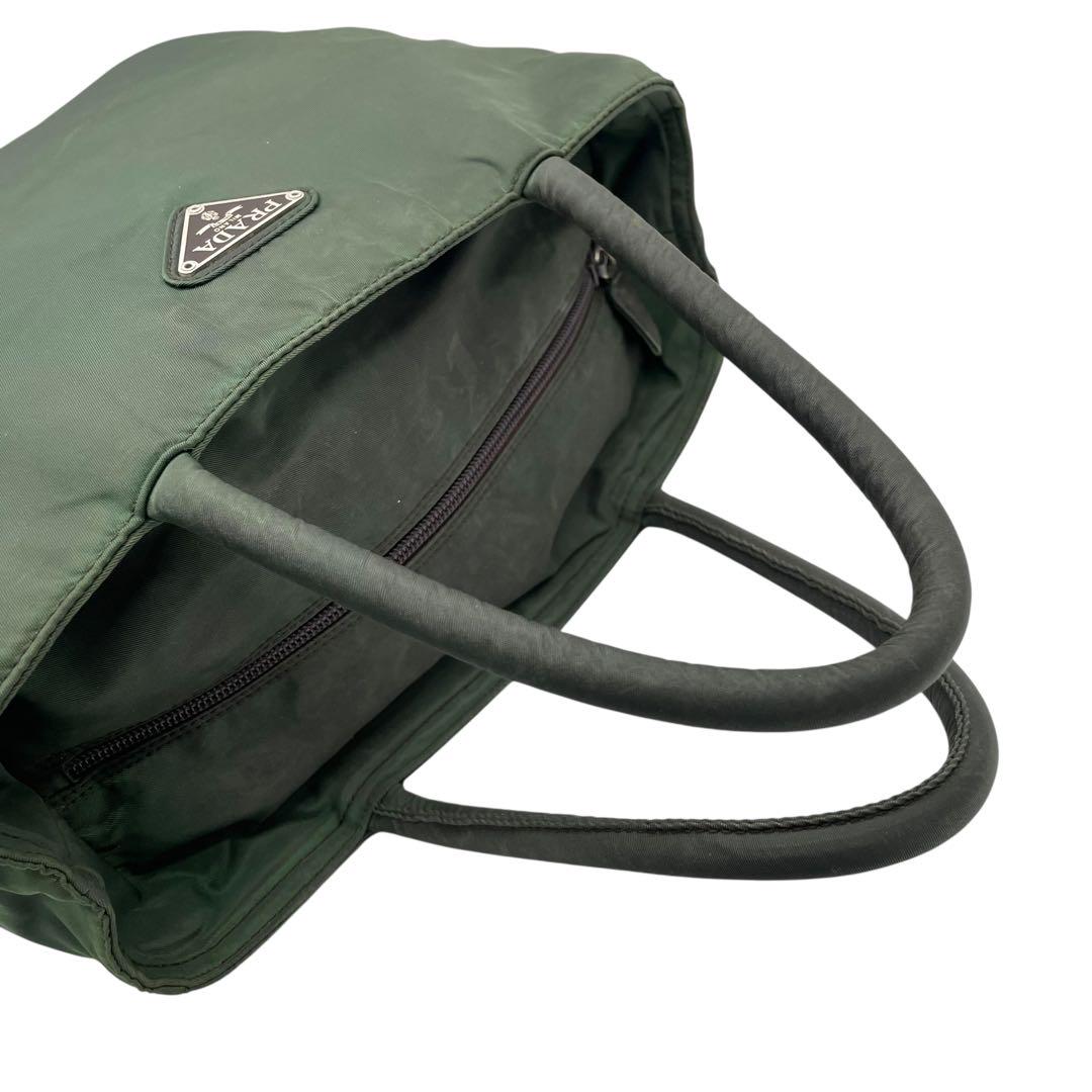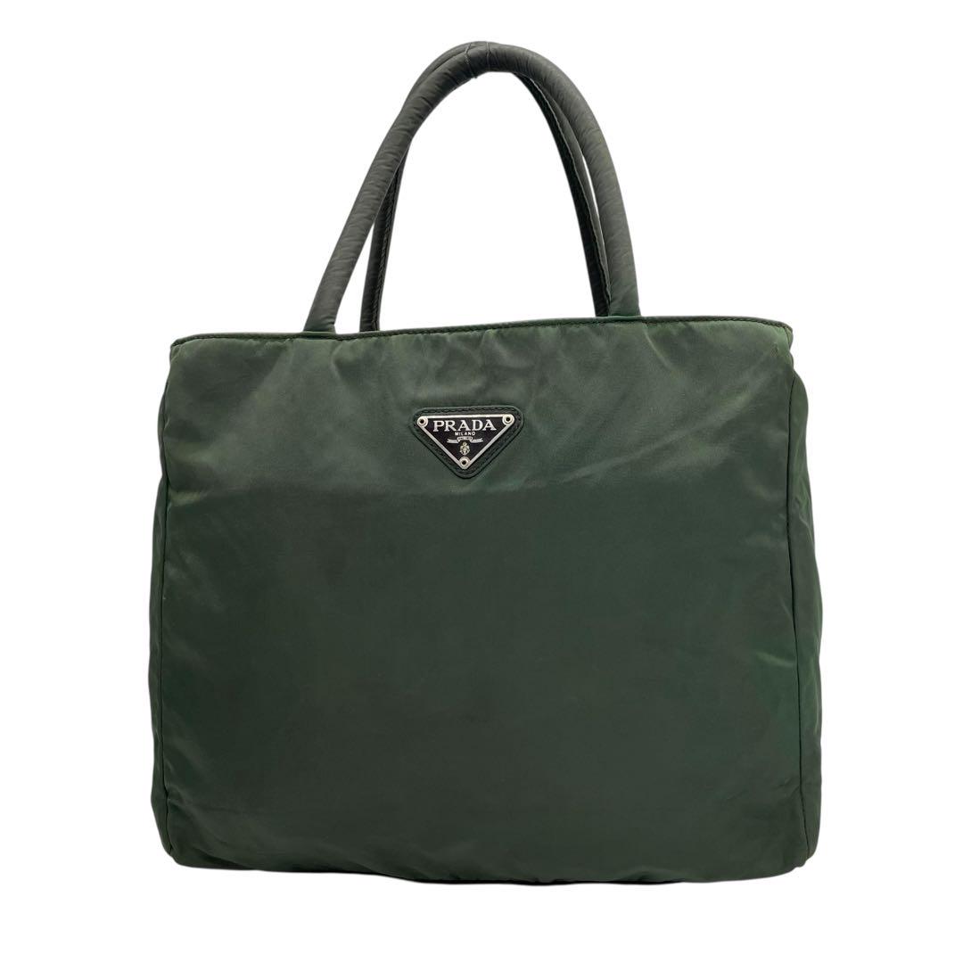プラダ テスートナイロン ハンドバッグ 三角ロゴ カーキ グリーン トライアングル トートバッグ コンパクト ナイロン シルバー金具 PRADA レディース