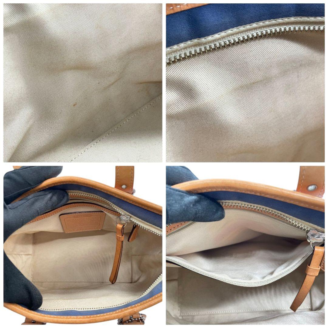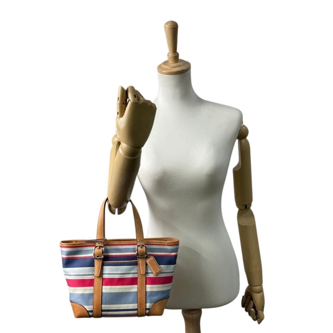 コーチ ハンドバッグ 茶 ボーダー柄 キャンバス レザー COACH u14 トートバッグ 本革 シルバー金具 ロゴタグ ブラウン レッド ブルー ホワイト