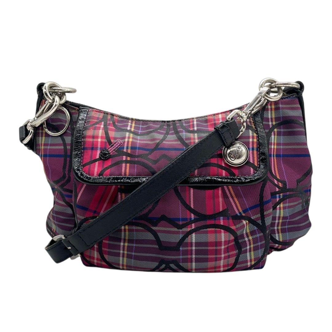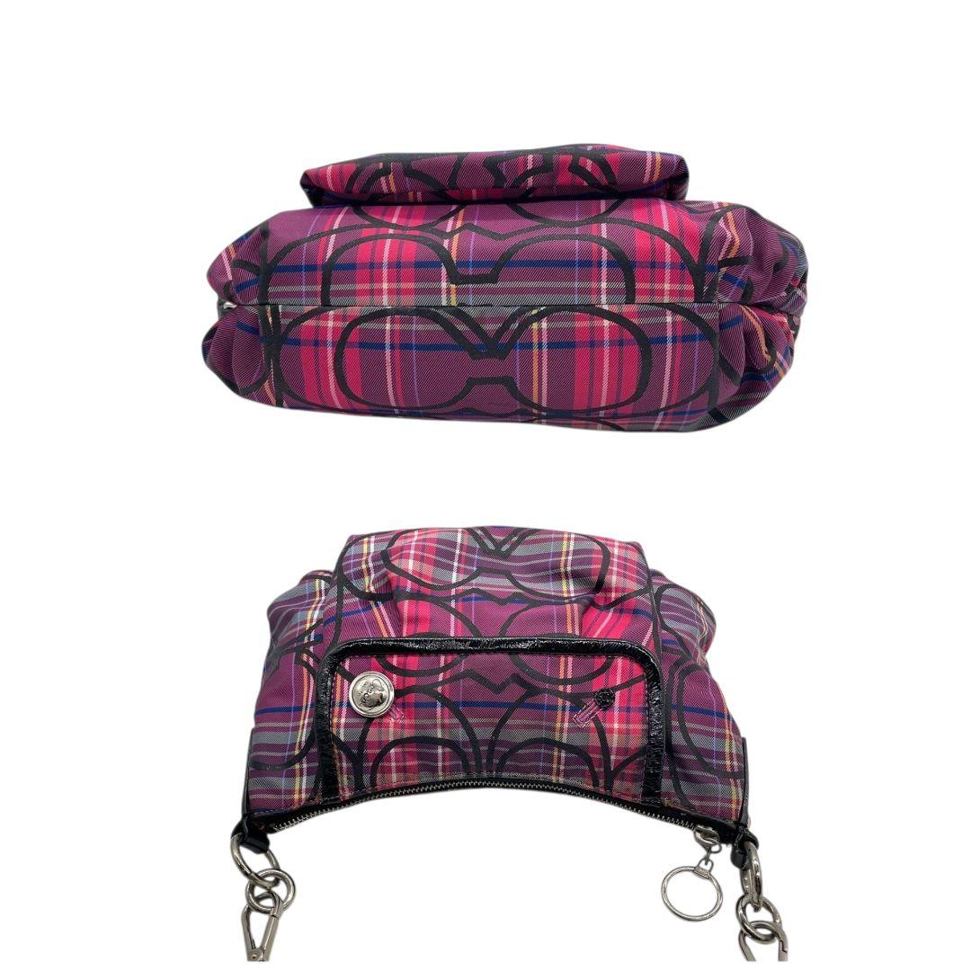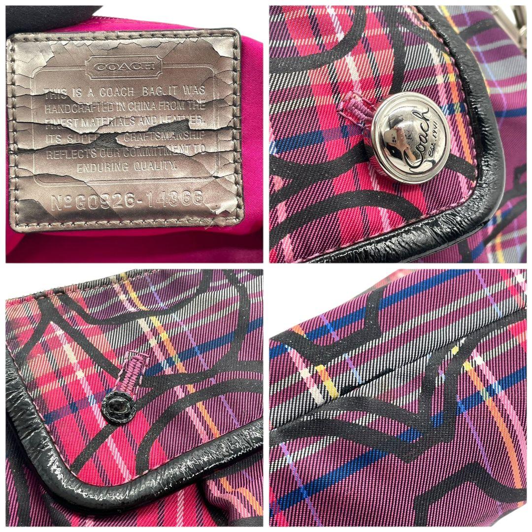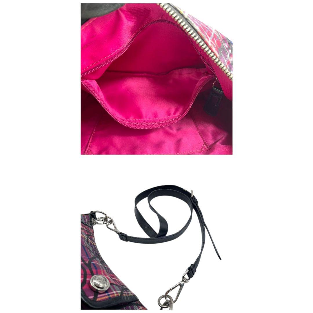 美品 コーチ ショルダーバッグ ピンク チェック柄 シグネチャー 斜め掛け可 u14 ナイロン レザー 本革 ロゴボタン シルバー金具 パープル ブラック COACH 14366