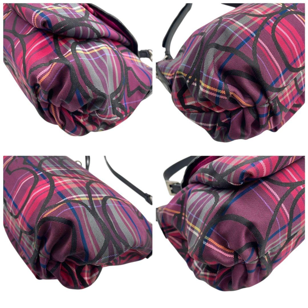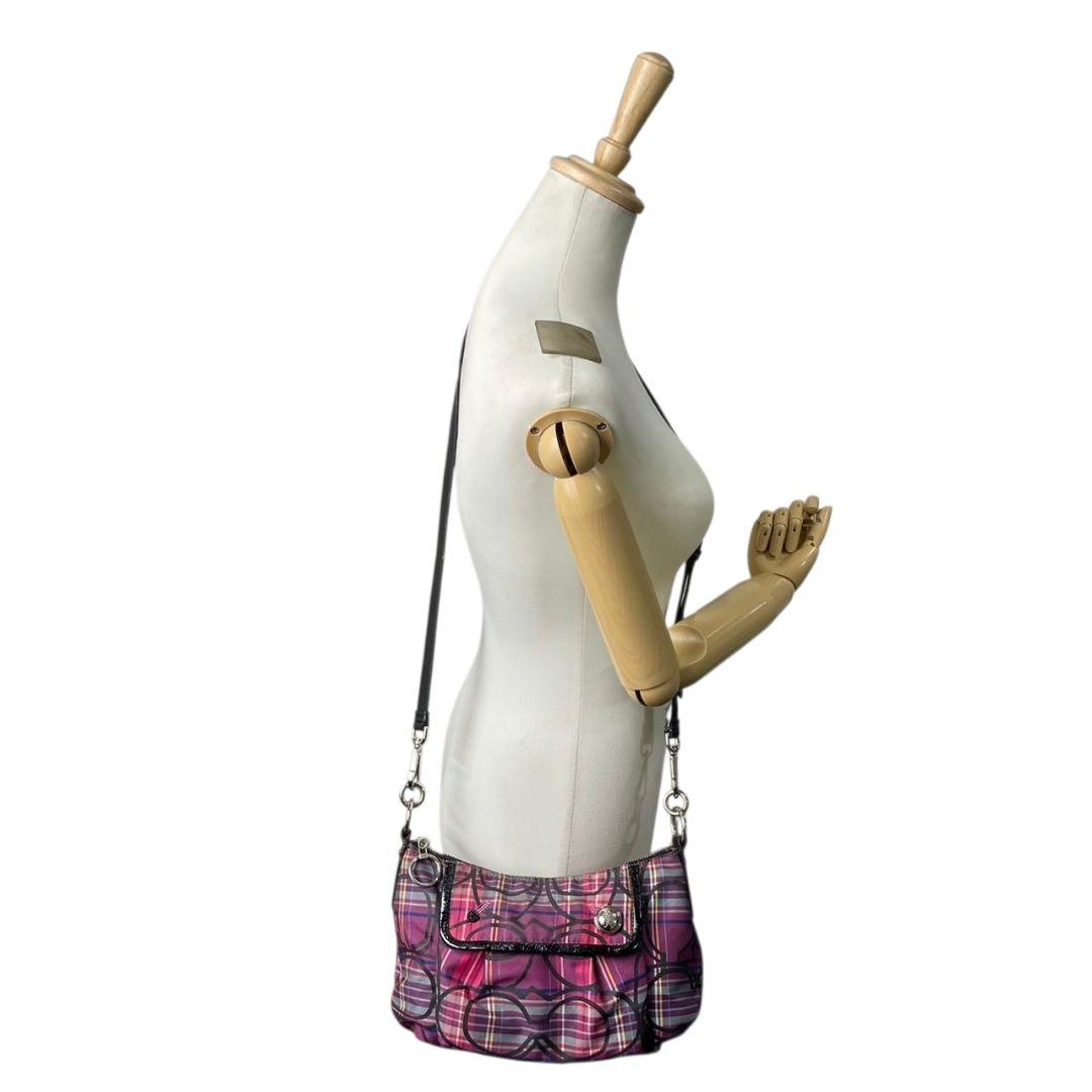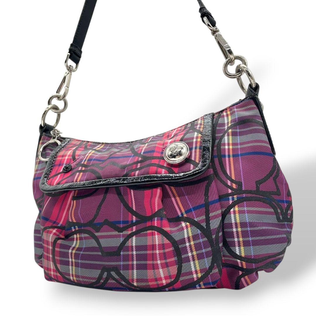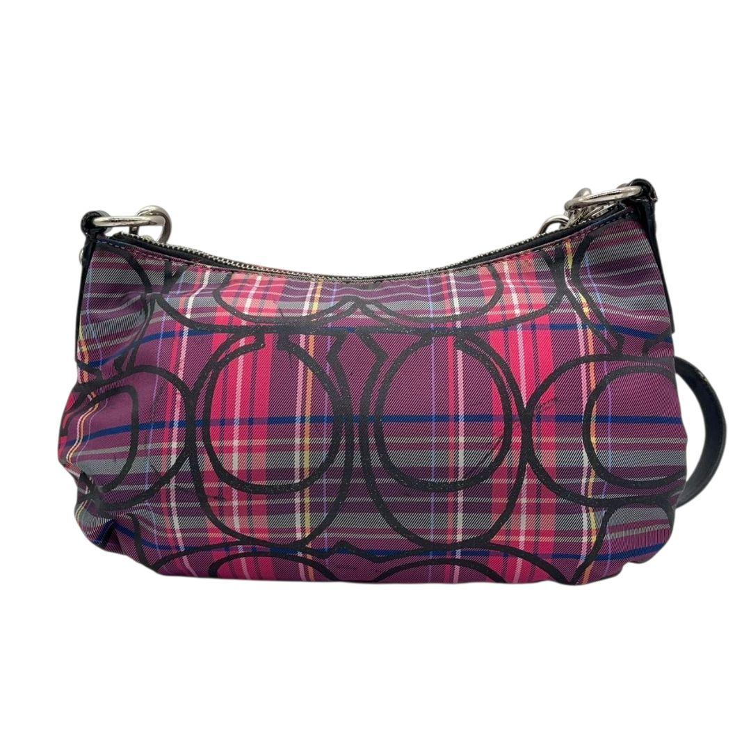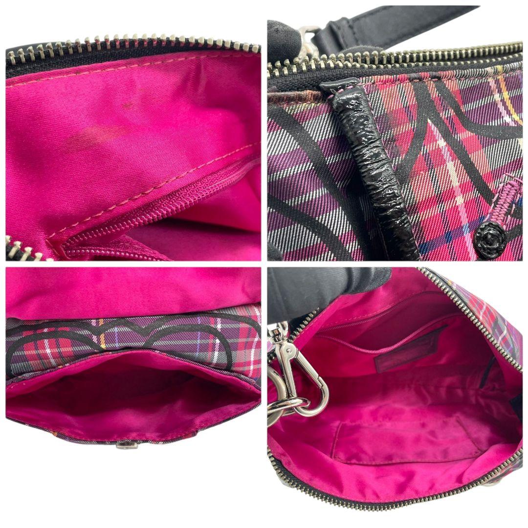 美品 コーチ ショルダーバッグ ピンク チェック柄 シグネチャー 斜め掛け可 u14 ナイロン レザー 本革 ロゴボタン シルバー金具 パープル ブラック COACH 14366