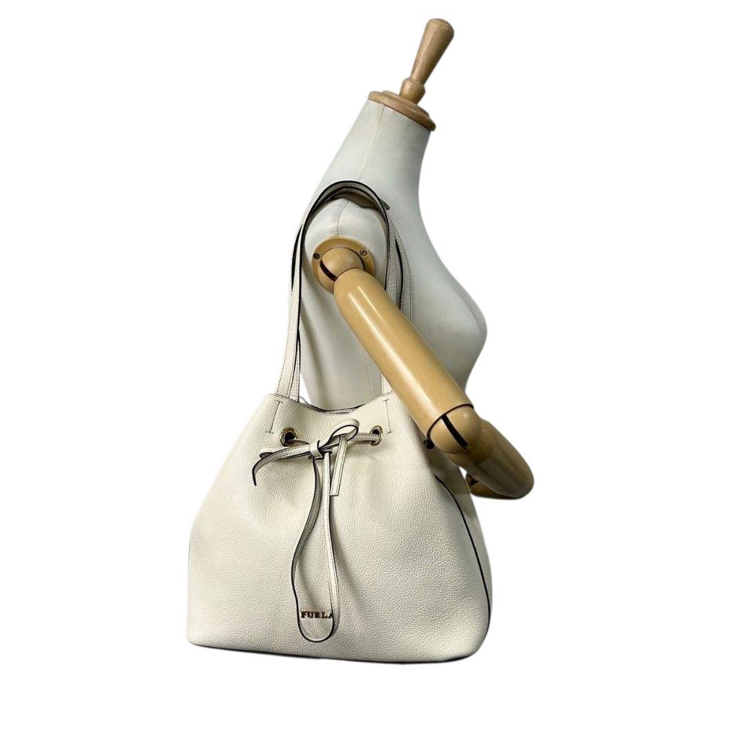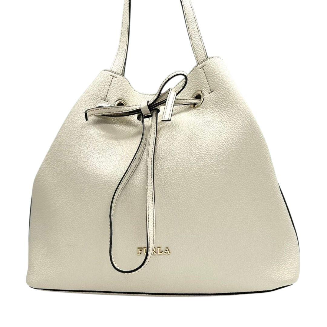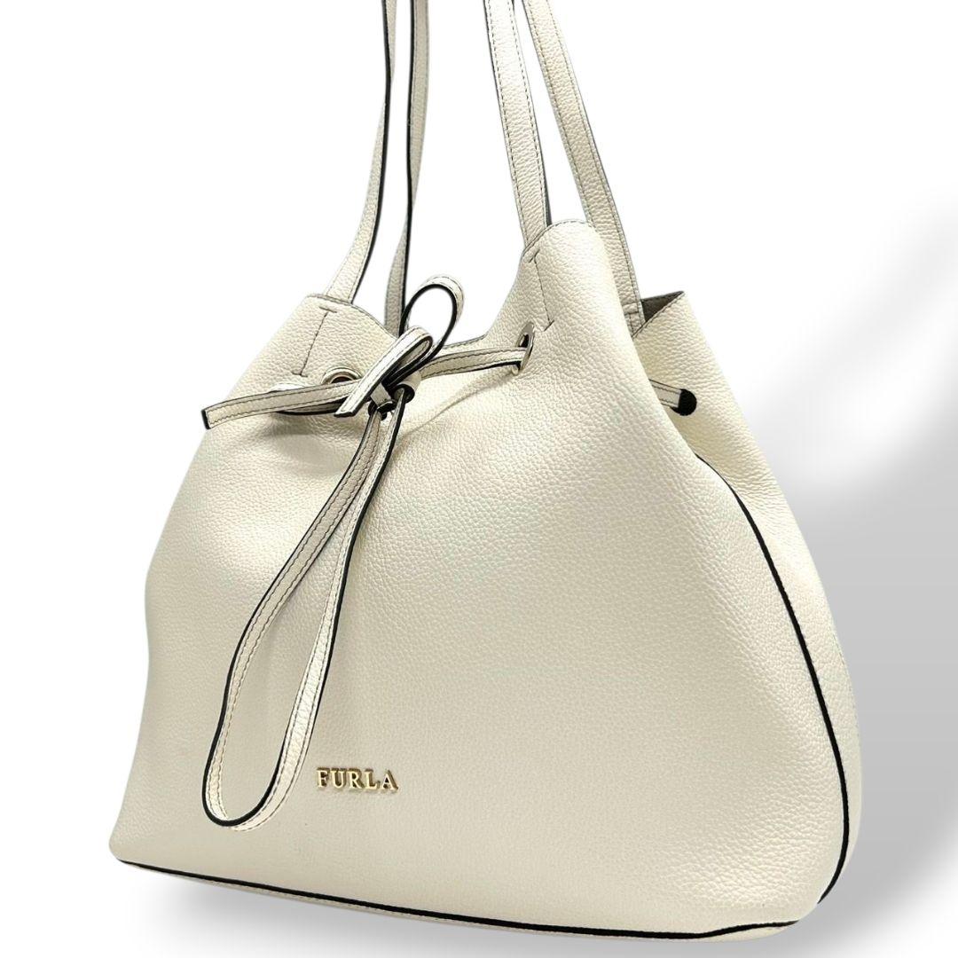 美品 フルラ ショルダーバッグ 白 巾着 レザー 本革 ワンショルダー s9 ハンドバッグ トートバッグ 肩掛け可 肩かけ可 ホワイト ゴールド金具 ロゴ 自立可 FURLA