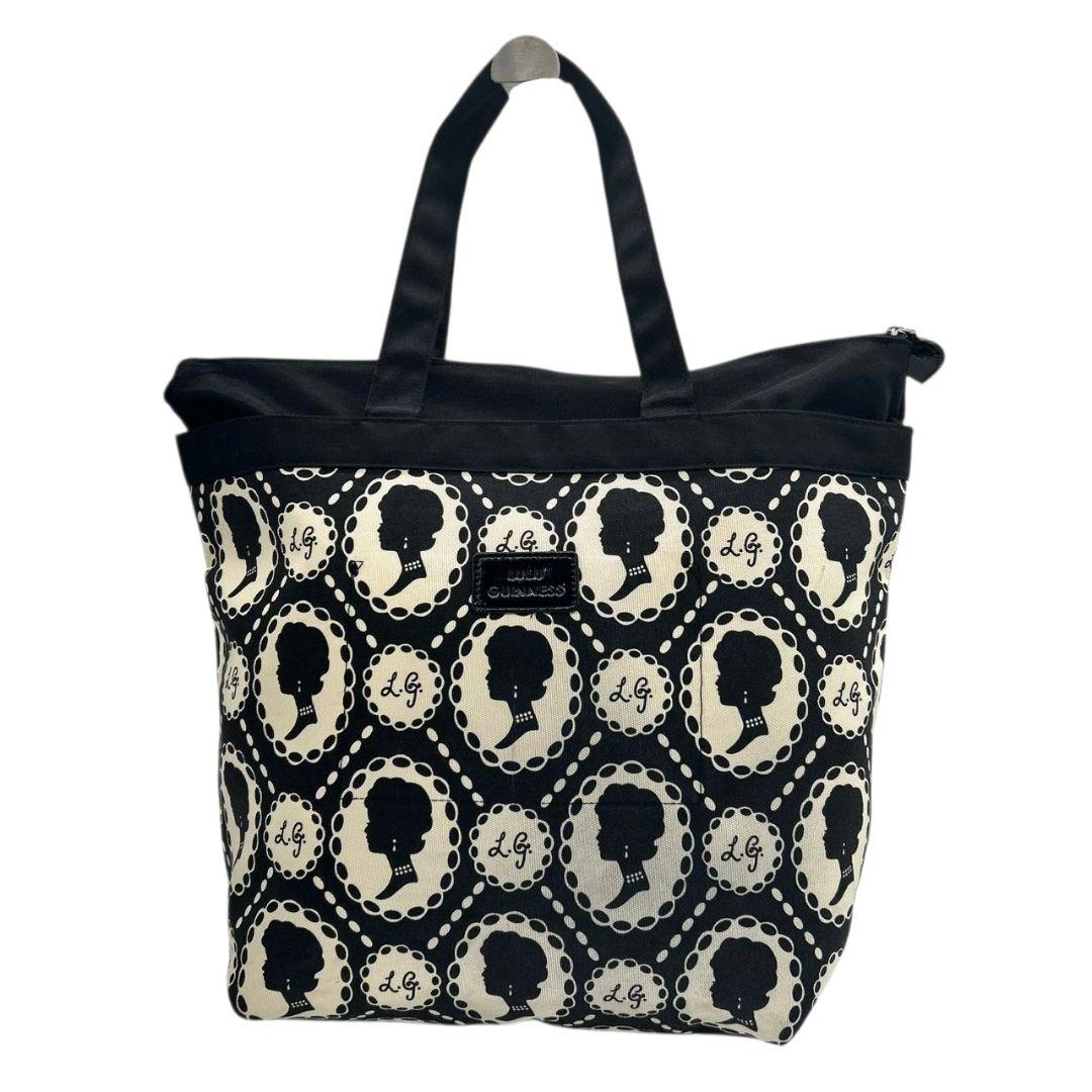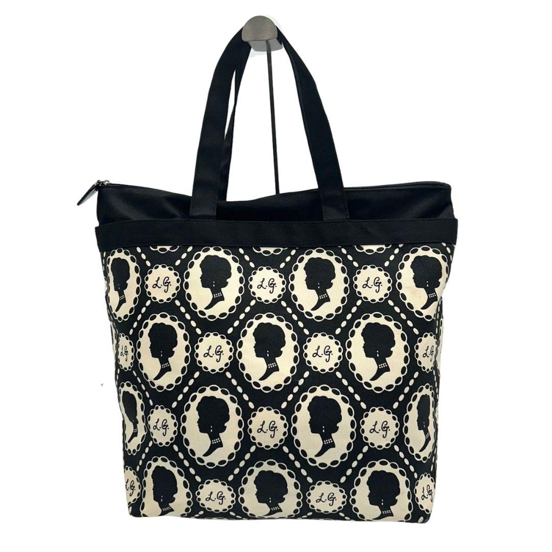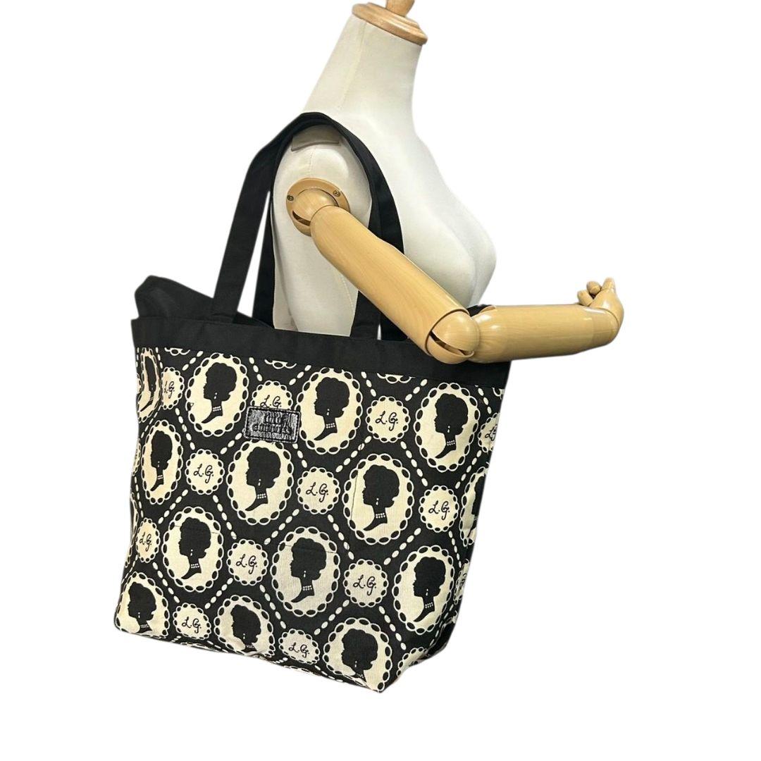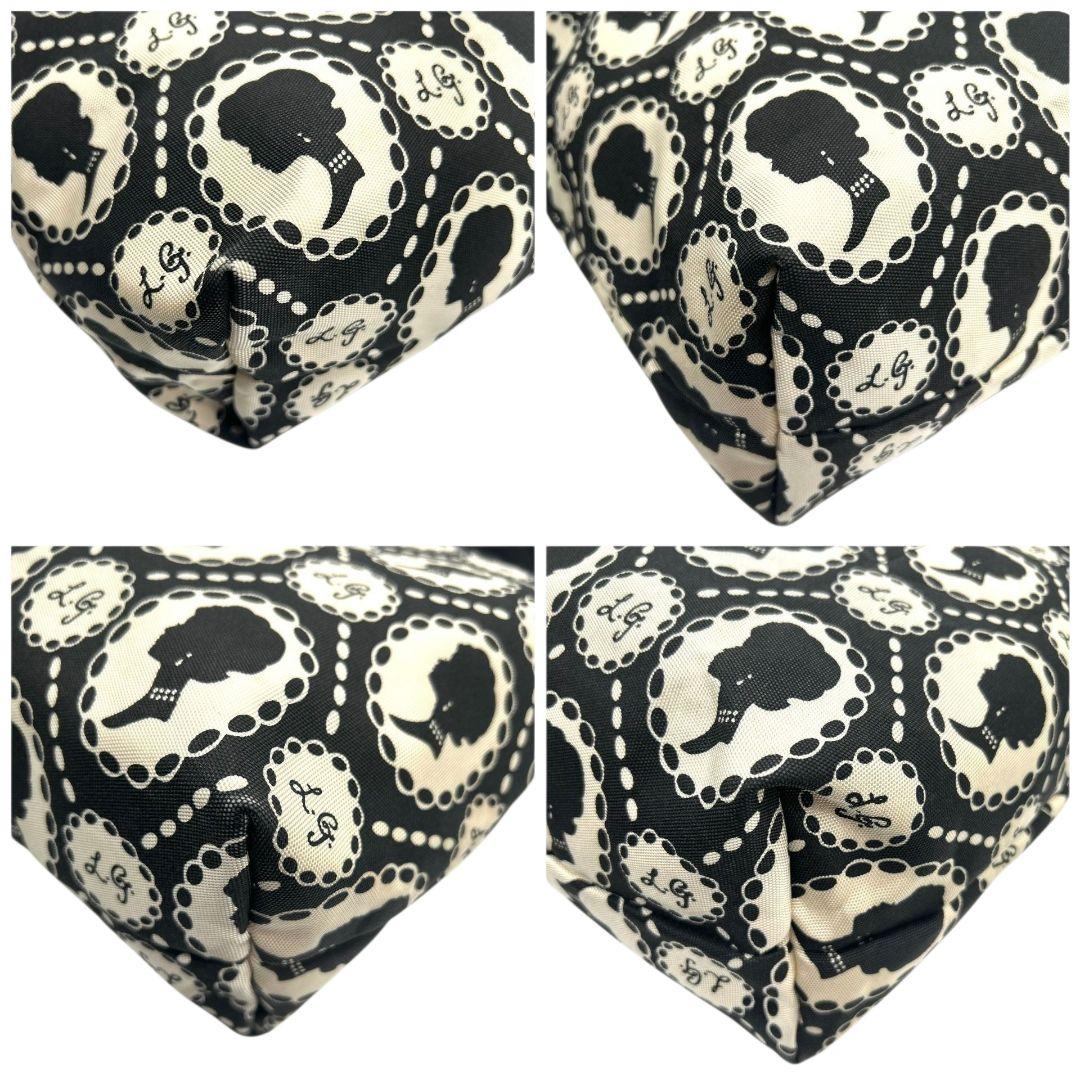 美品 ルルギネス トートバッグ 黒 白 総柄 キャンバス ワンショルダー T7 A4収納 ハンドバッグ ブラック ホワイト 肩掛け可 肩かけ可 ロゴプレート LULU GUINNESS