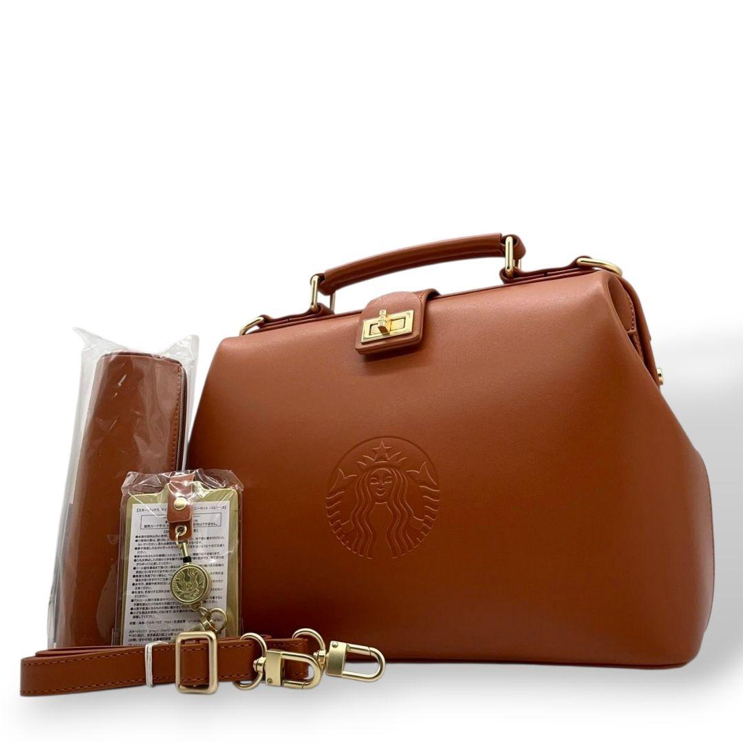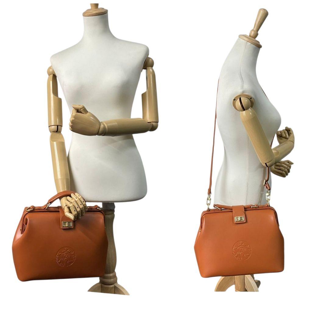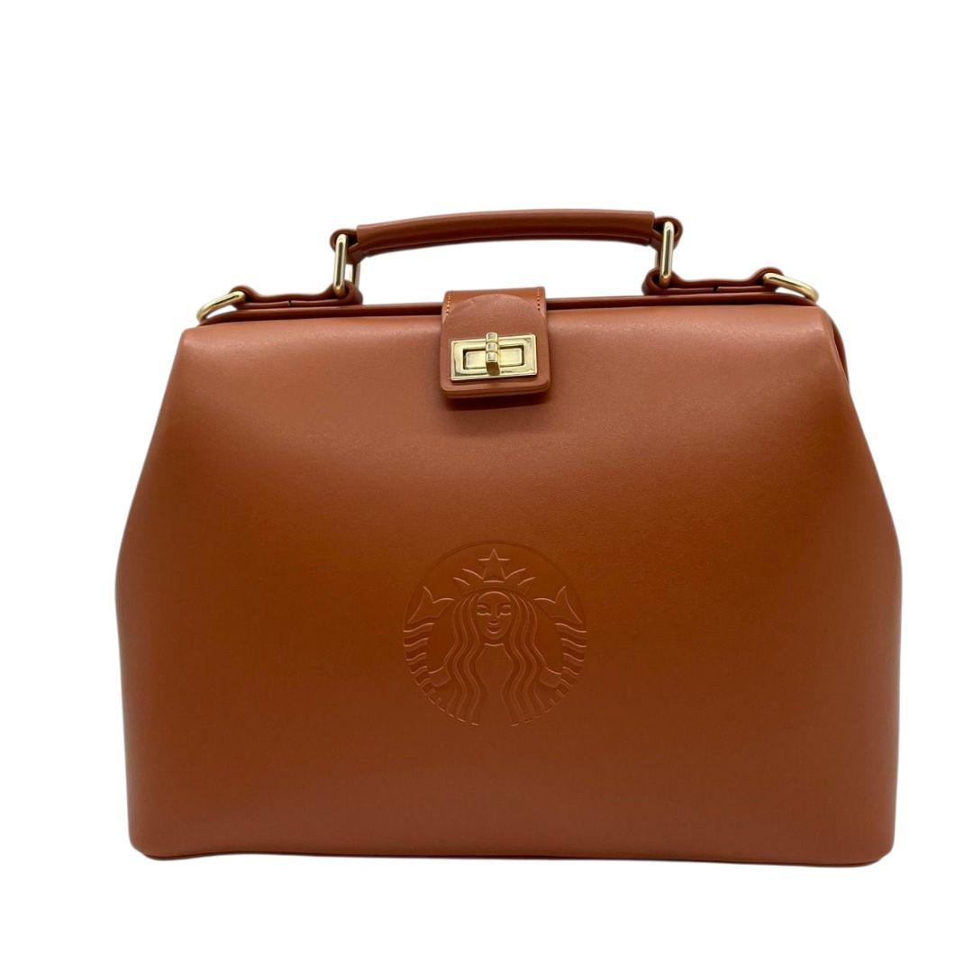 スターバックス ハンドバッグ 茶 ロゴ がま口 斜め掛け可 2way F ショルダーバッグ トートバッグ レザー 本革 ブラウン ゴールド金具