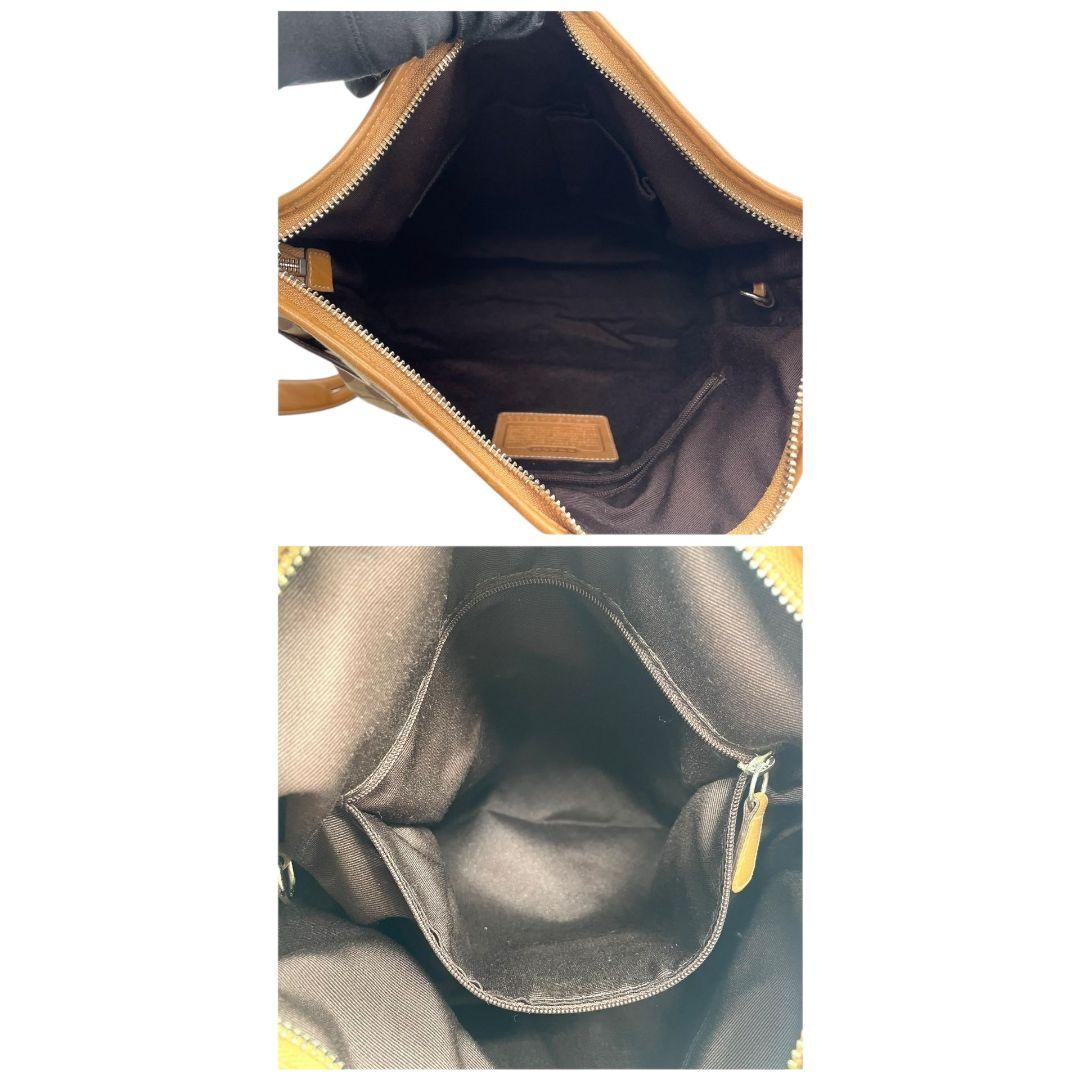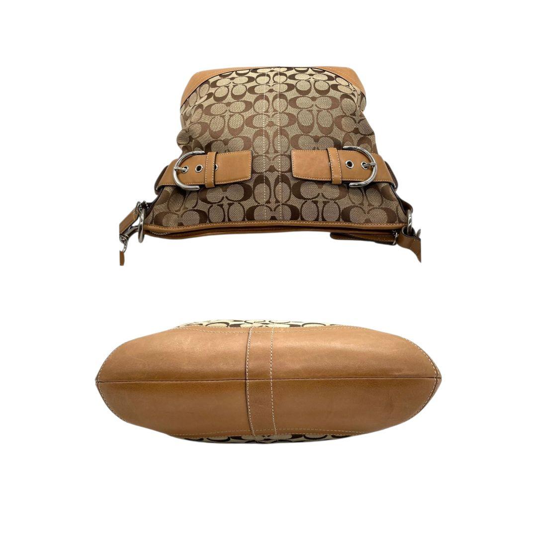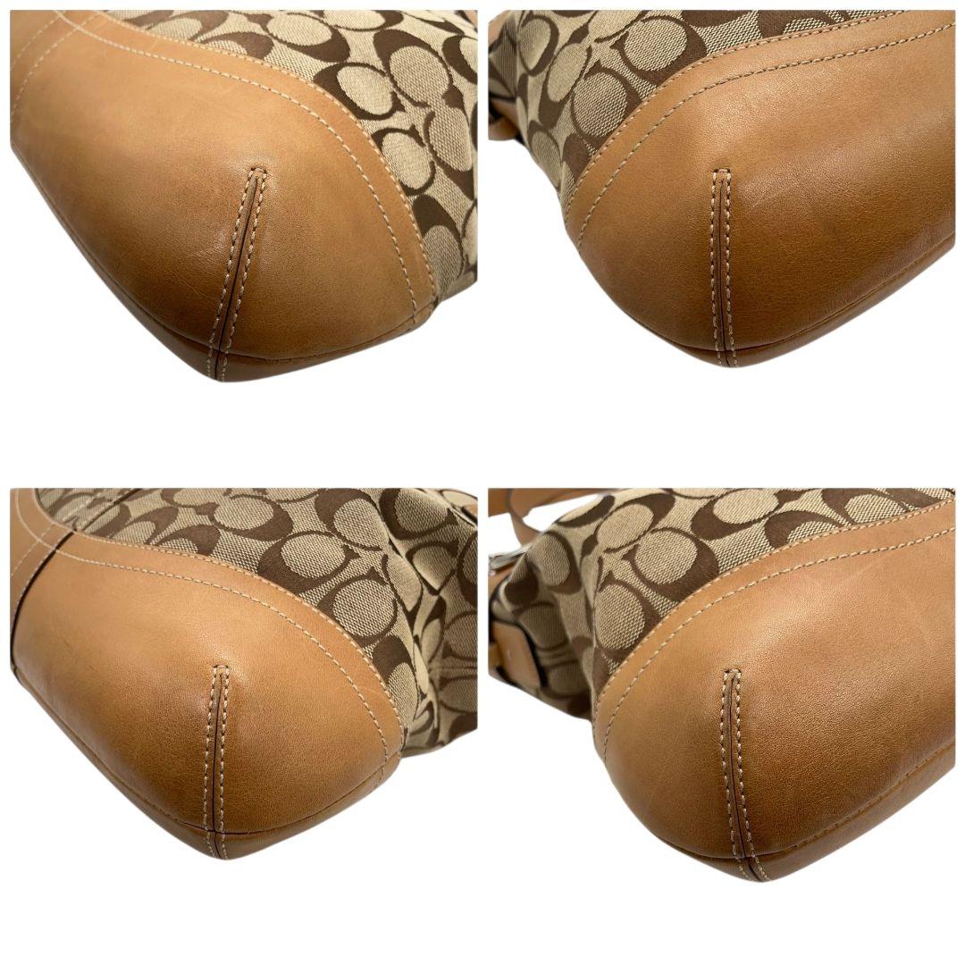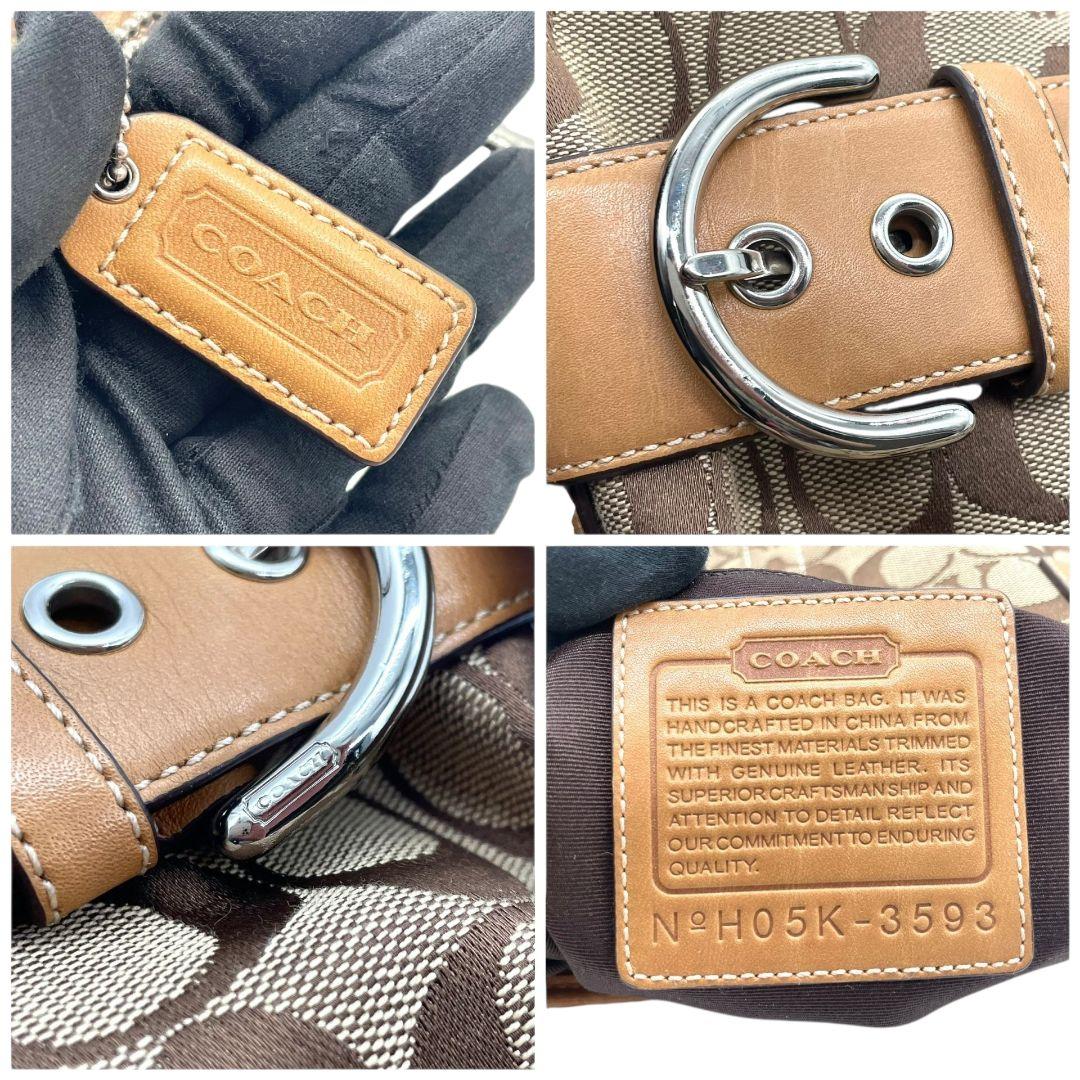 美品 コーチ ショルダーバッグ 茶 シグネチャー キャンバス レザー T6 斜め掛け可 本革 ブラウン シルバー金具 ロゴタグ COACH 3593