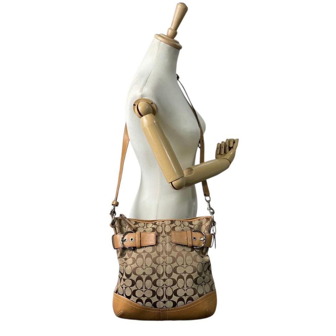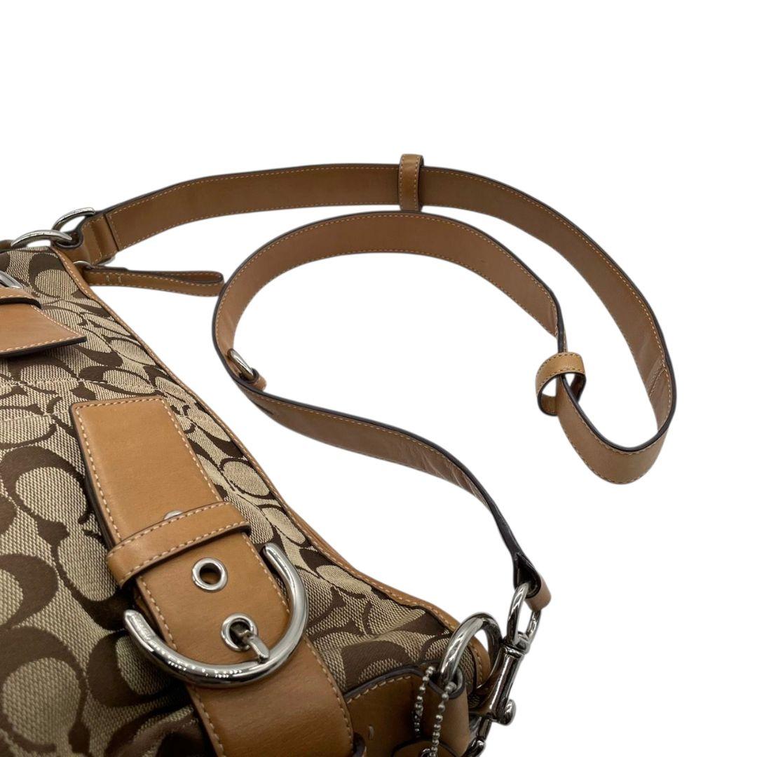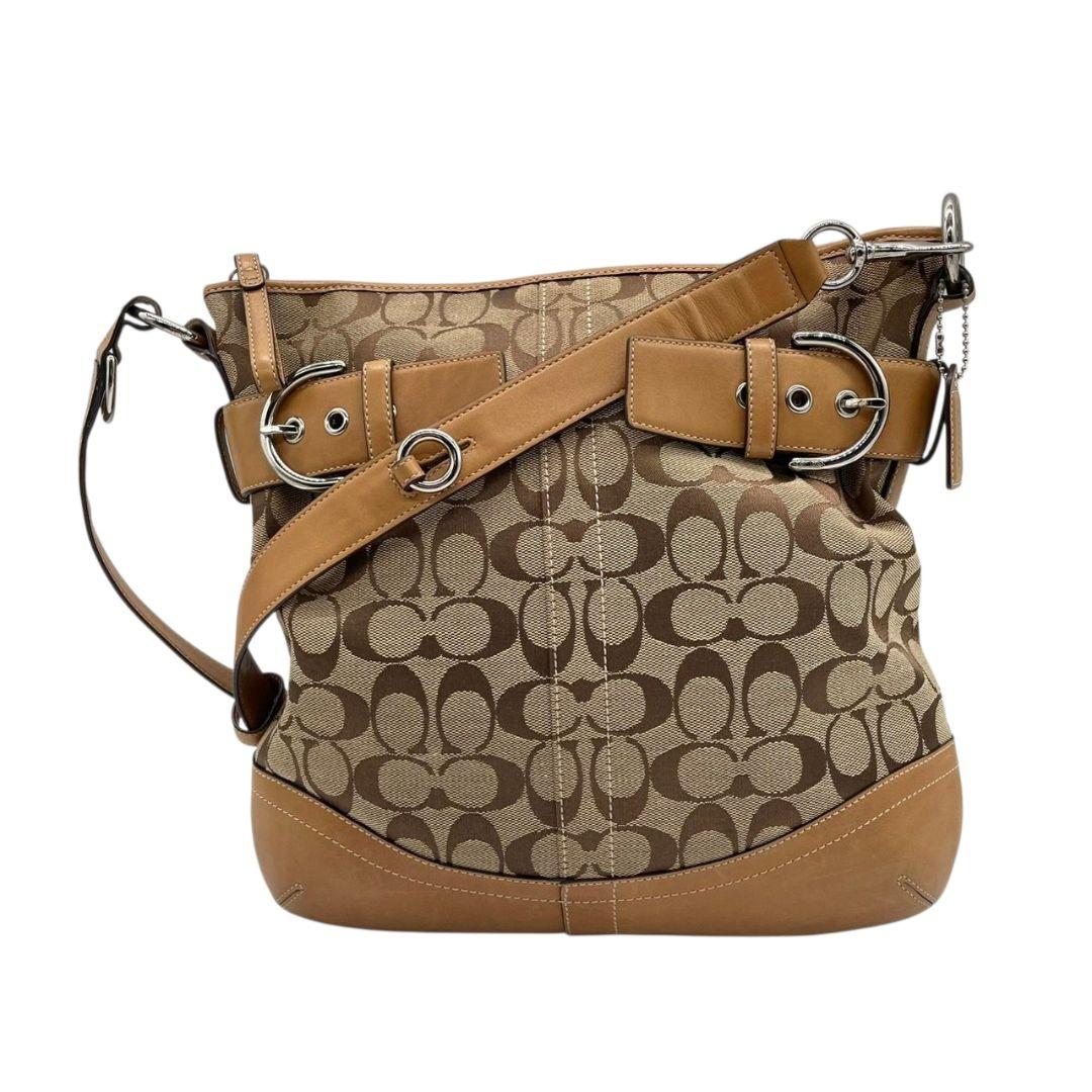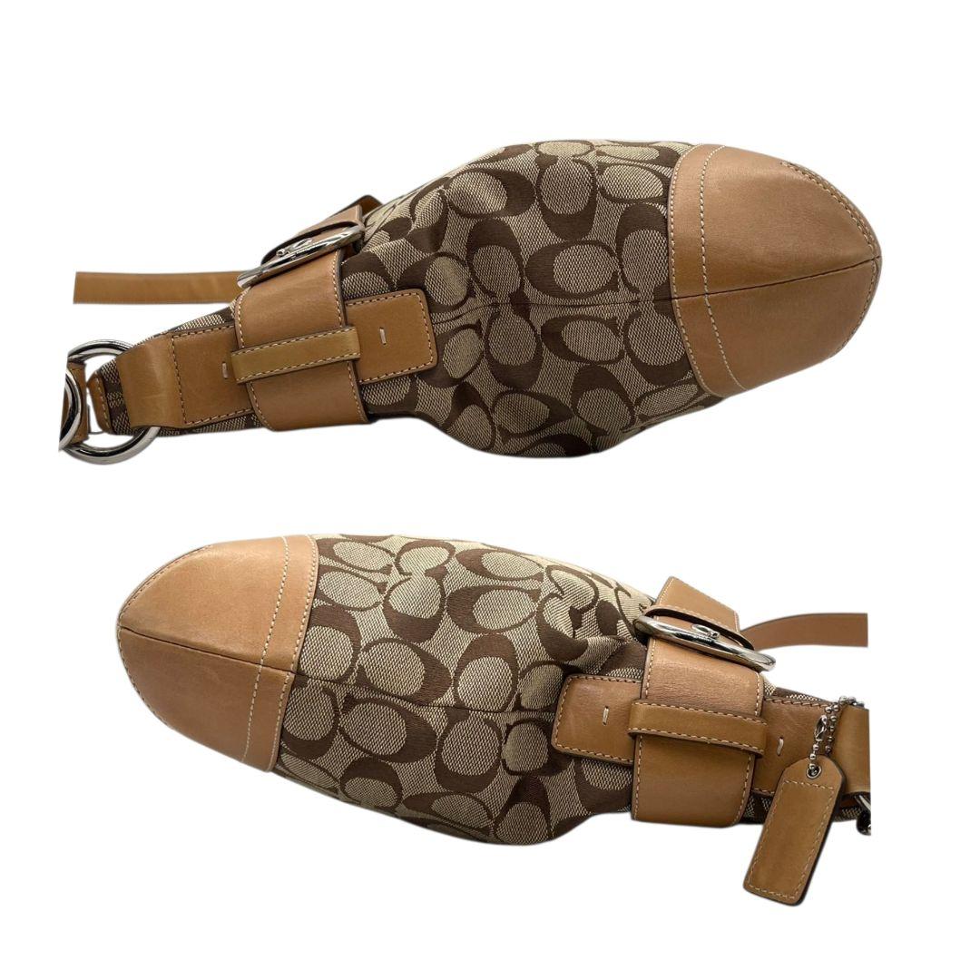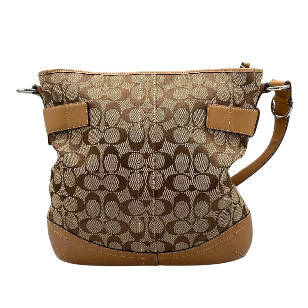 美品 コーチ ショルダーバッグ 茶 シグネチャー キャンバス レザー T6 斜め掛け可 本革 ブラウン シルバー金具 ロゴタグ COACH 3593