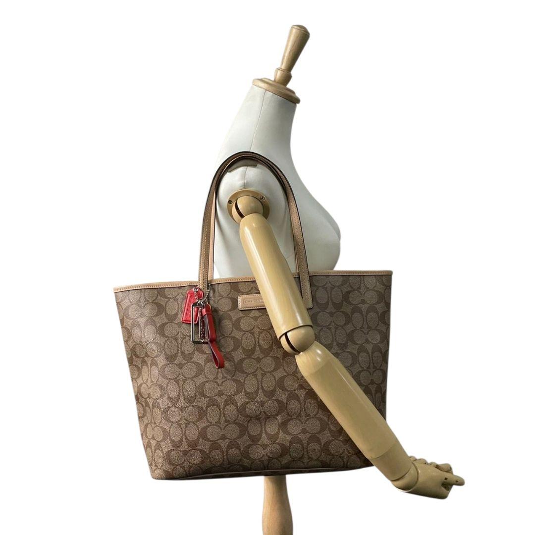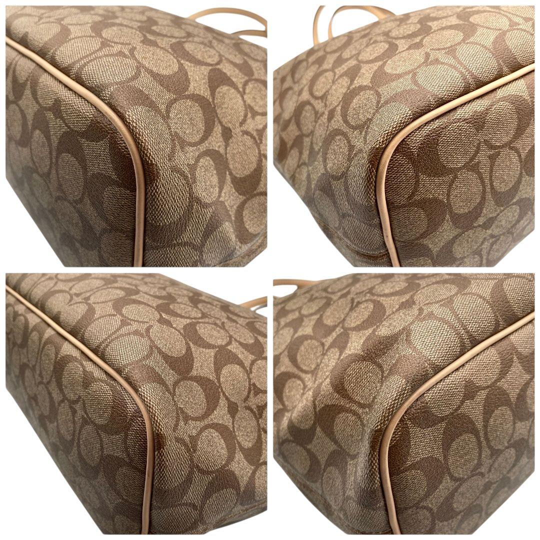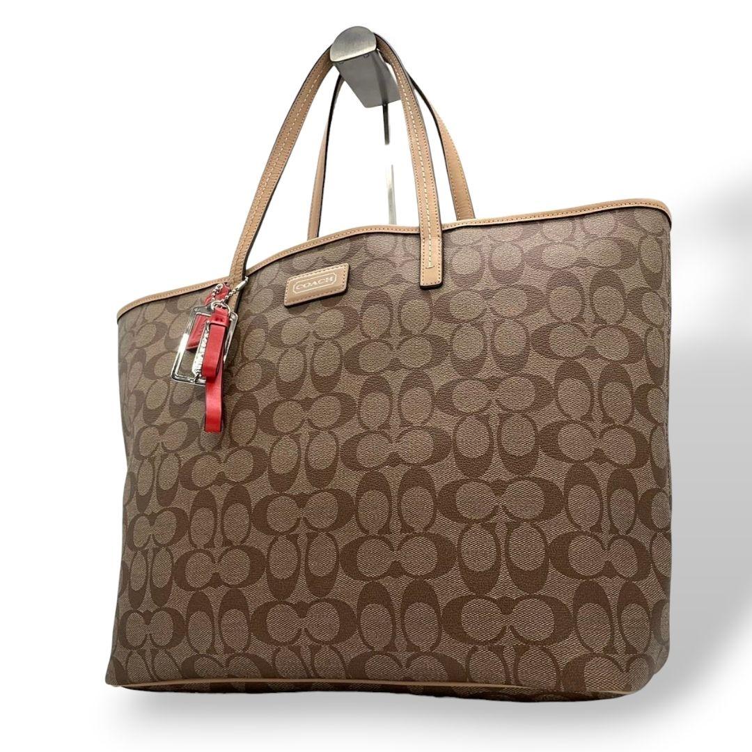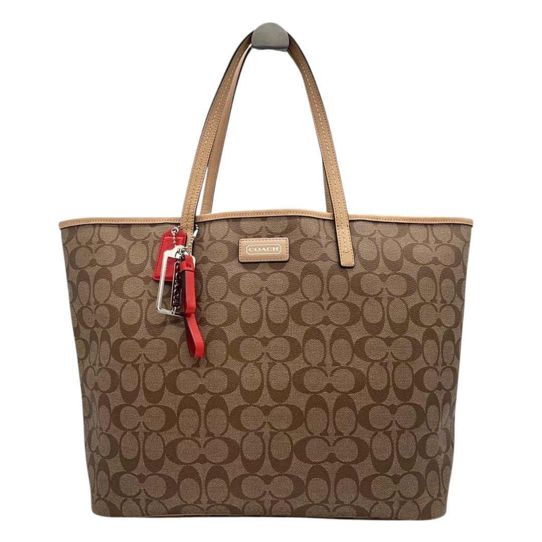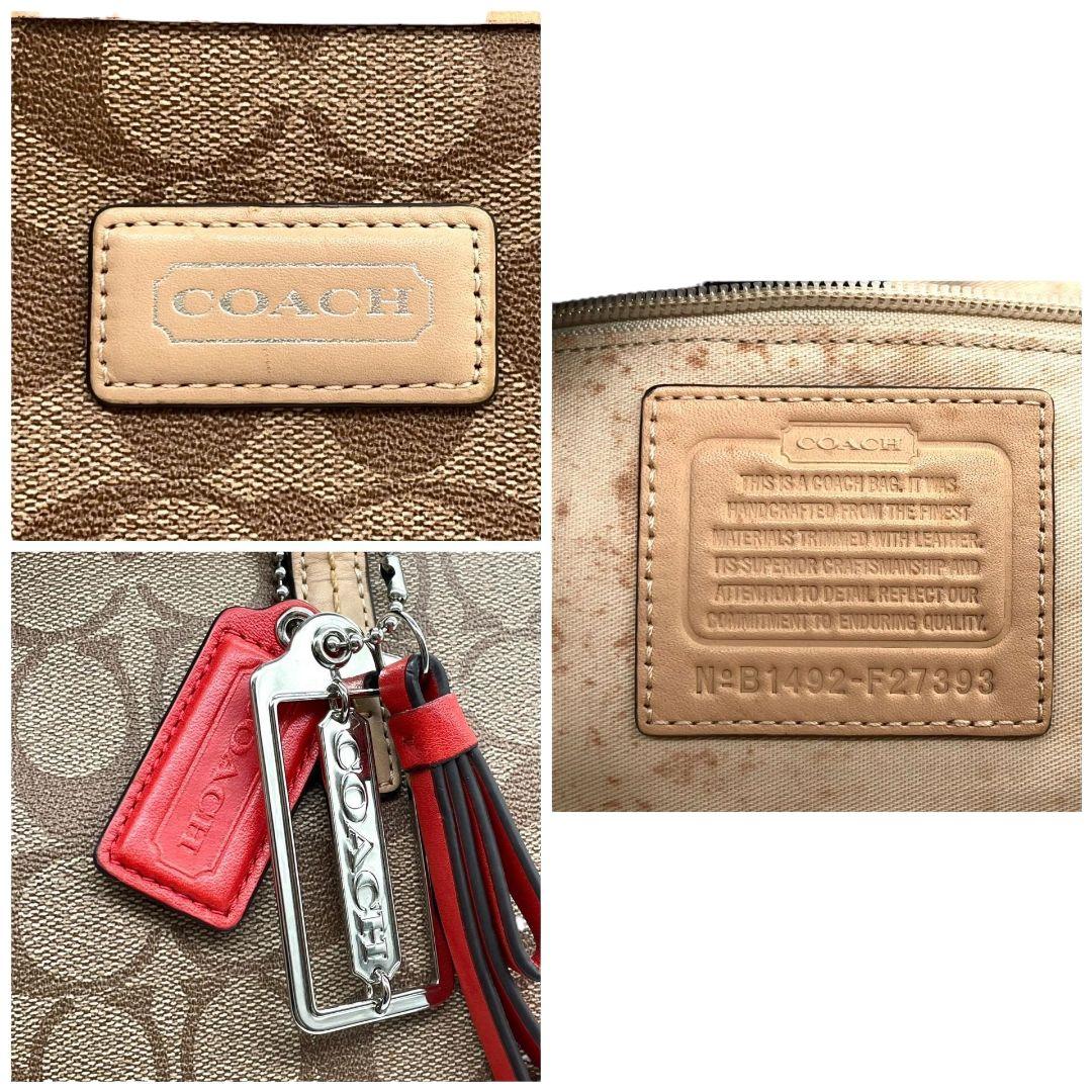 美品 コーチ トートバッグ 茶 シグネチャー ワンショルダー チャーム付き レザー T6 ハンドバッグ 肩掛け可 肩かけ可 PVC 本革 ブラウン ロゴプレート F27393