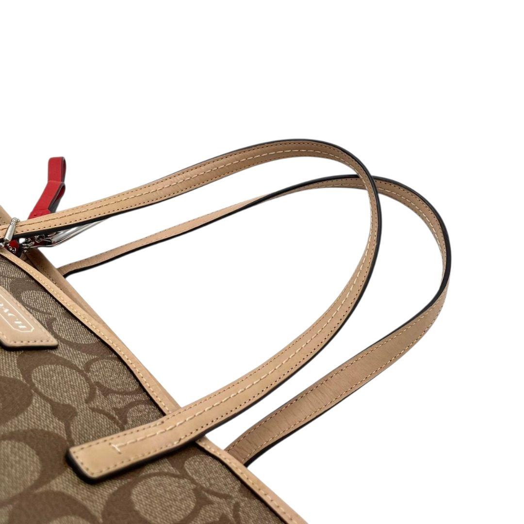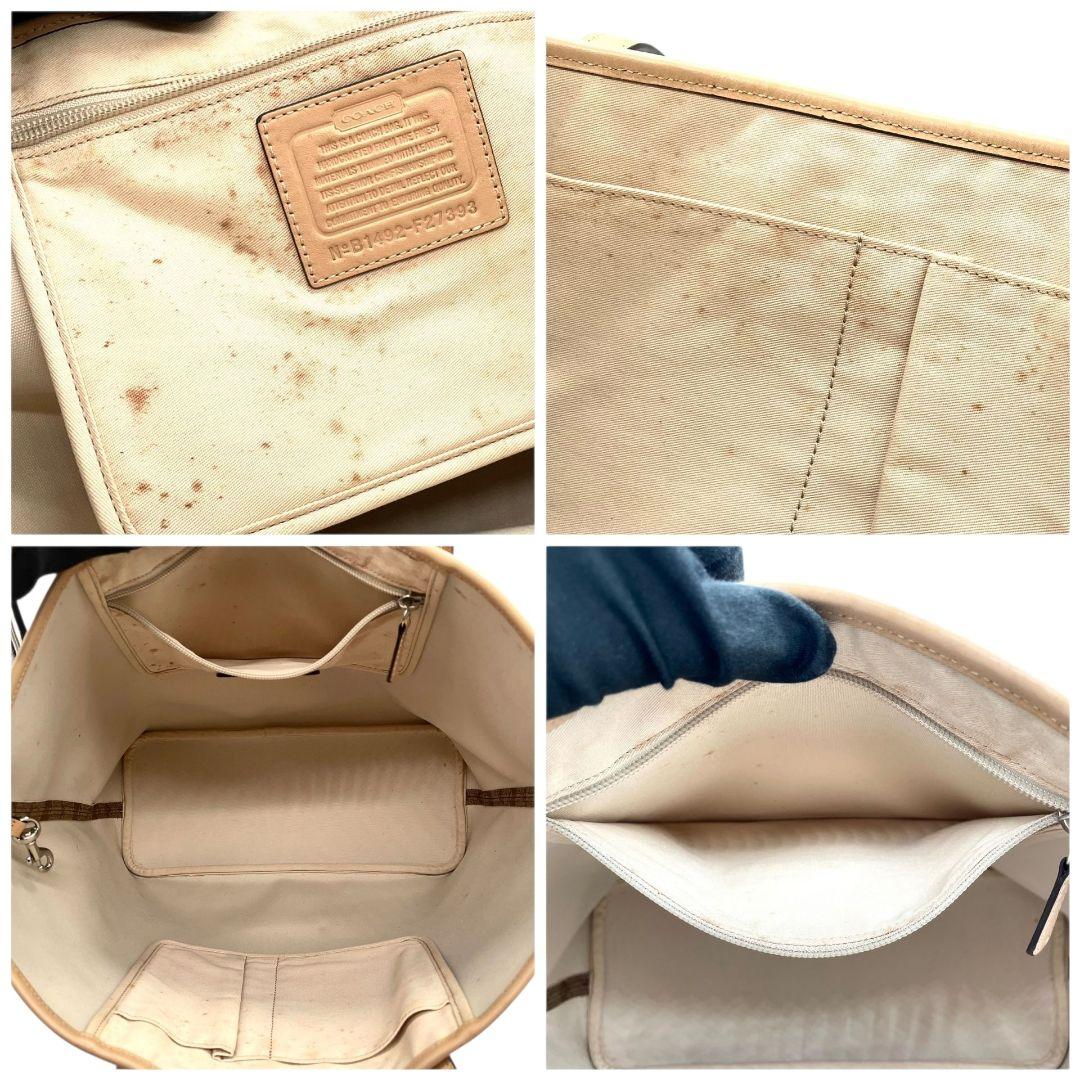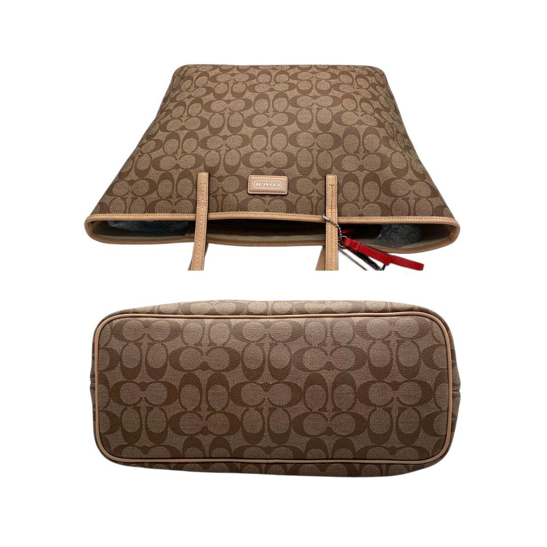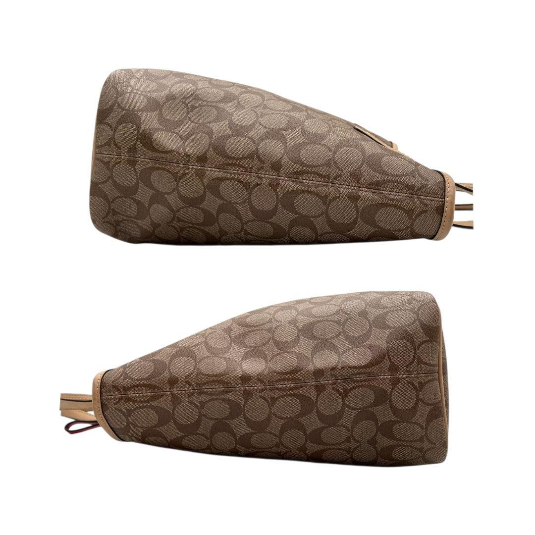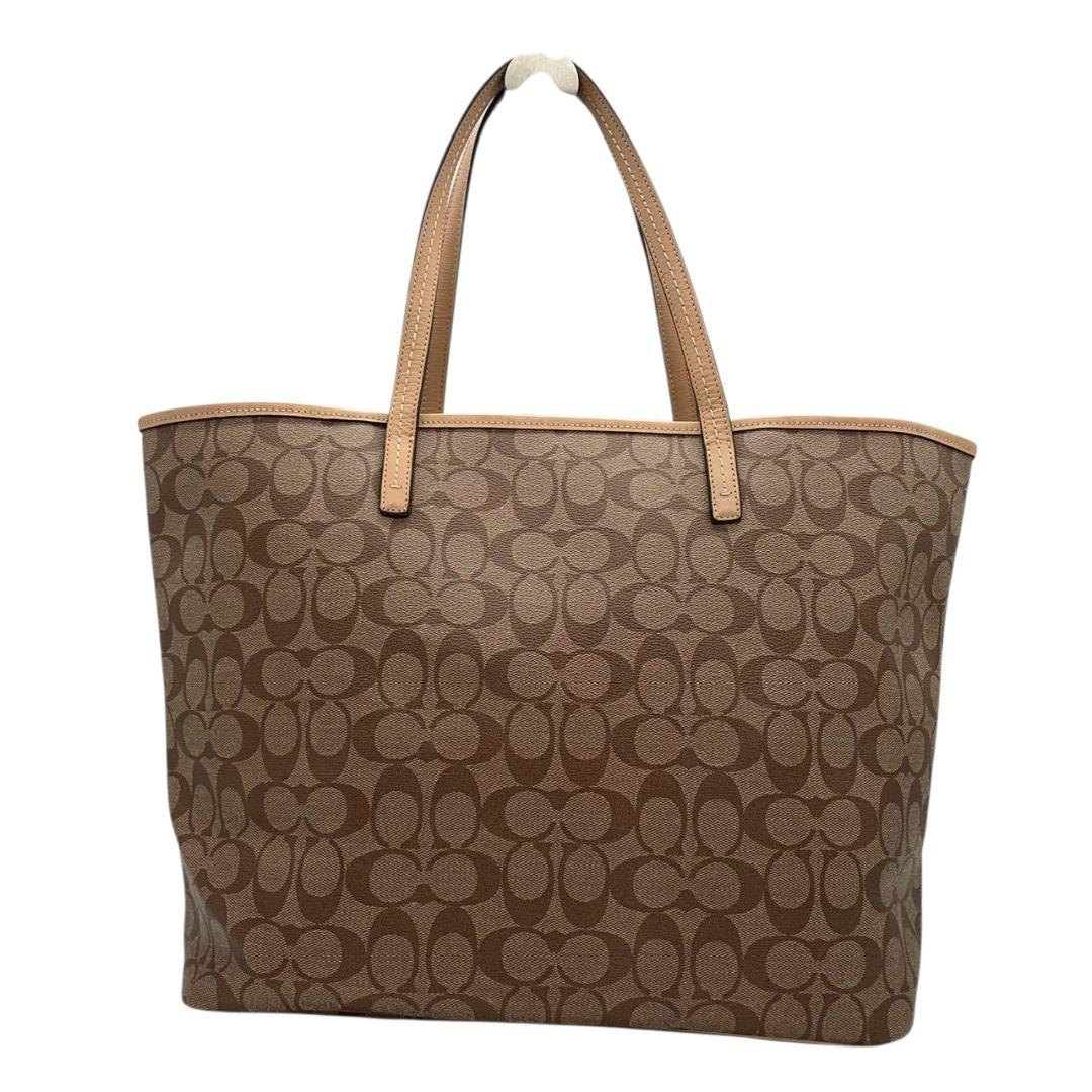 美品 コーチ トートバッグ 茶 シグネチャー ワンショルダー チャーム付き レザー T6 ハンドバッグ 肩掛け可 肩かけ可 PVC 本革 ブラウン ロゴプレート F27393