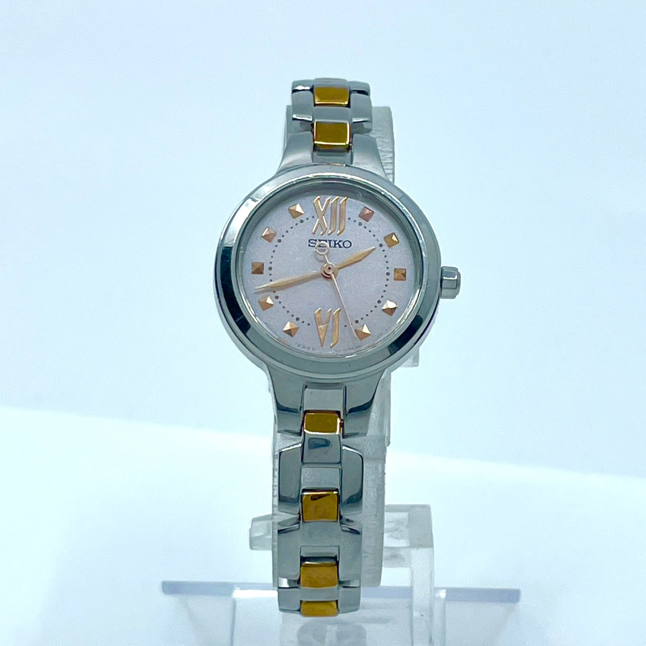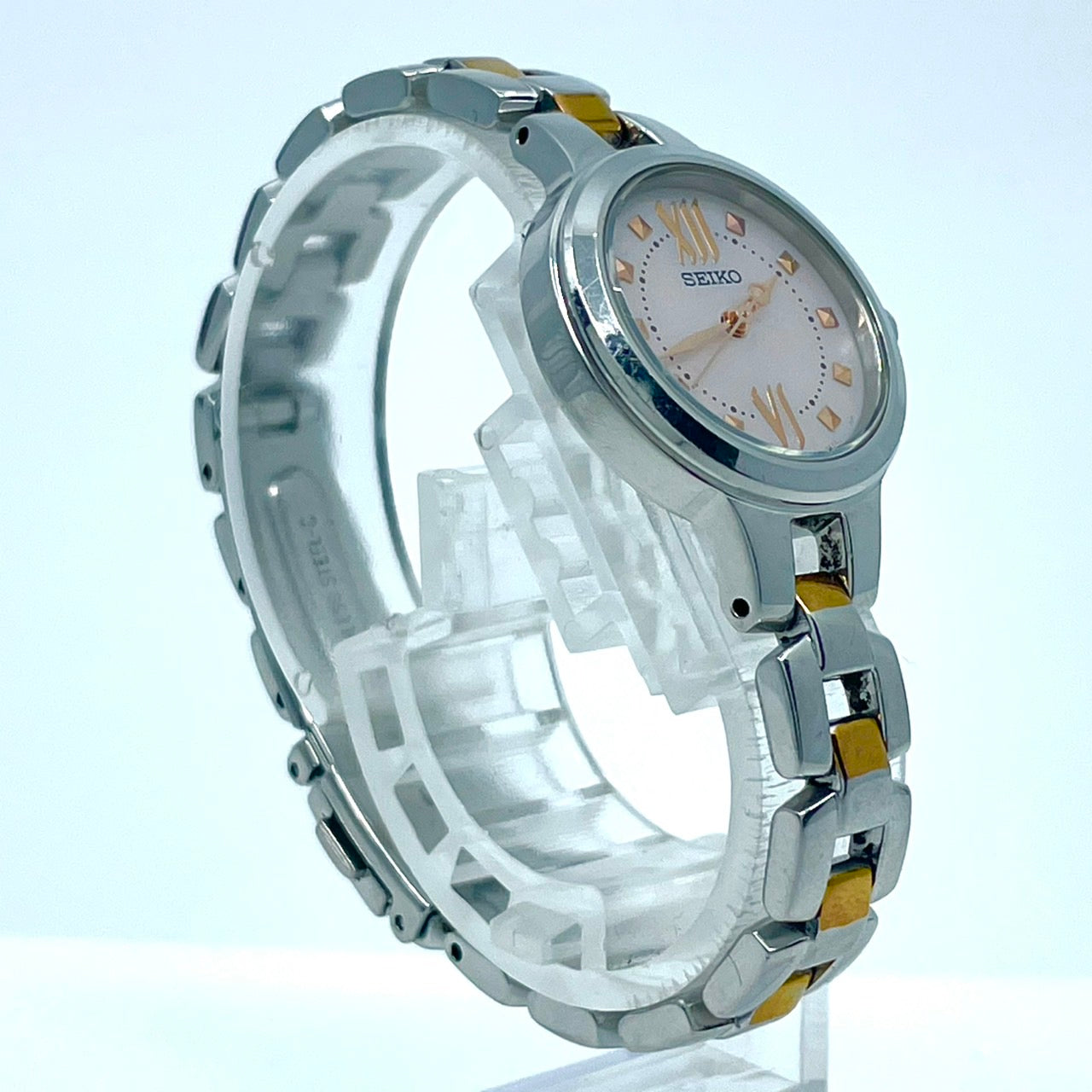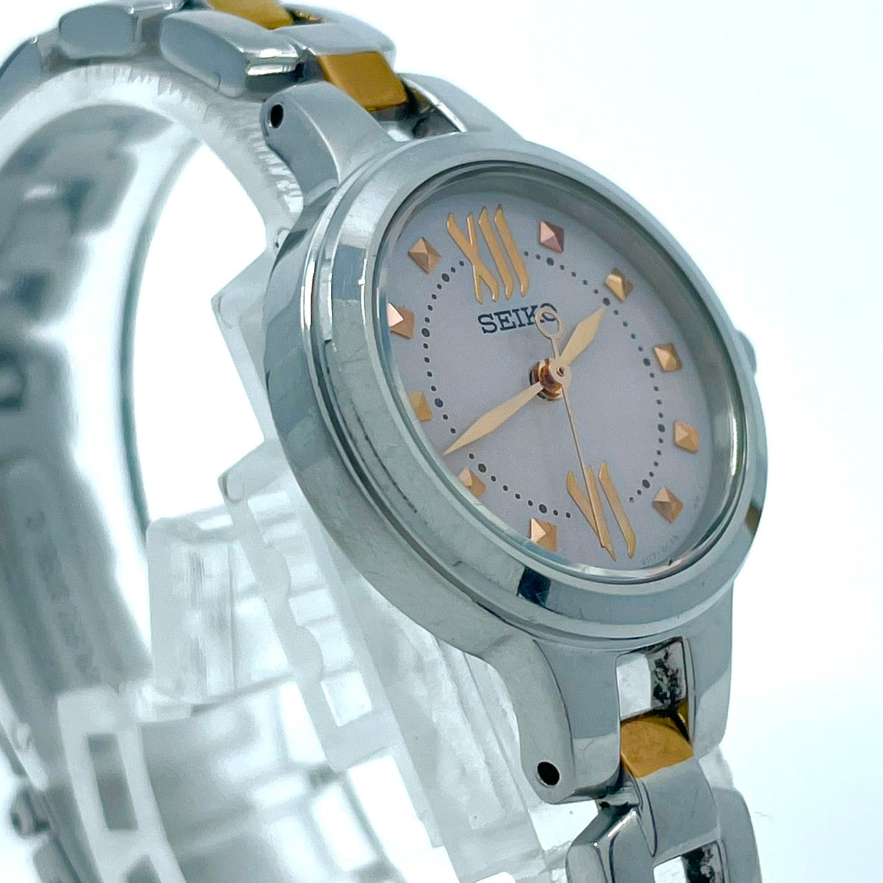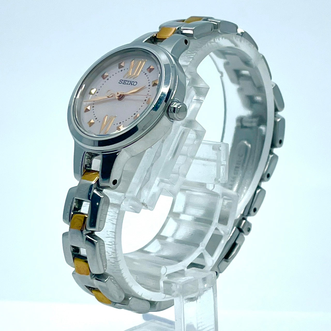 【稼働/美品】セイコー 腕時計 V117-0BH0 レディース ソーラー シルバー ピンク文字盤 ゴールドアクセント コンビ ラウンド ステンレス エレガント ドレスウォッチ クラシック ビジネス オフィス ファッションウォッチ クリーニング済 G6