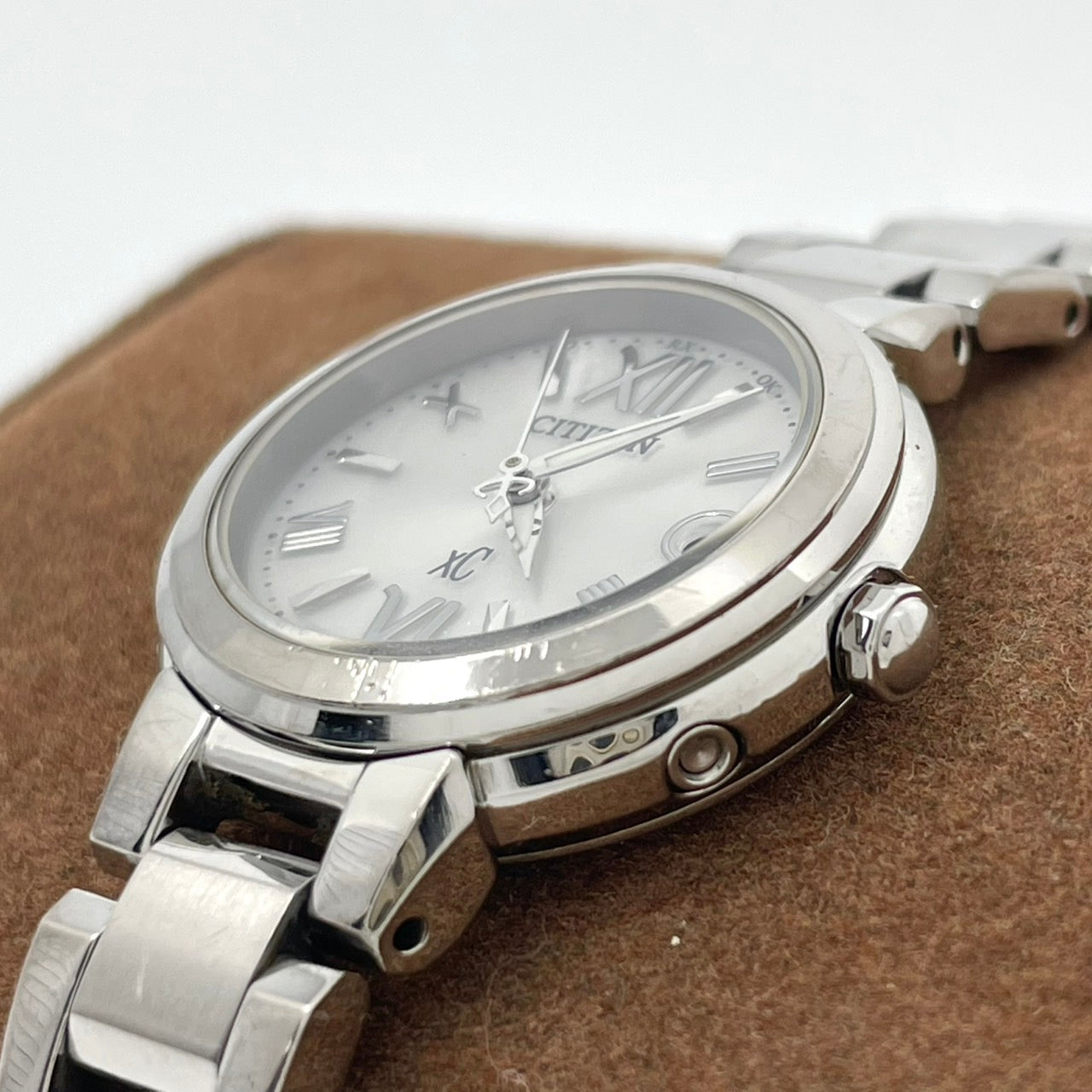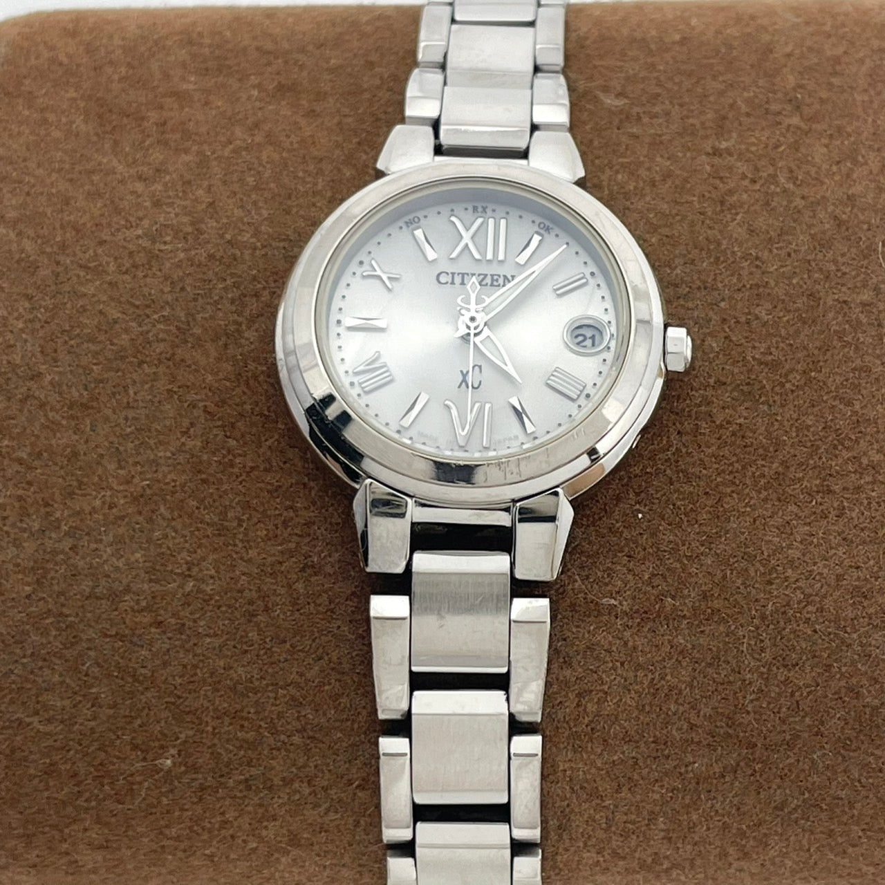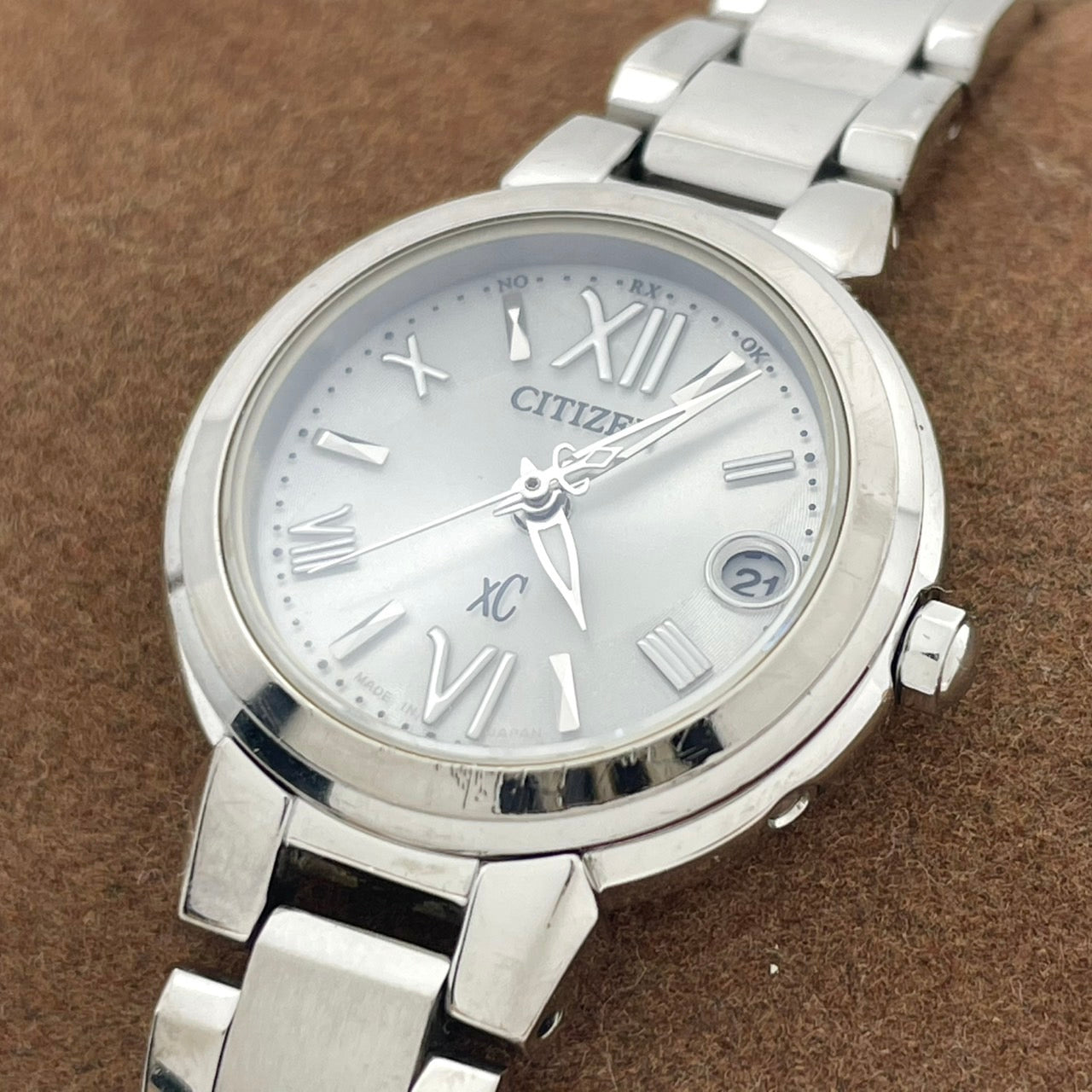 【稼働/美品】シチズン XC クロスシー 腕時計 H058-T016545 レディース エコドライブ ソーラー電波 シルバー文字盤 デイト表示 ラウンド ローマ数字インデックス エレガント クラシック ビジネス ファッションウォッチ クリーニング済 G6