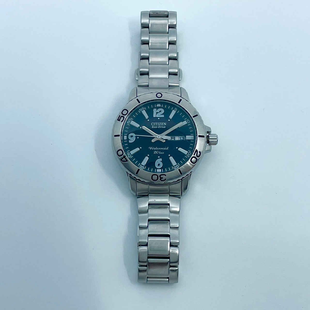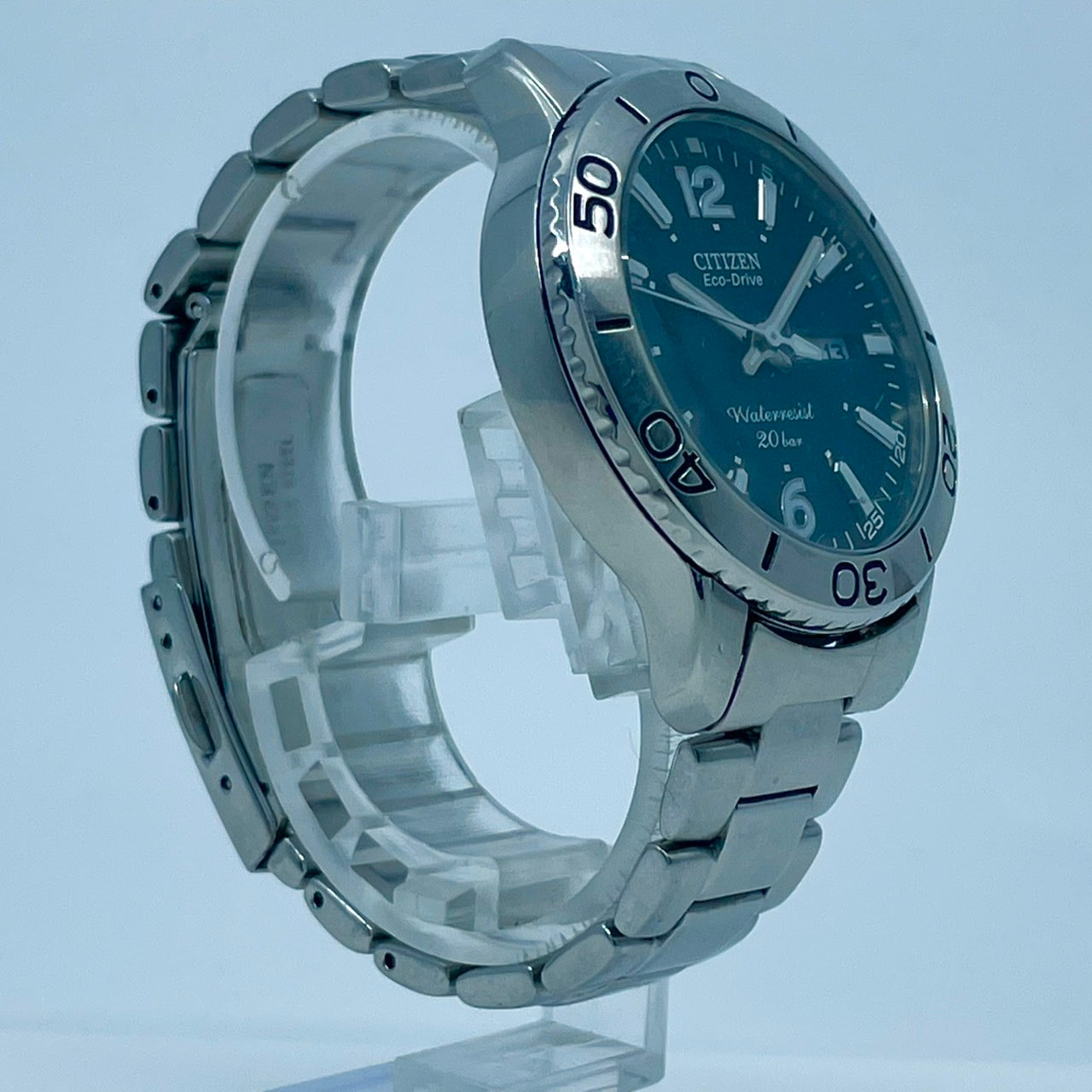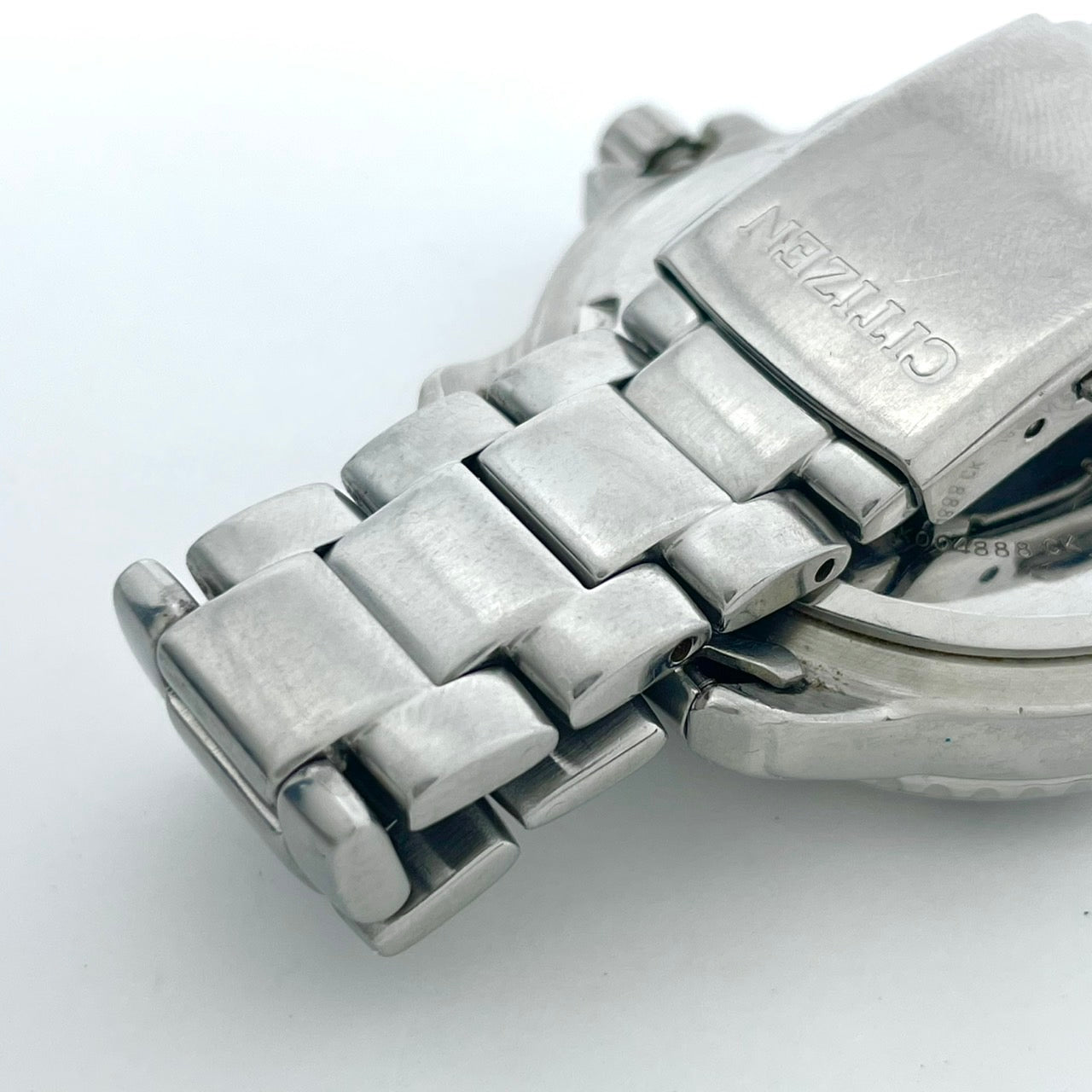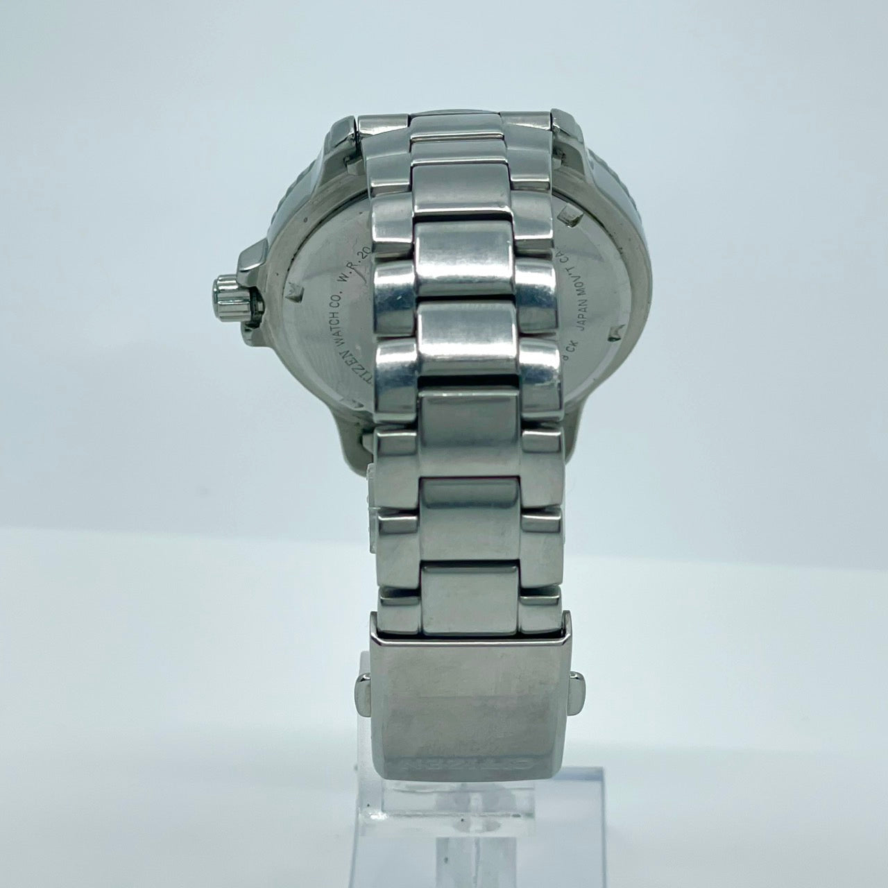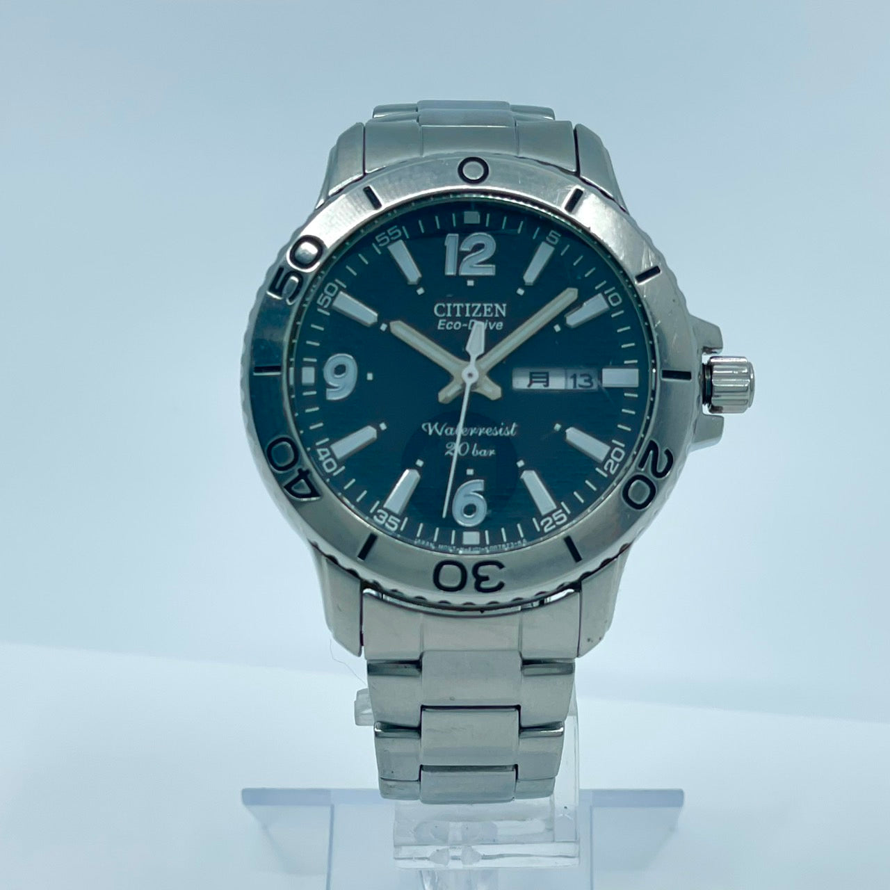 【稼働/美品】シチズン エコドライブ 腕時計 E101-K004888 メンズ ブラック文字盤 ソーラー デイデイト 20気圧防水 アナログ ラウンド シルバー ステンレス ビジネス カジュアル スポーティー アウトドアウォッチ クリーニング済 G6