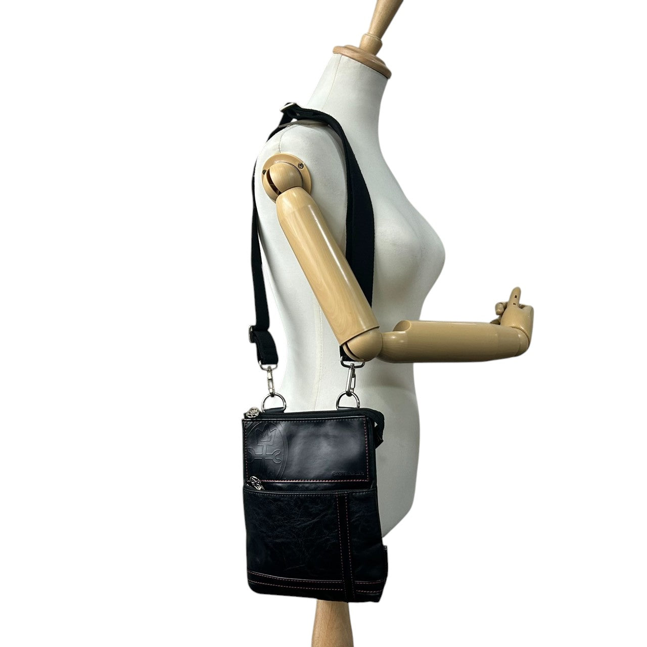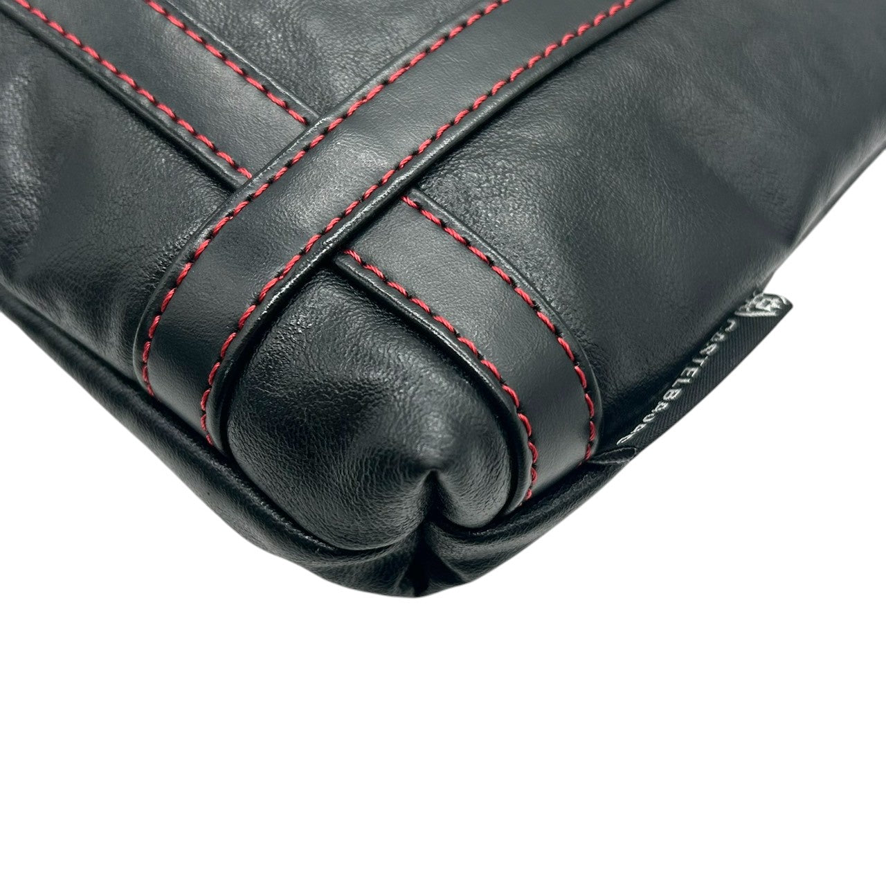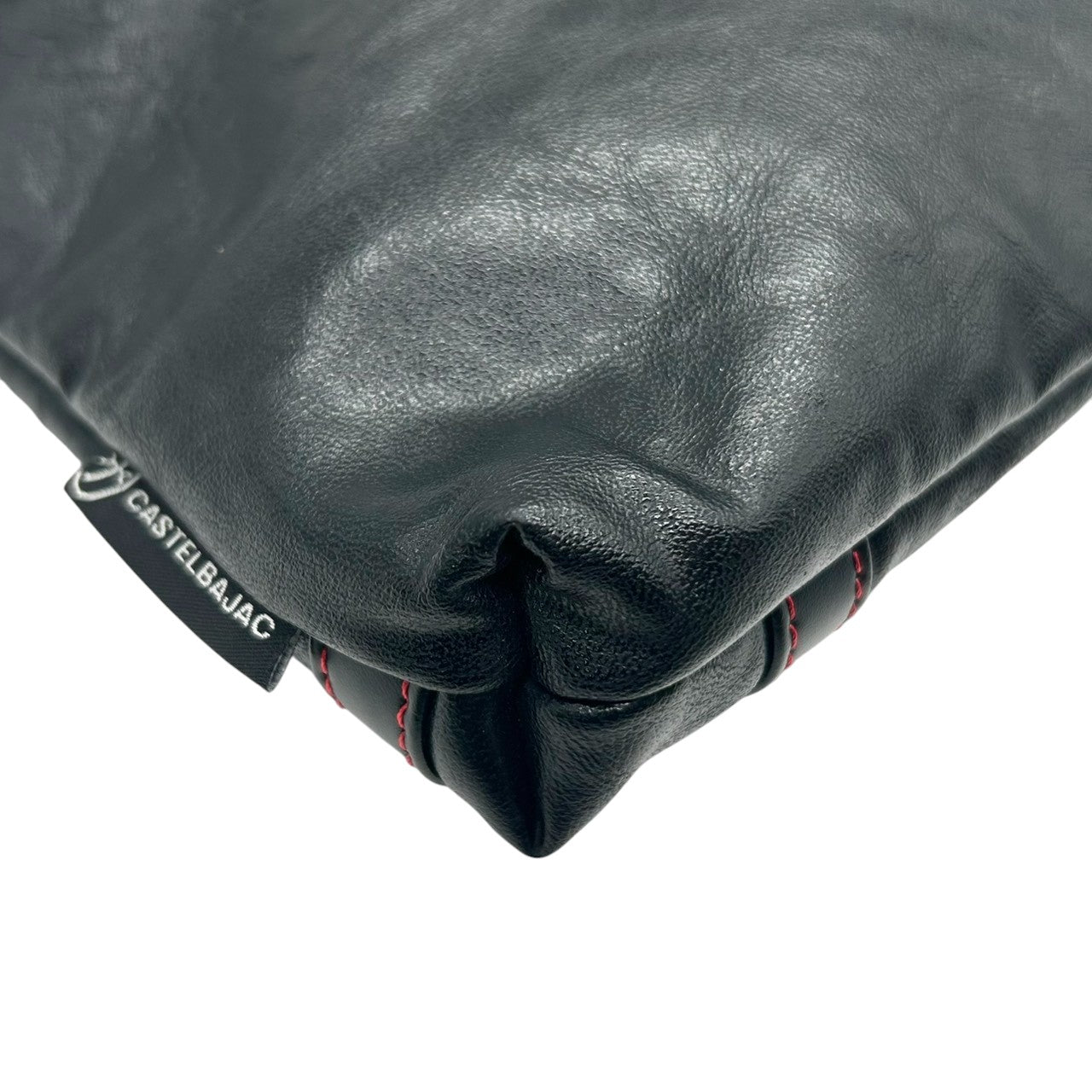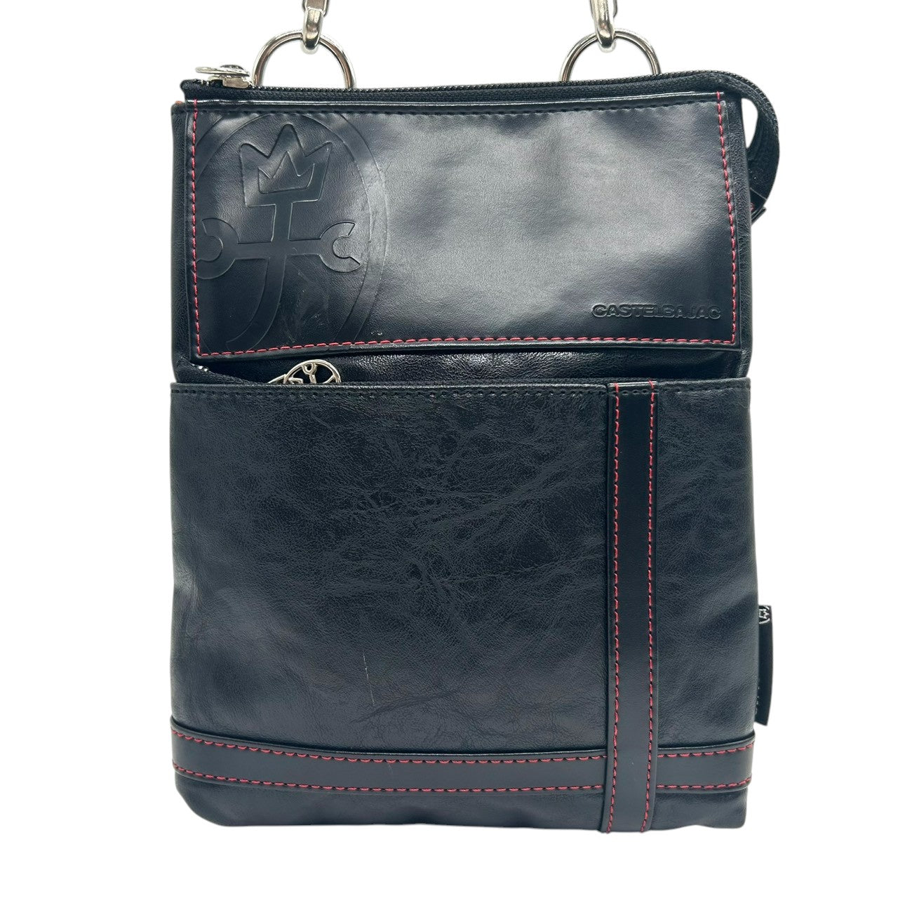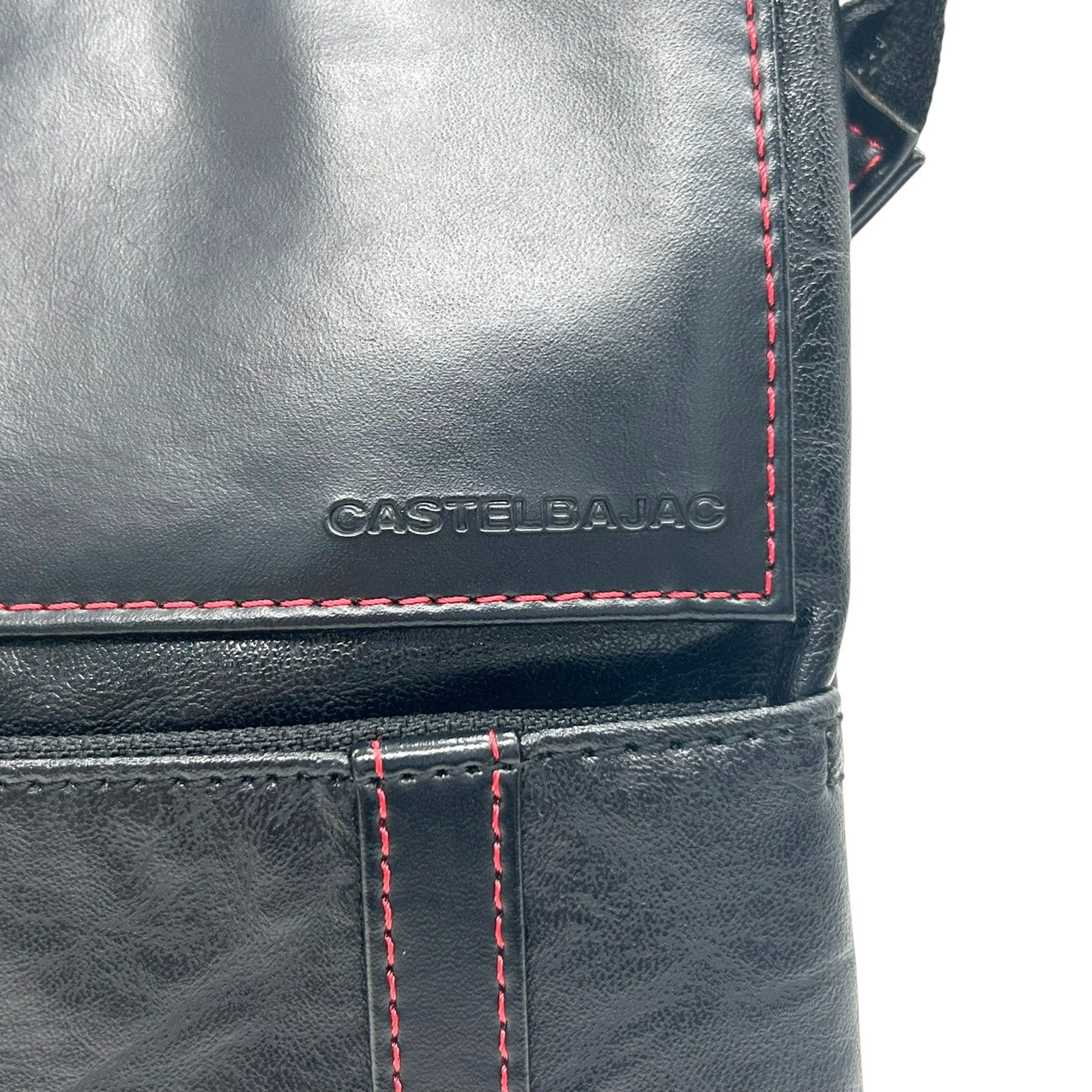 【美品】カステルバジャック ショルダーバッグ ポシェット レザー 本革 ブラック レッドステッチ ロゴ 型押し メンズ レディース ユニセックス 斜め掛け可 コンパクト 軽量 ミニショルダー カジュアル クリーニング済み 61153 U8