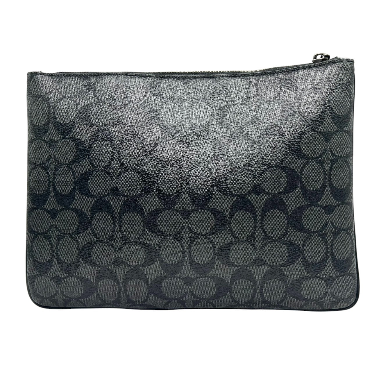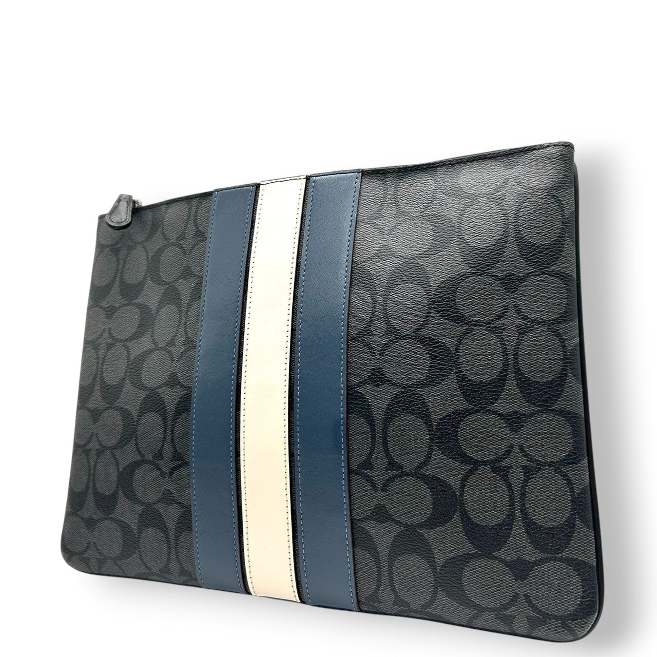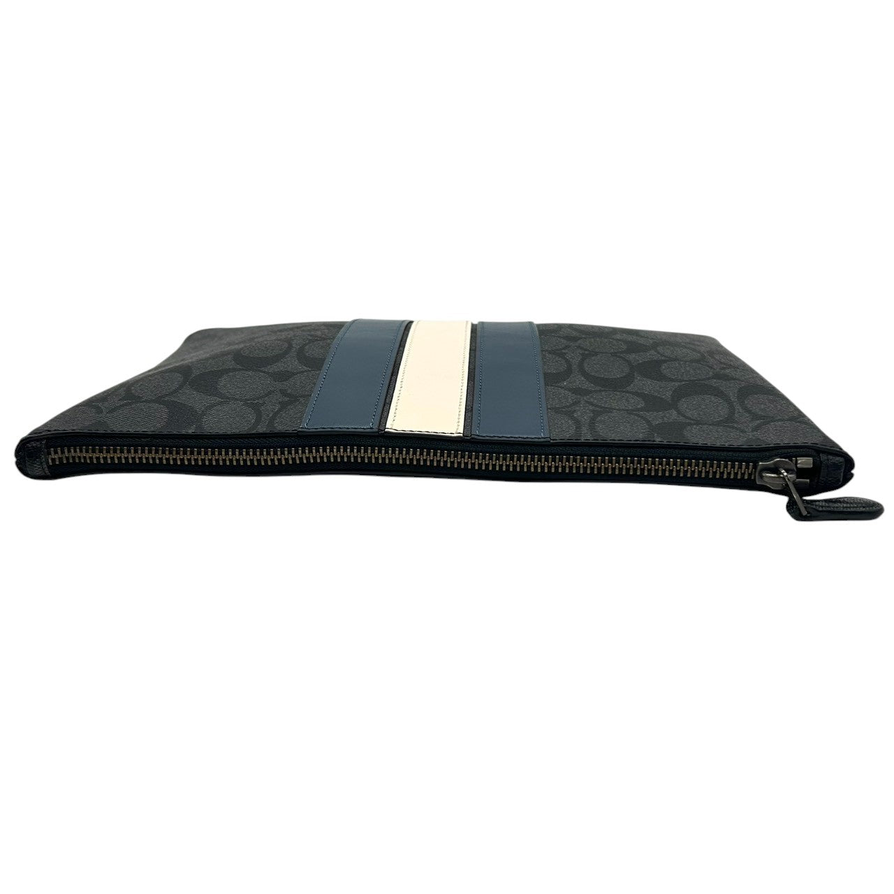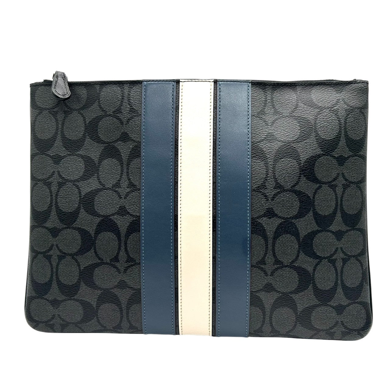 【美品】コーチ クラッチバッグ F25071 シグネチャー ストライプ PVC レザー ブラック ブルー セカンドバッグ A4収納可 薄型 メンズ レディース ユニセックス ビジネス カジュアル バッグインバッグ クリーニング済み U4