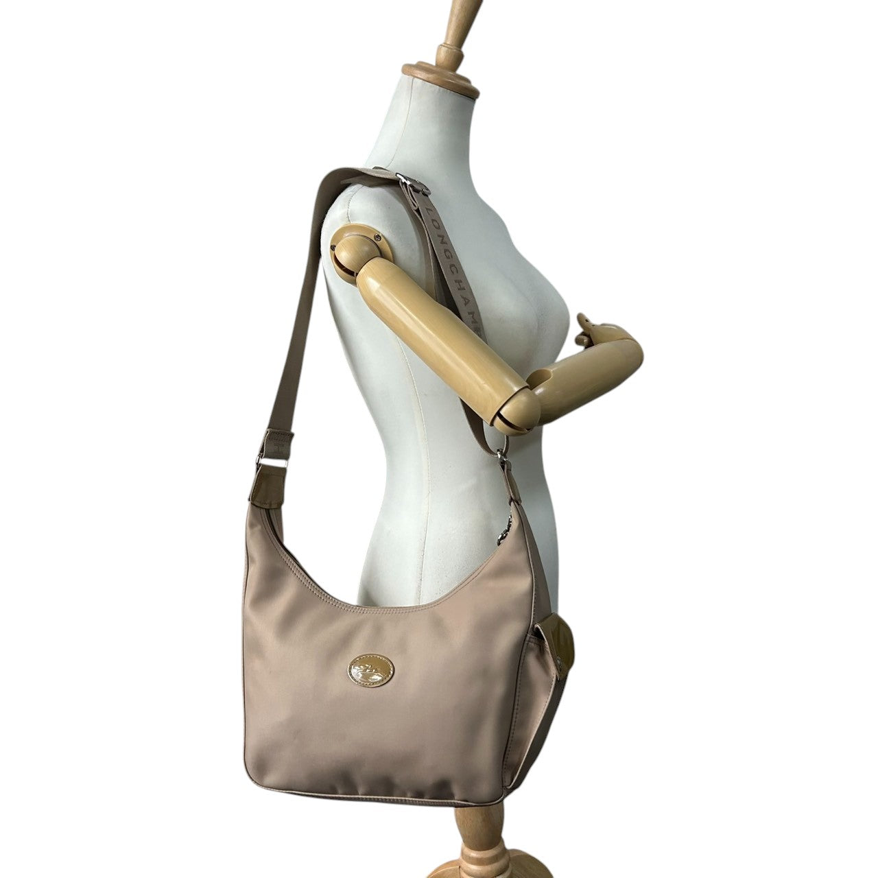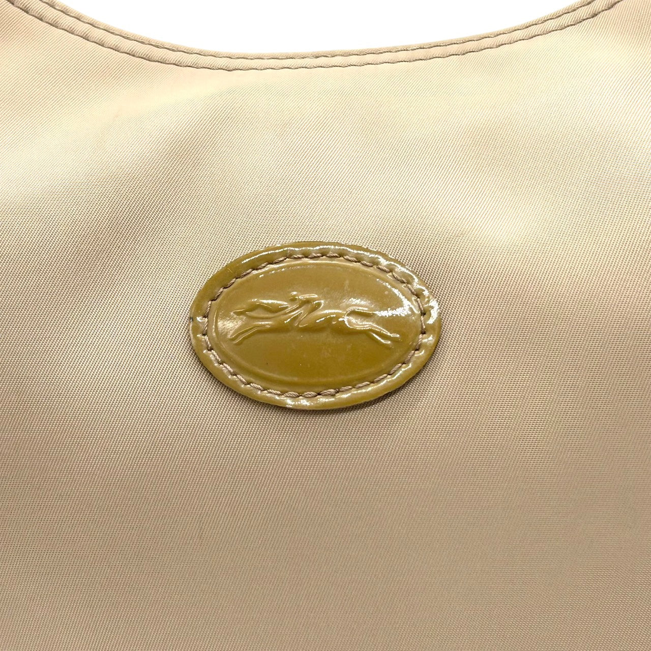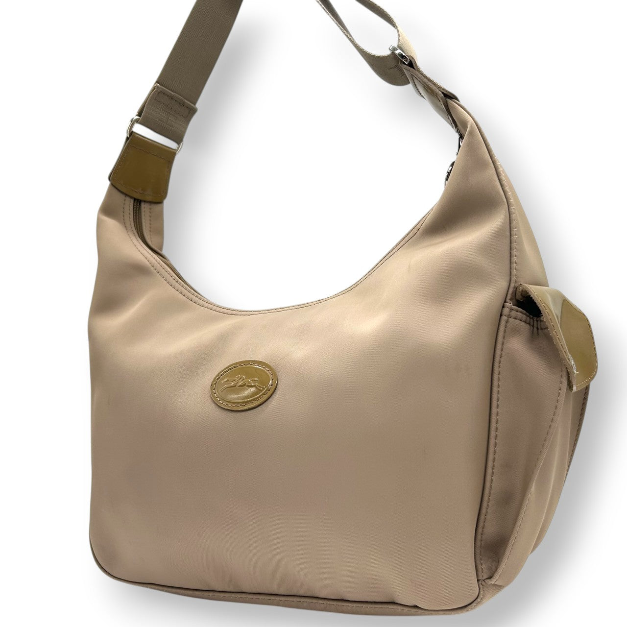 ロンシャン ショルダーバッグ ナイロン パテントレザー ベージュ ホーボーバッグ 斜め掛け可 A4収納可 大容量 レディース 軽量 機能的 カジュアル エレガント シンプルデザイン 通勤 通学 デイリーユース ロゴプレート クリーニング済み s87