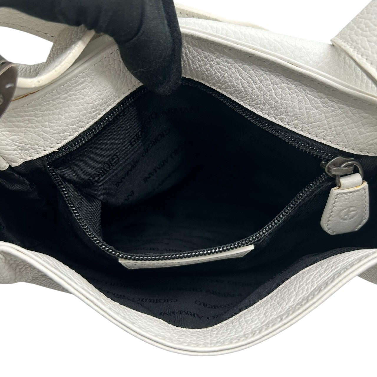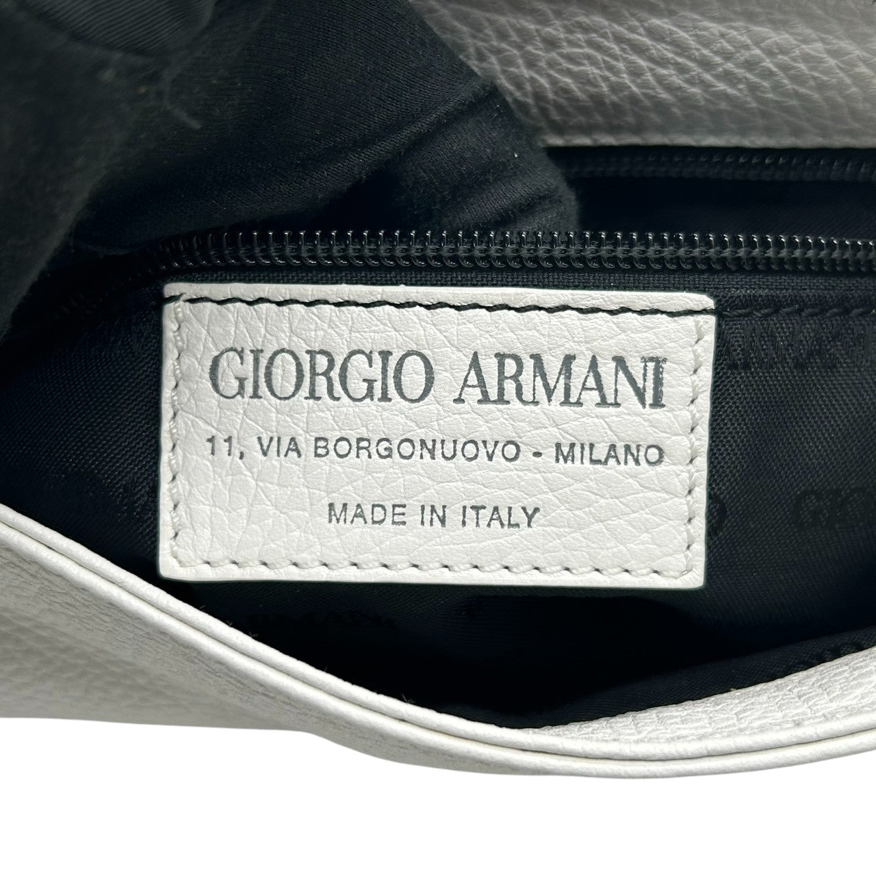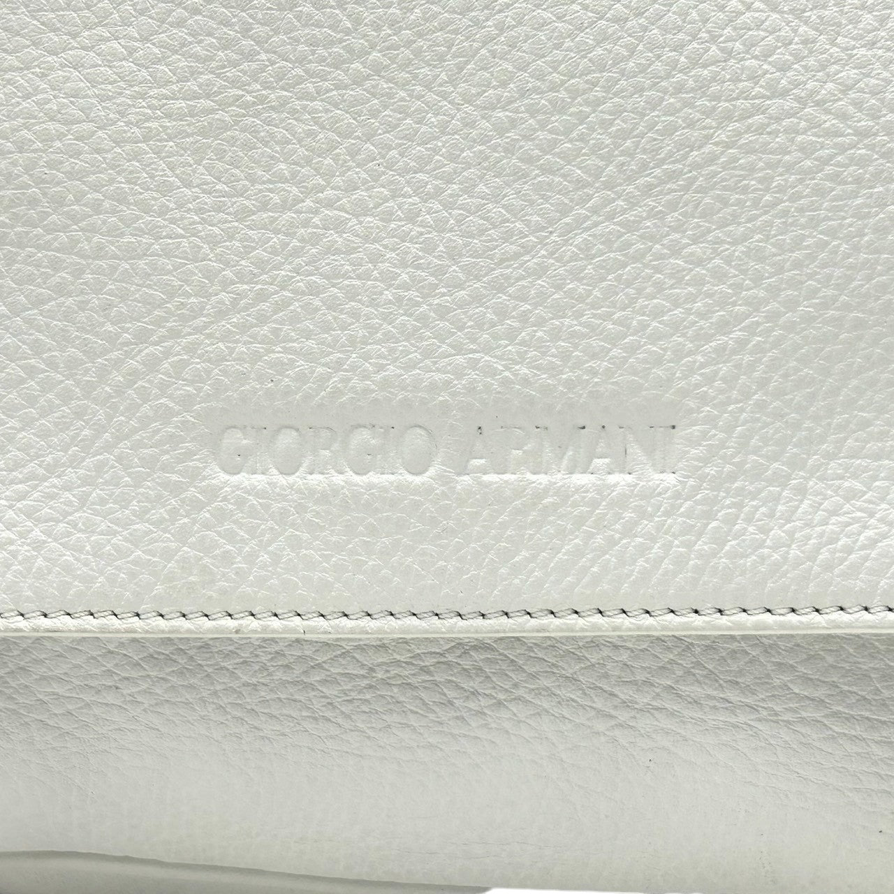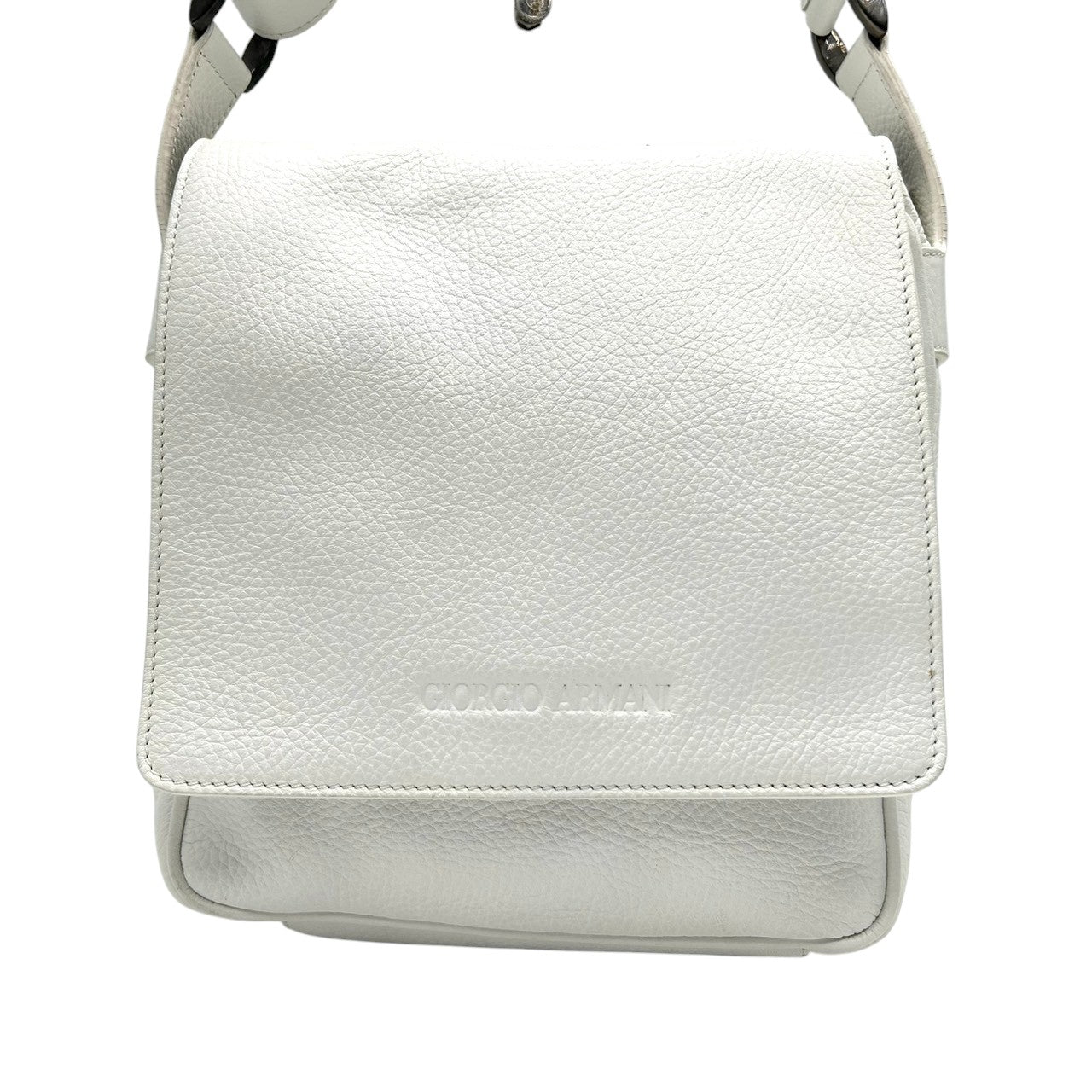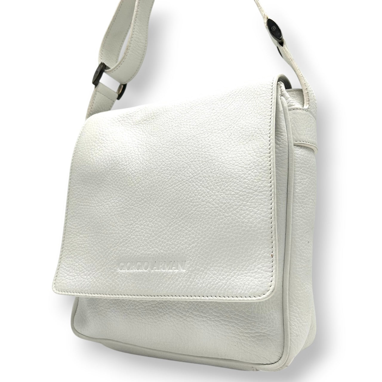 ジョルジオアルマーニ ショルダーバッグ レザー 本革 ホワイト フラップ 斜め掛け可 A4収納可 メンズ レディース ユニセックス メッセンジャーバッグ ビジネス カジュアル ロゴ型押し 上質シボ革 イタリア製 高級 クリーニング済み s81