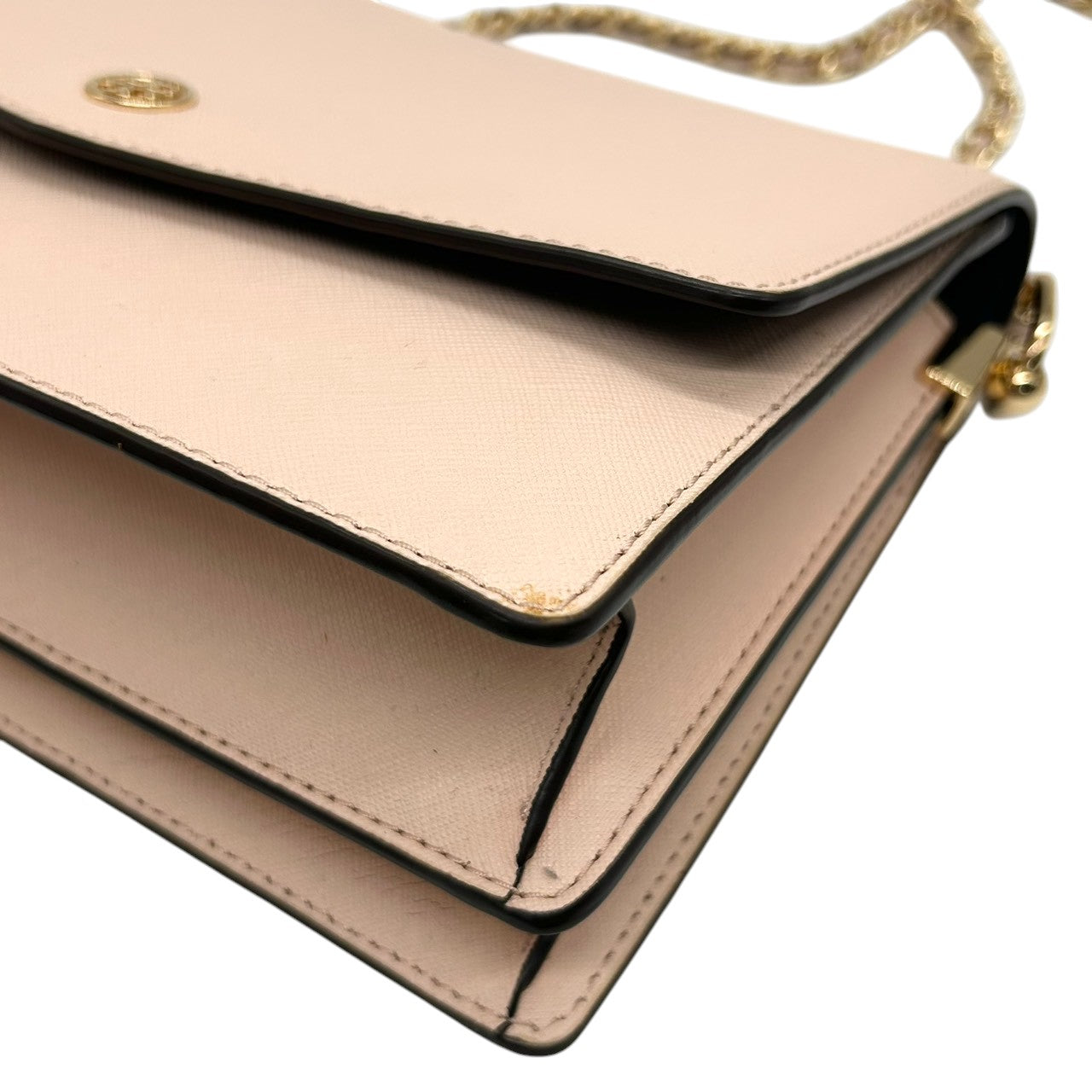 【美品】トリーバーチ チェーンショルダーバッグ PVCレザー ピンク ブラック バイカラー 斜め掛け可 ウォレットバッグ フラップ レディース パーティー エレガント フェミニン ゴールドチェーン ロゴプレート クリーニング済み 自立可 s81