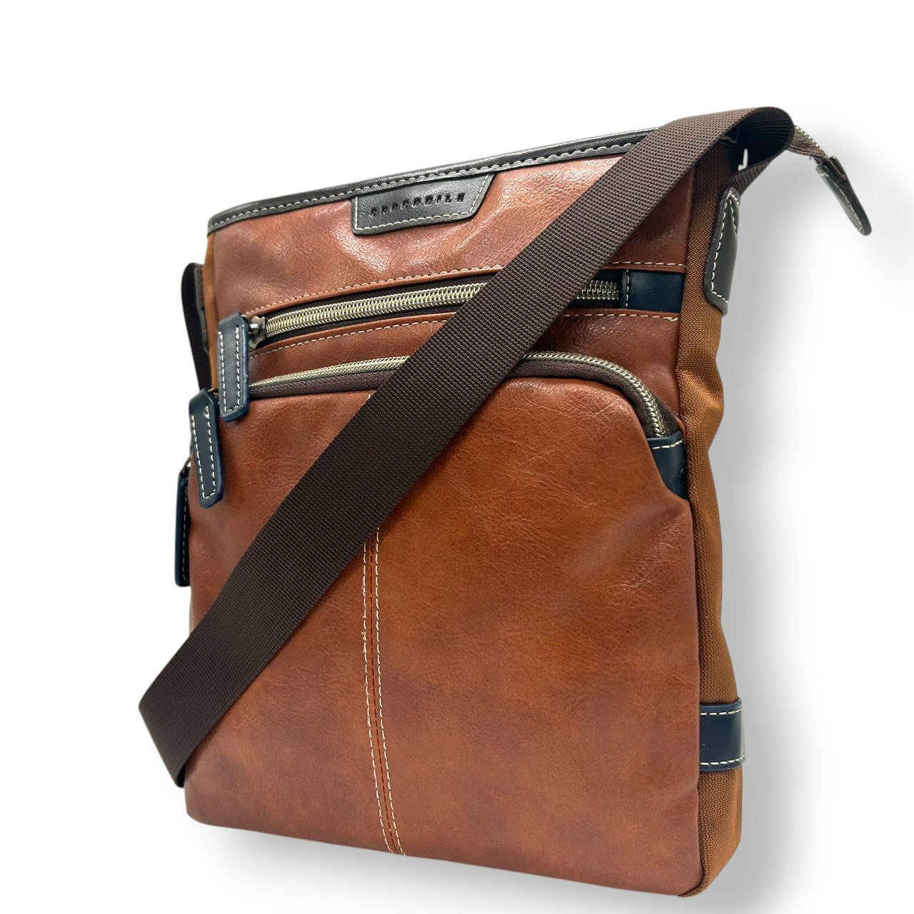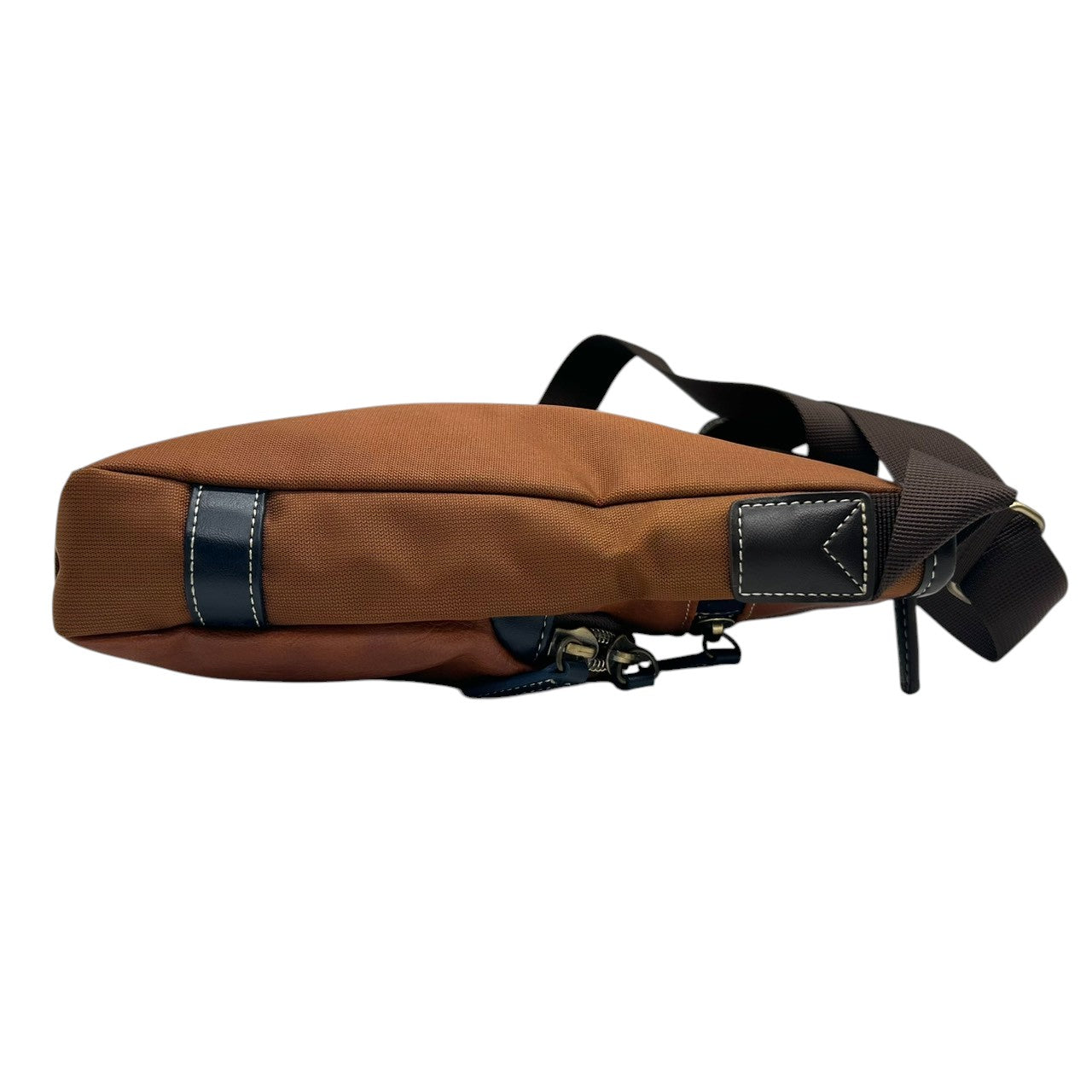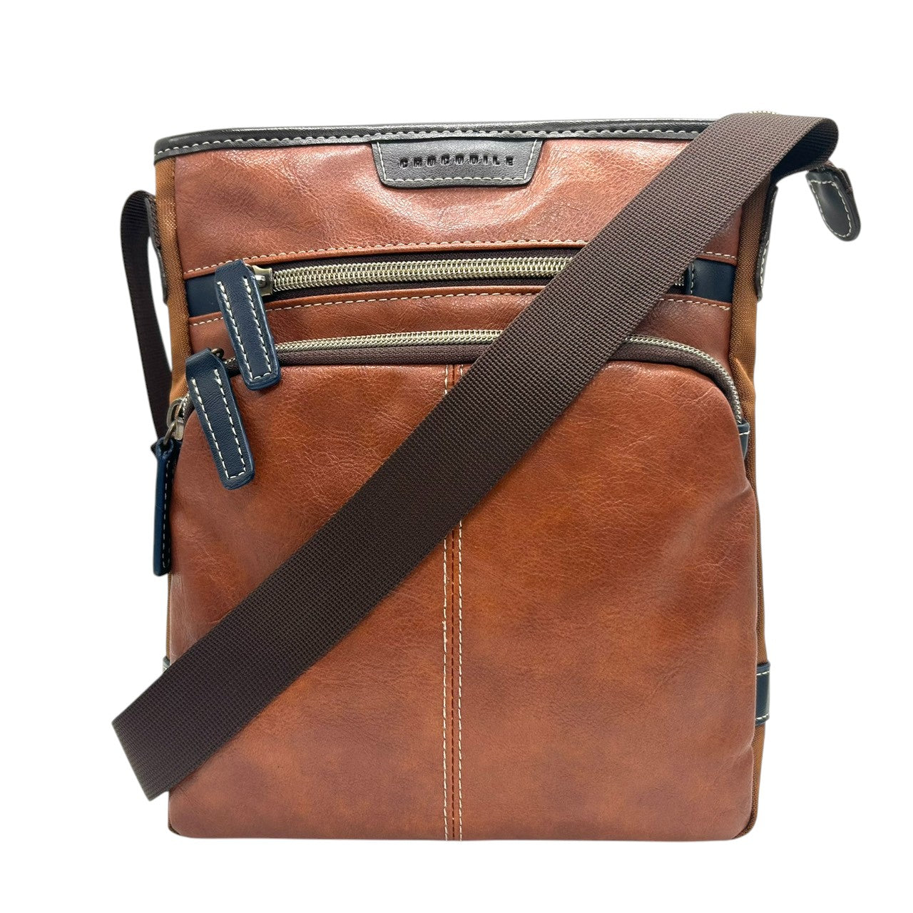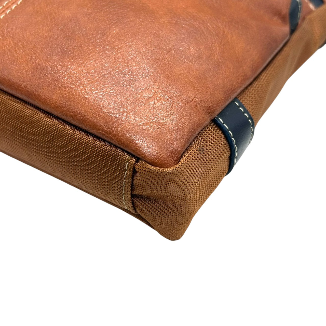【美品】 ショルダーバッグ バイカラー レザー ブラウン ネイビー ロゴ メンズ 斜め掛け可 カジュアル ビジネス A4収納可 軽量 多機能 ファスナーポケット豊富 通勤 通学 旅行 タウンユース 万能デザイン クリーニング済み U8