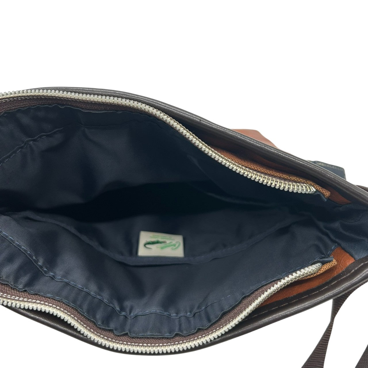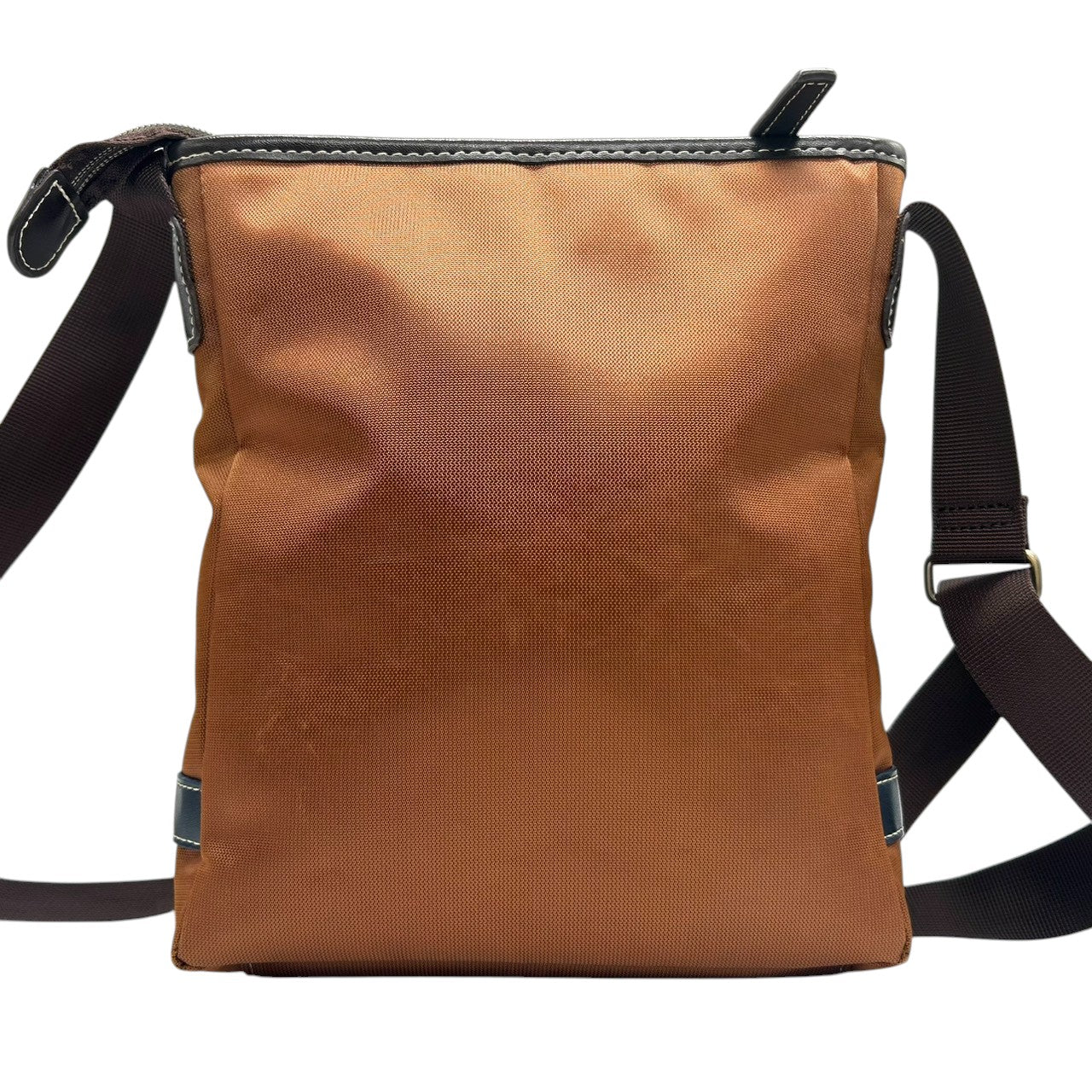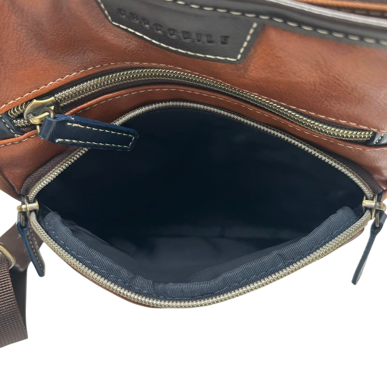 【美品】 ショルダーバッグ バイカラー レザー ブラウン ネイビー ロゴ メンズ 斜め掛け可 カジュアル ビジネス A4収納可 軽量 多機能 ファスナーポケット豊富 通勤 通学 旅行 タウンユース 万能デザイン クリーニング済み U8