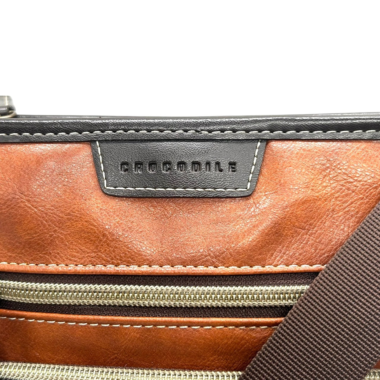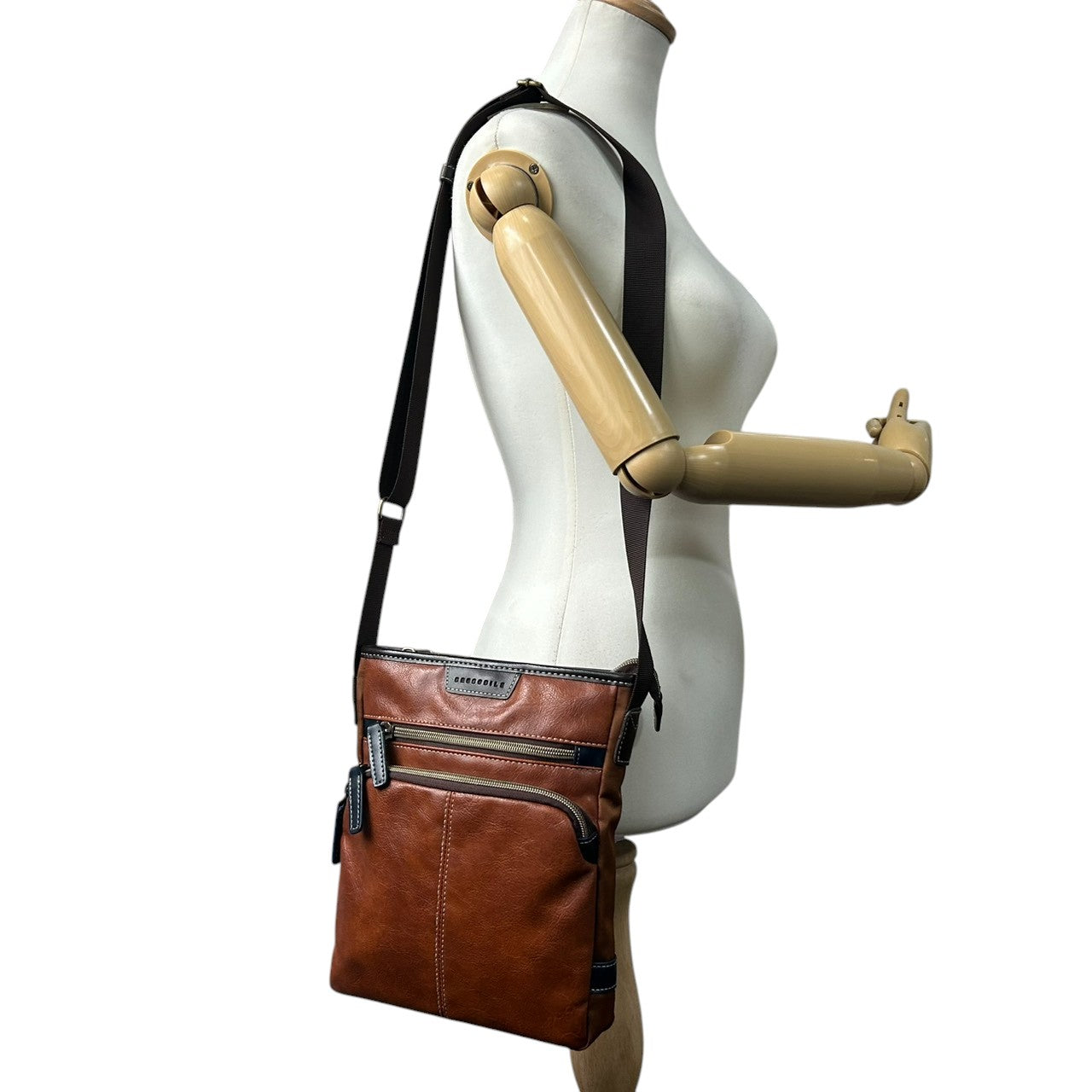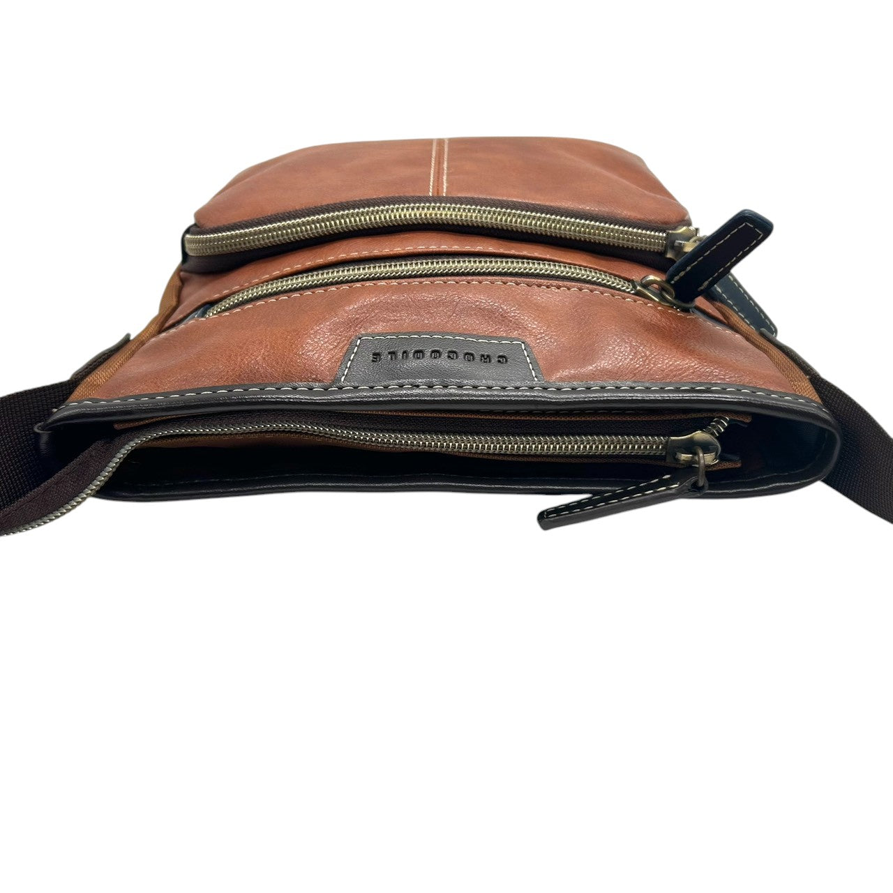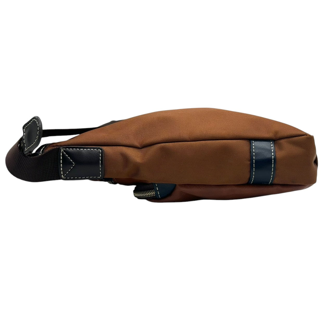 【美品】 ショルダーバッグ バイカラー レザー ブラウン ネイビー ロゴ メンズ 斜め掛け可 カジュアル ビジネス A4収納可 軽量 多機能 ファスナーポケット豊富 通勤 通学 旅行 タウンユース 万能デザイン クリーニング済み U8