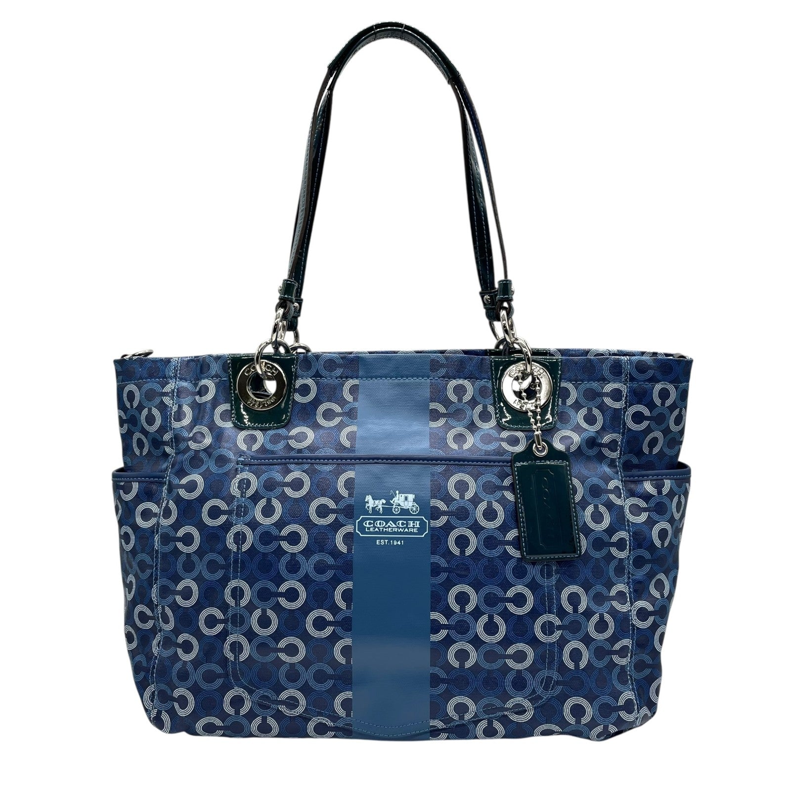 美品 コーチ COACH トートバッグ ショルダーバッグ 2WAY シグネチャー サークル柄 紺 ネイビー A4収納可 ショルダーストラップ付 U10