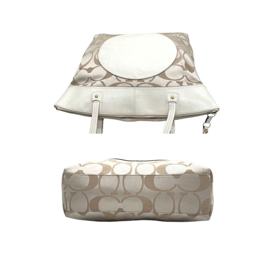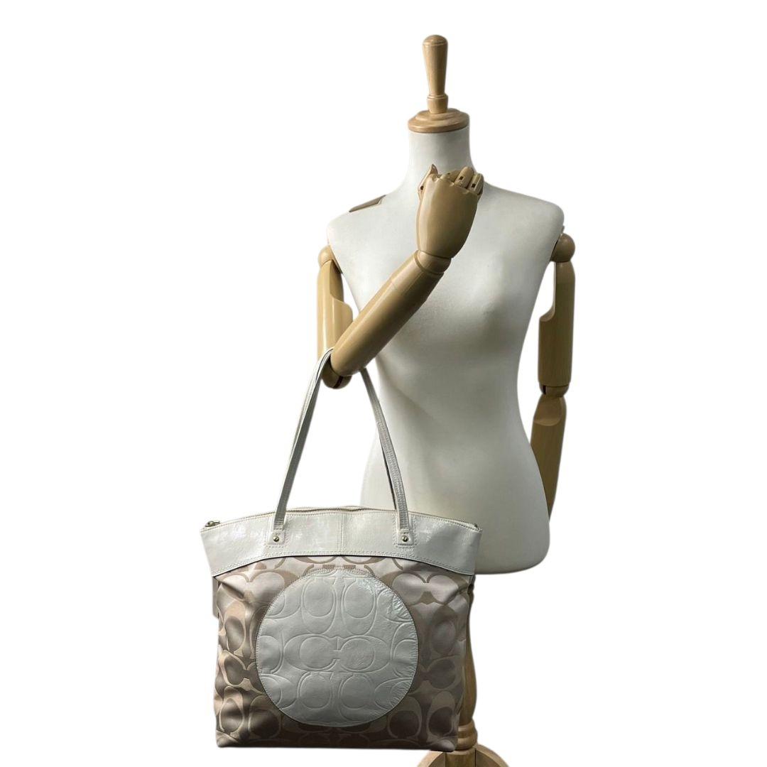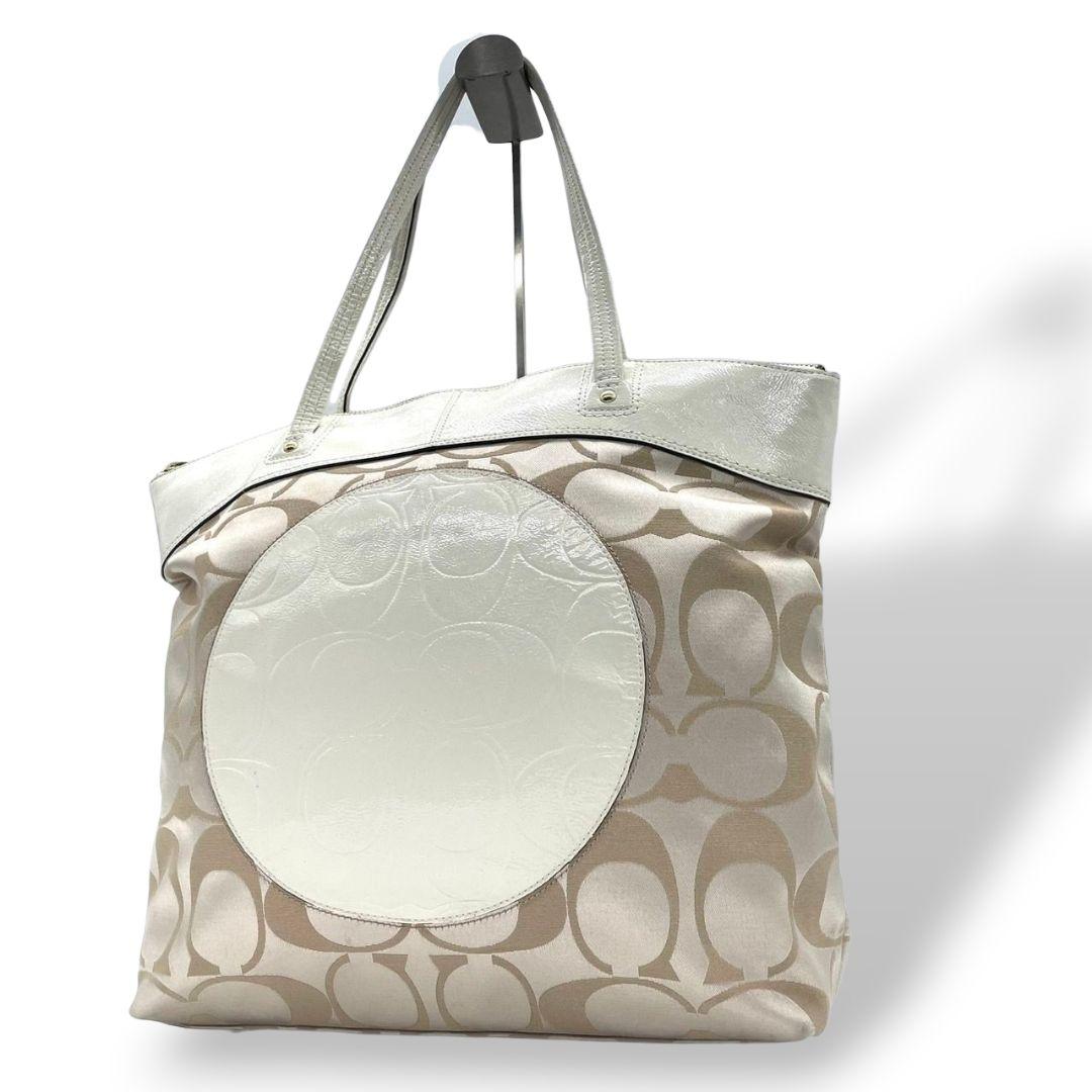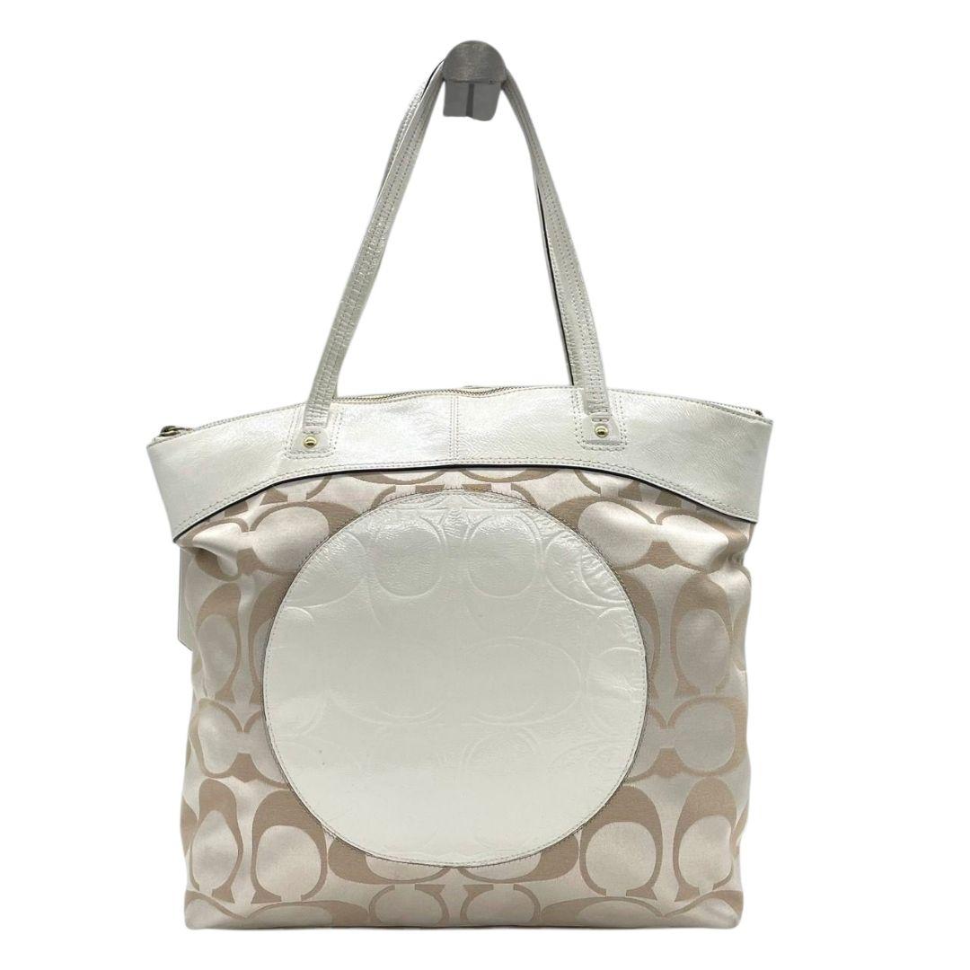コーチ トートバッグ 白 シグネチャー ワンショルダー キャンバス s14 ハンドバッグ 肩掛け可 A4収納 本革 アイボリー パテントレザー ゴールド金具 F18335
