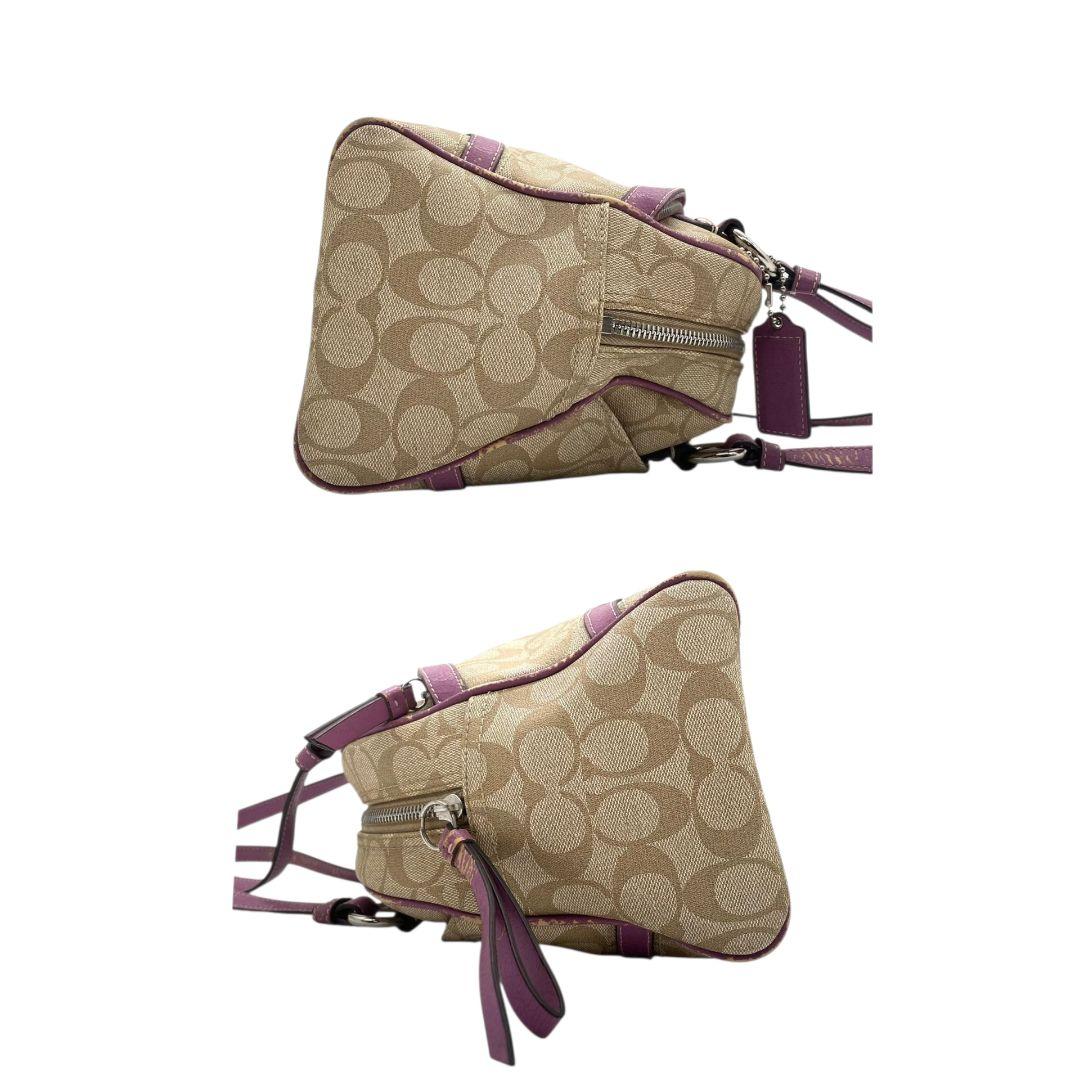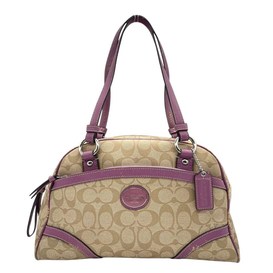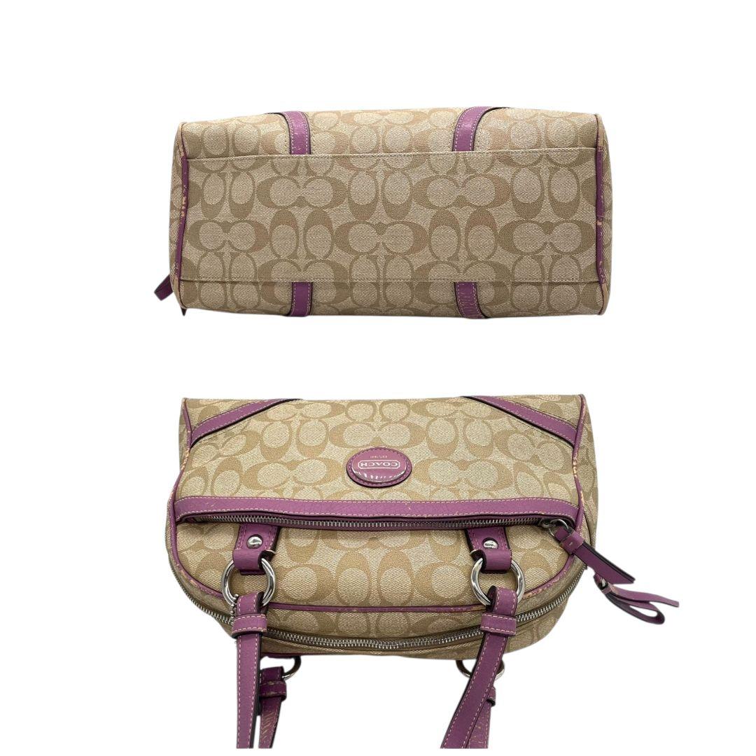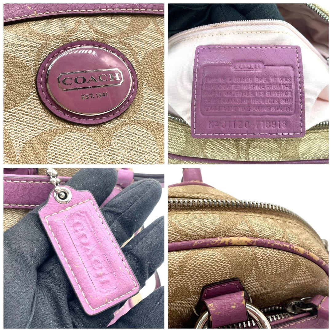 コーチ ハンドバッグ ベージュ シグネチャー ワンショルダー PVC s14 トートバッグ 肩掛け可 肩かけ可 レザー 本革 パープル シルバー金具 ロゴプレート ロゴタグ F18918