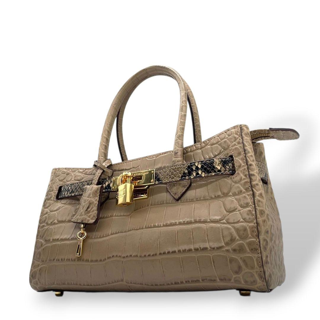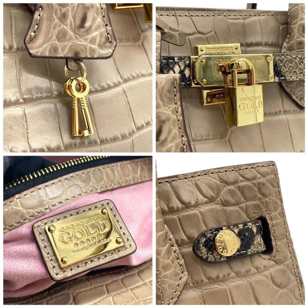 極美品 ココセリュックスゴールド ハンドバッグ ベージュ 型押しレザー 2way トートバッグ ショルダーバッグ 斜め掛け可 南京錠付き 本革 鍵付き ロゴプレート ゴールド金具