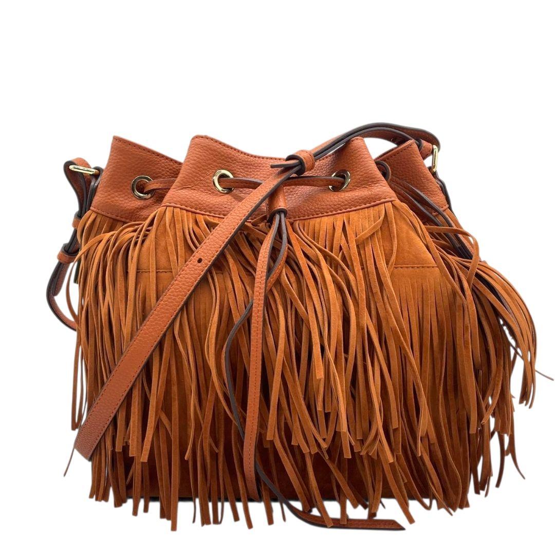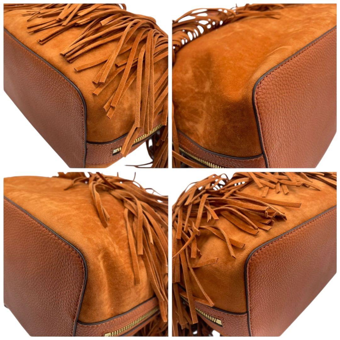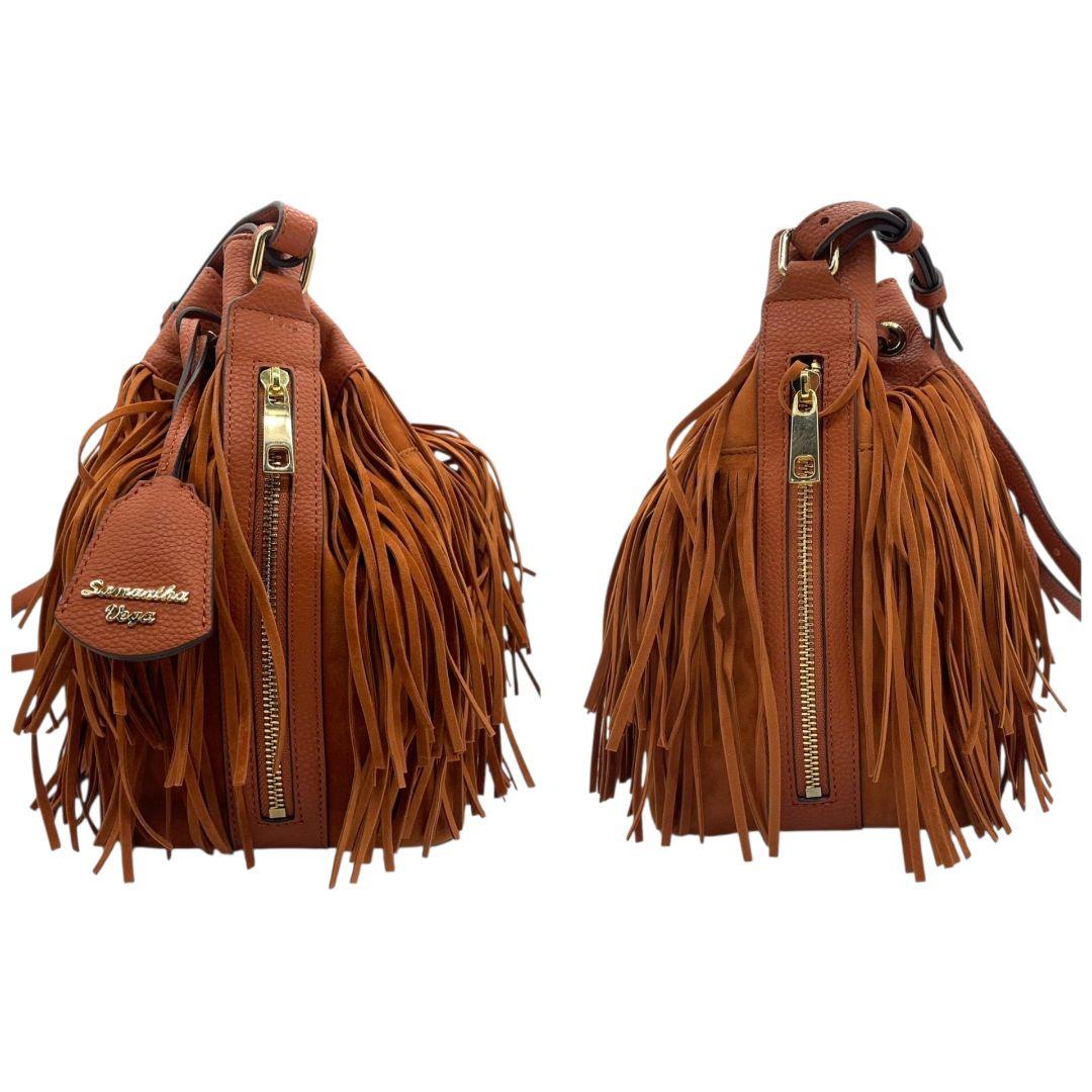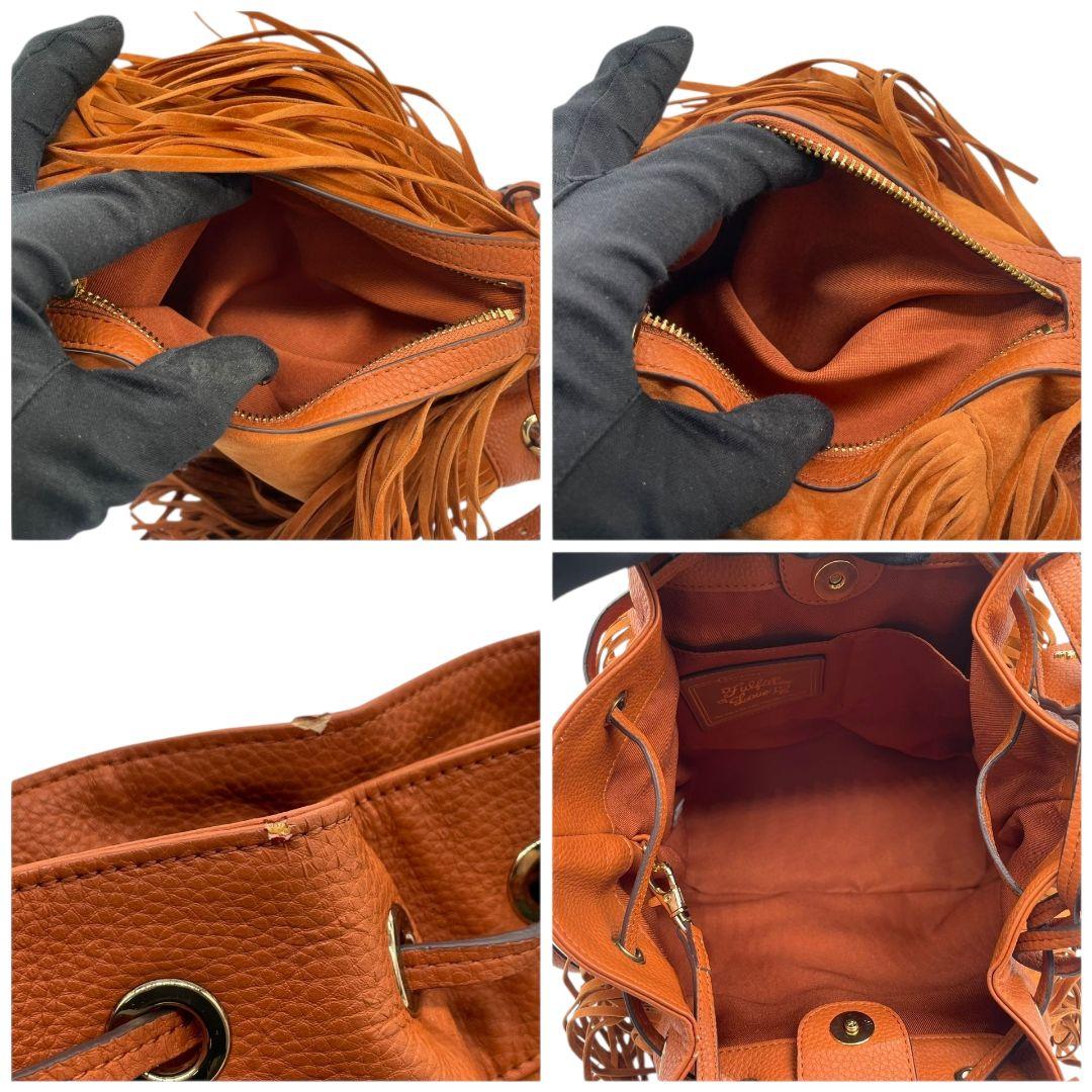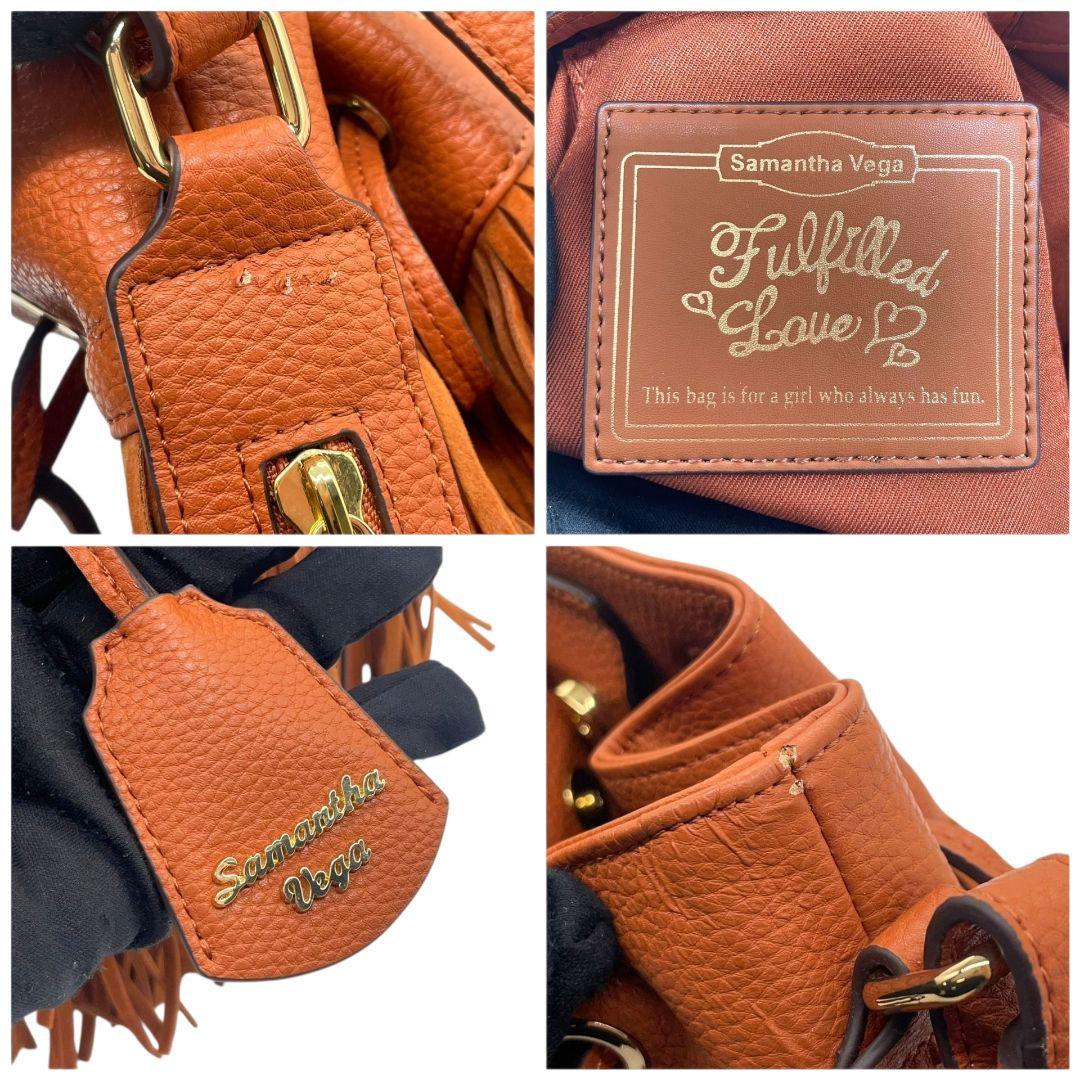 サマンサベガ ショルダーバッグ オレンジ ブラウン 茶 フリンジ 巾着 斜め掛け可 スウェード レザー 本革 ゴールド金具 チャーム付き ロゴ s16 Samantha Vega