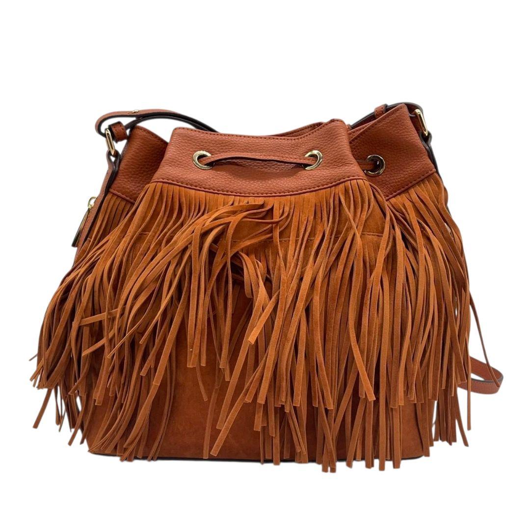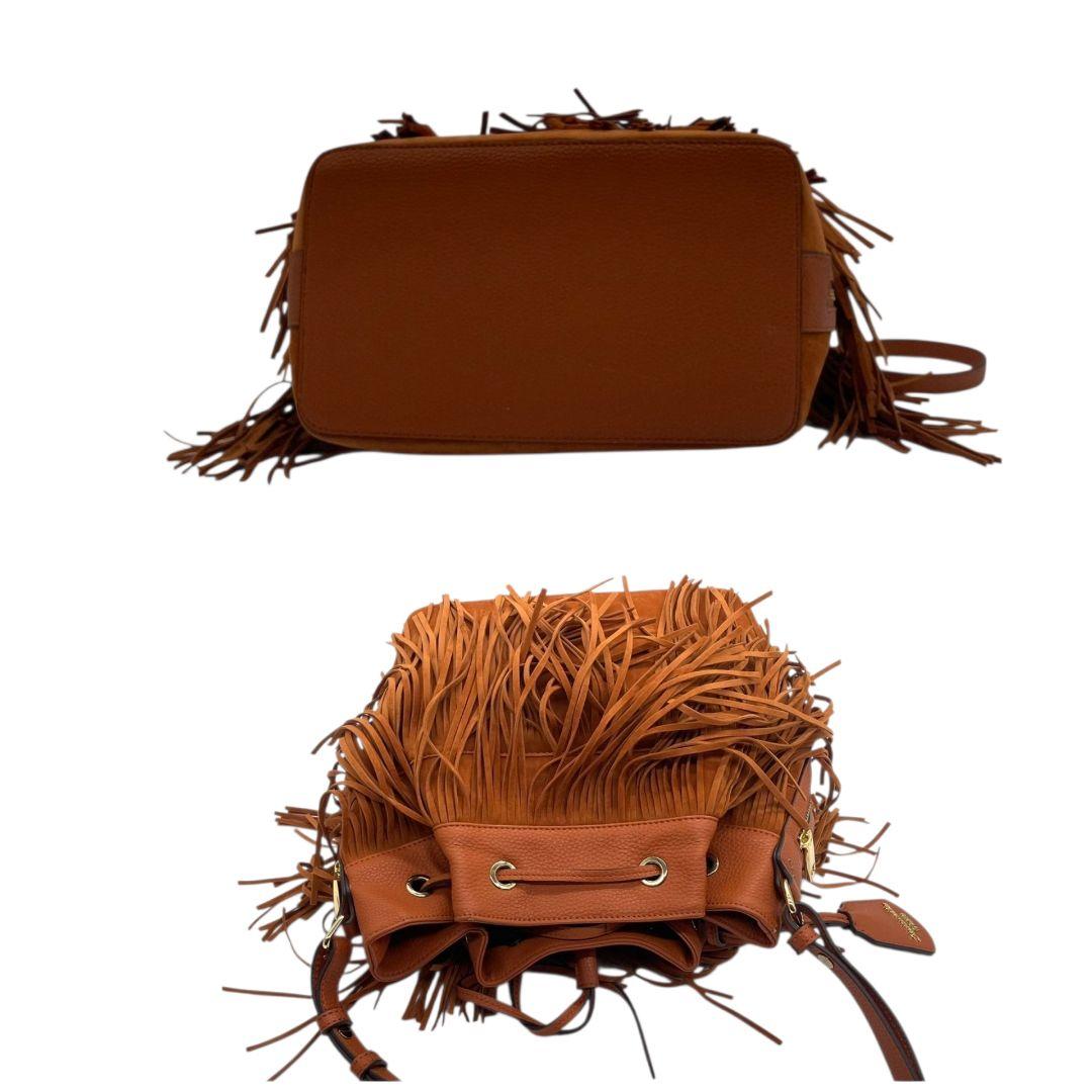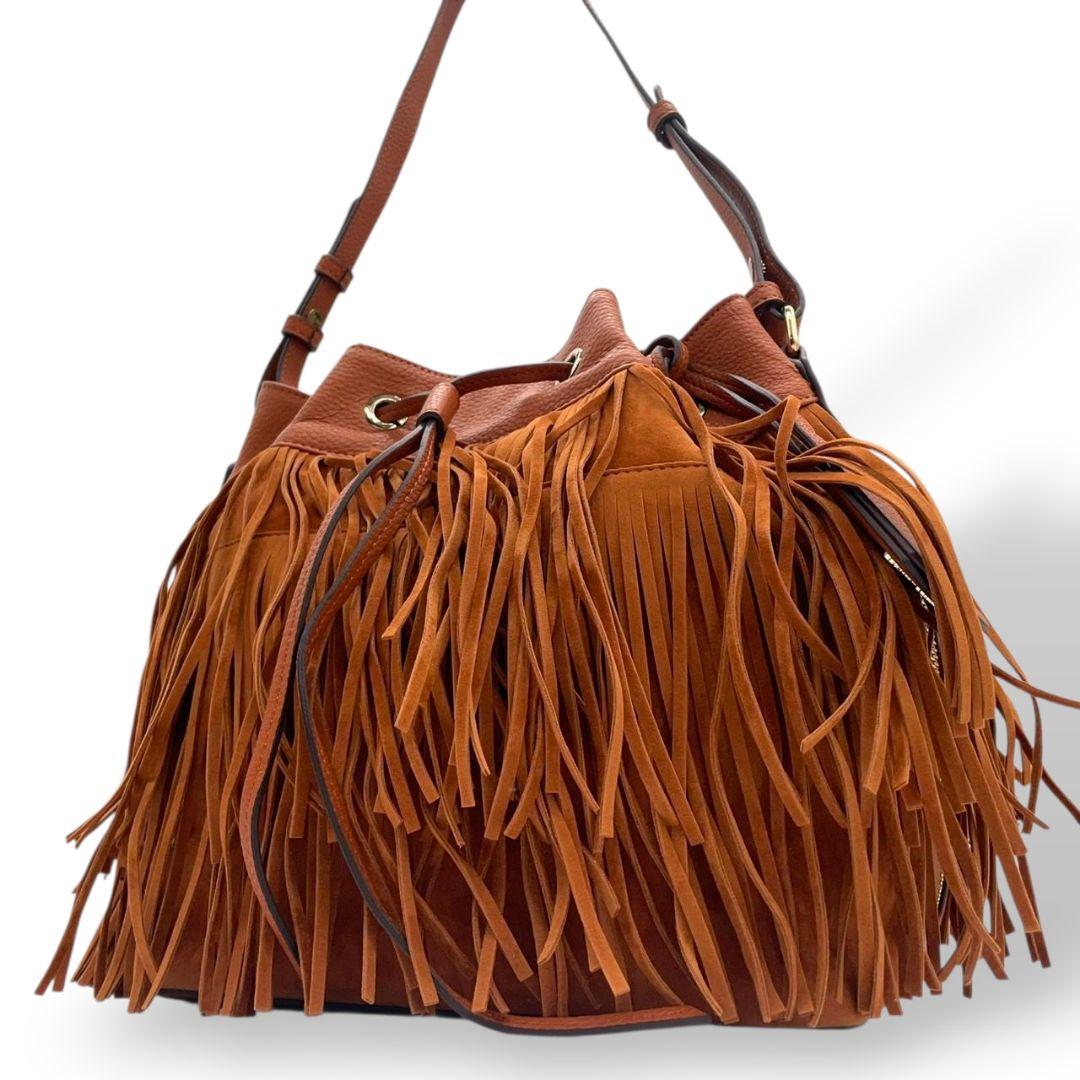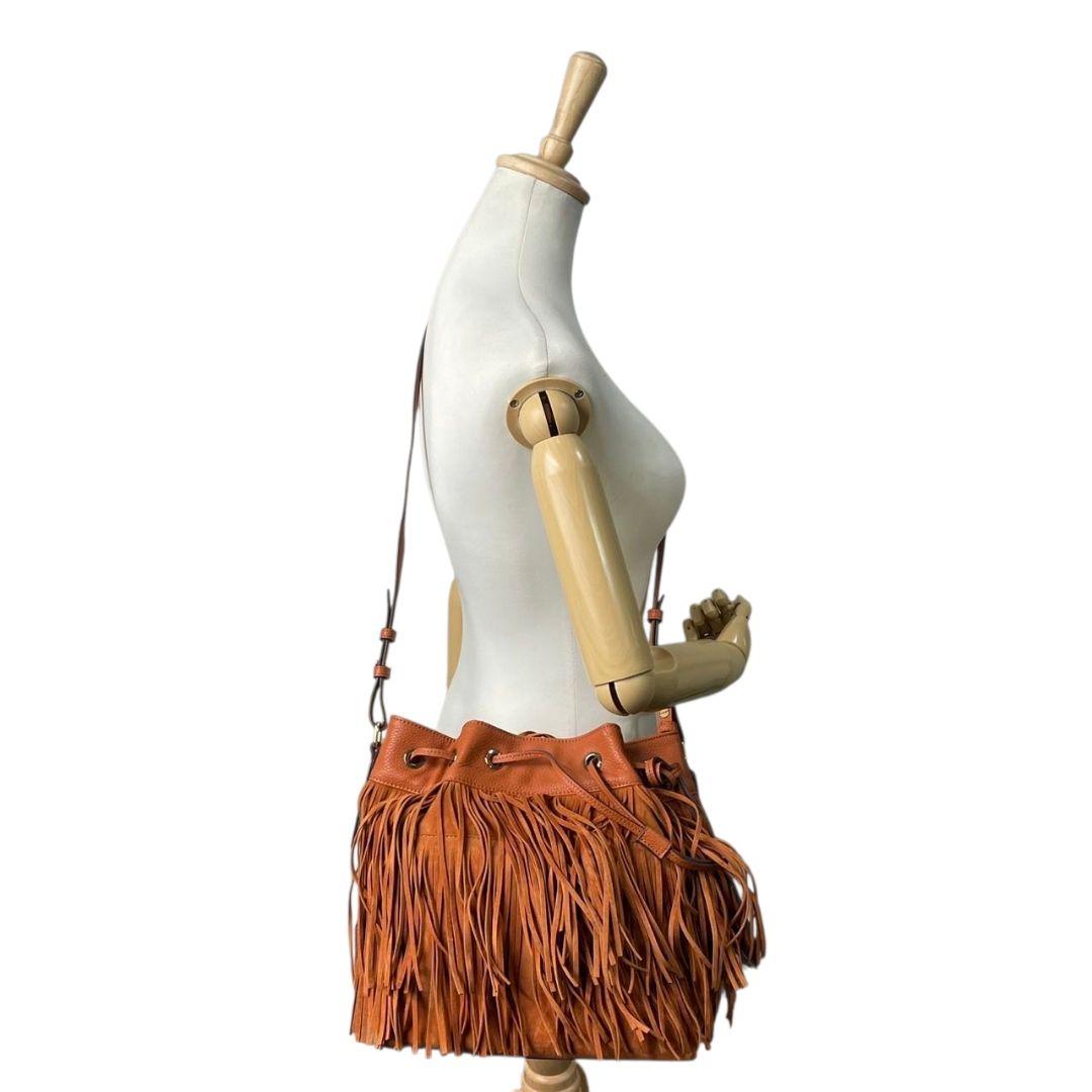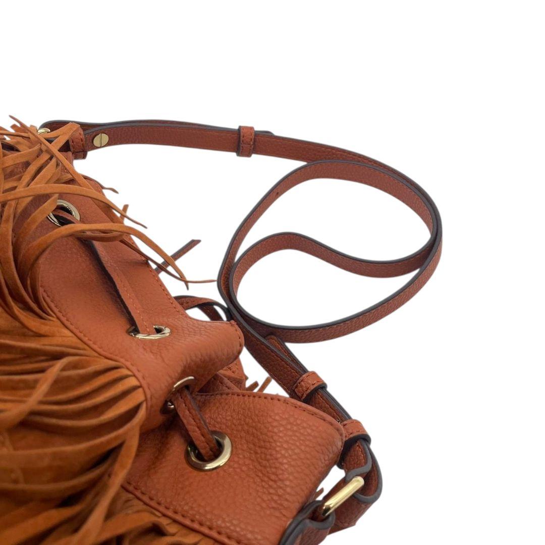 サマンサベガ ショルダーバッグ オレンジ ブラウン 茶 フリンジ 巾着 斜め掛け可 スウェード レザー 本革 ゴールド金具 チャーム付き ロゴ s16 Samantha Vega