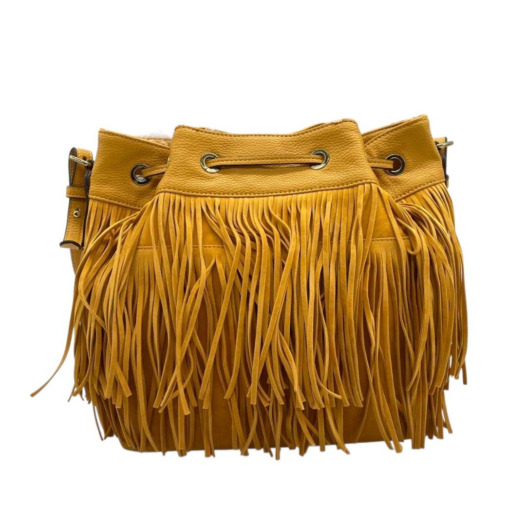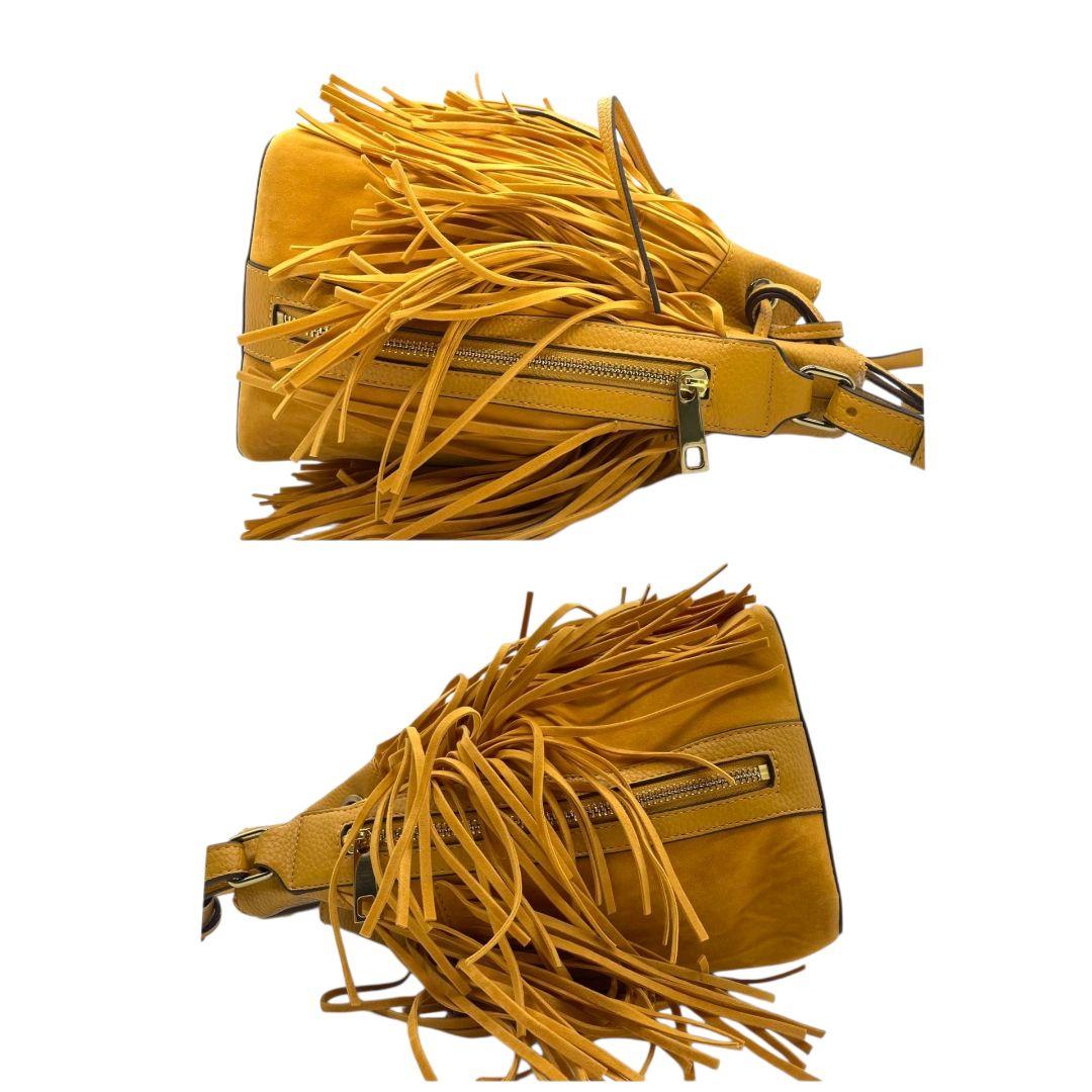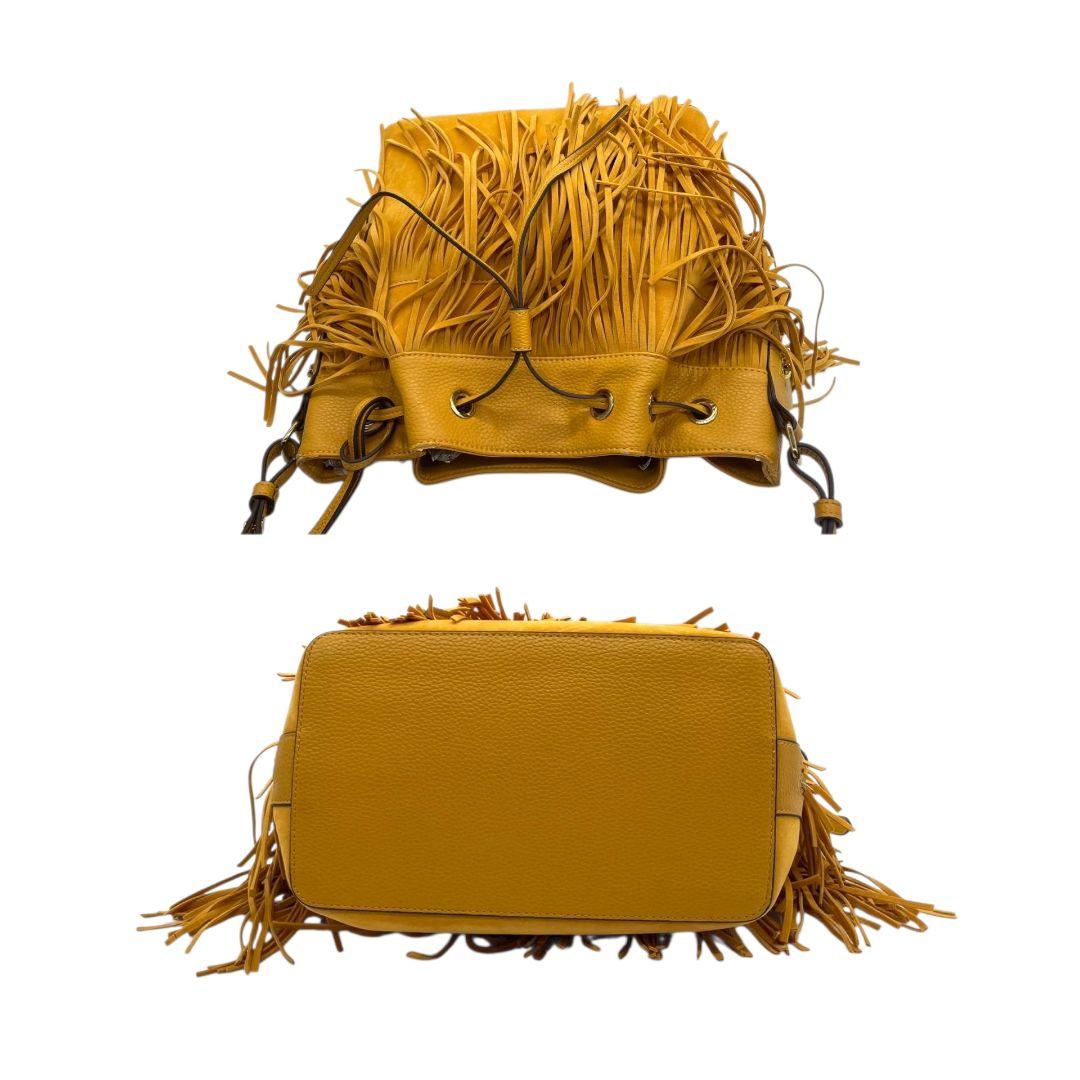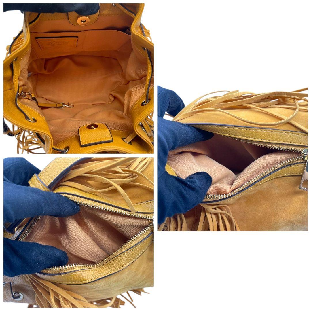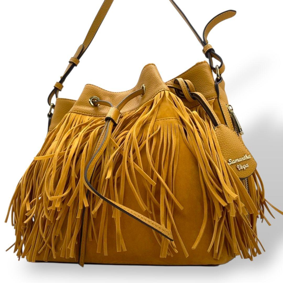 サマンサベガ ショルダーバッグ 黄 イエロー フリンジ 巾着 斜め掛け可 スウェード レザー 本革 ゴールド金具 チャーム付き ロゴ s16 Samantha Vega