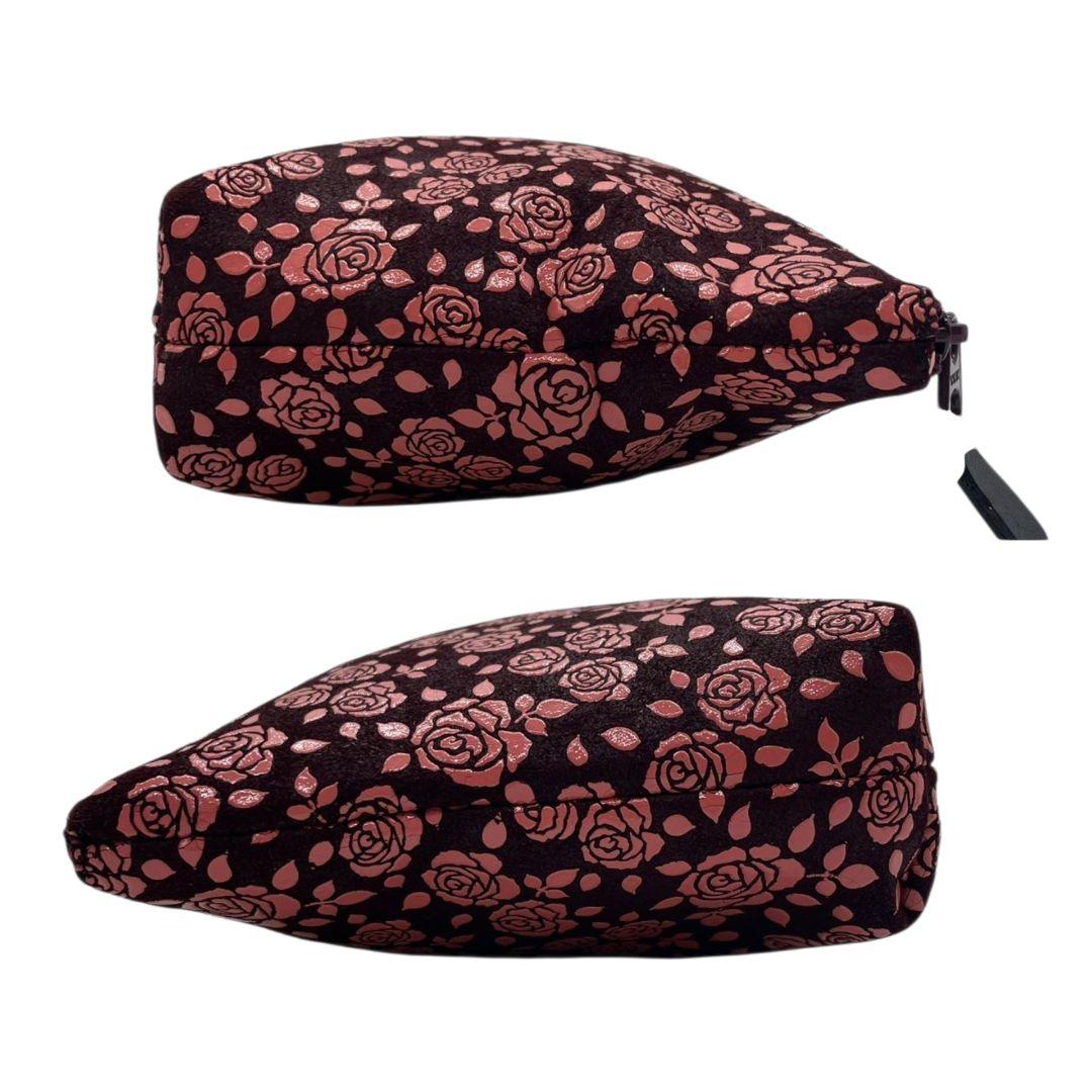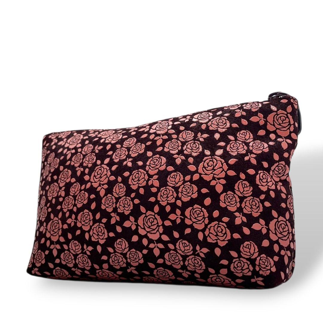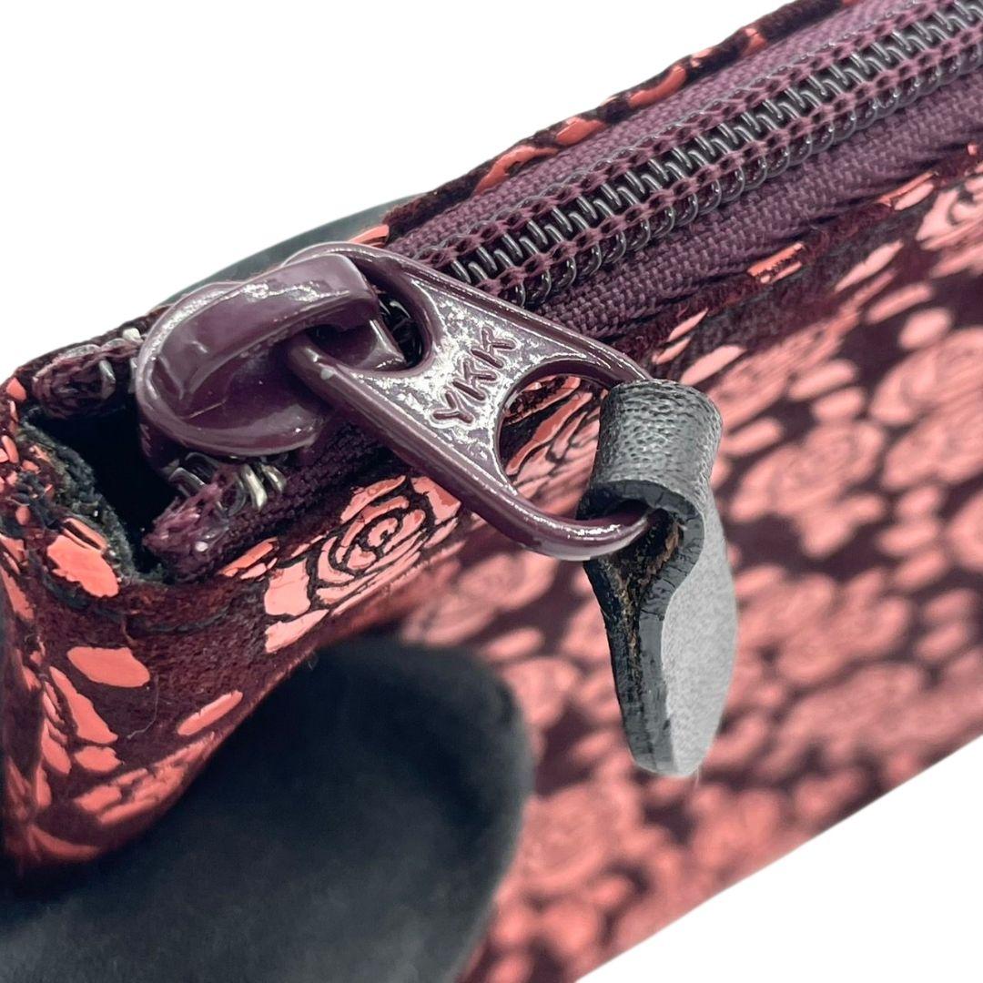 美品 ノーブランド ポーチ ピンク 花柄 バラ柄 小物入れ 化粧ポーチ レザー 本革 スウェード ブラウン 茶色 おしゃれ 可愛い 収納バッグ