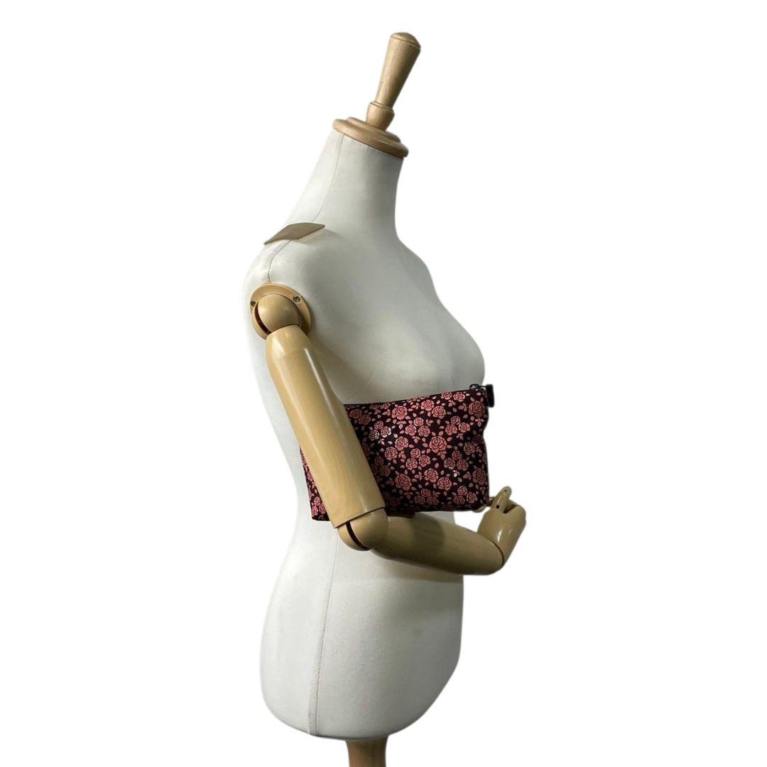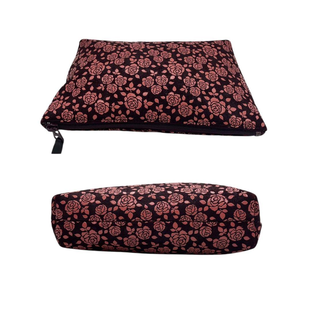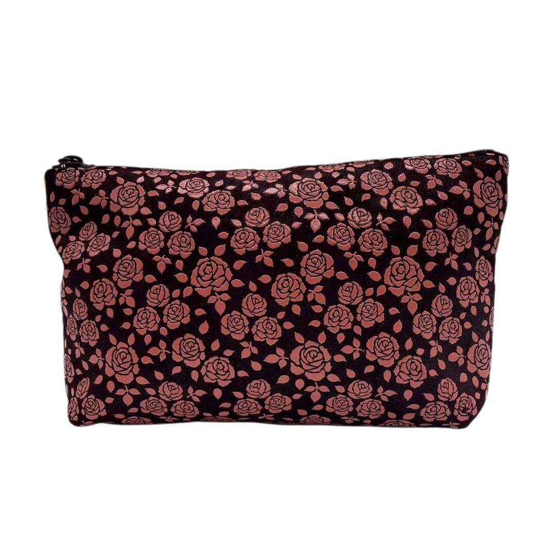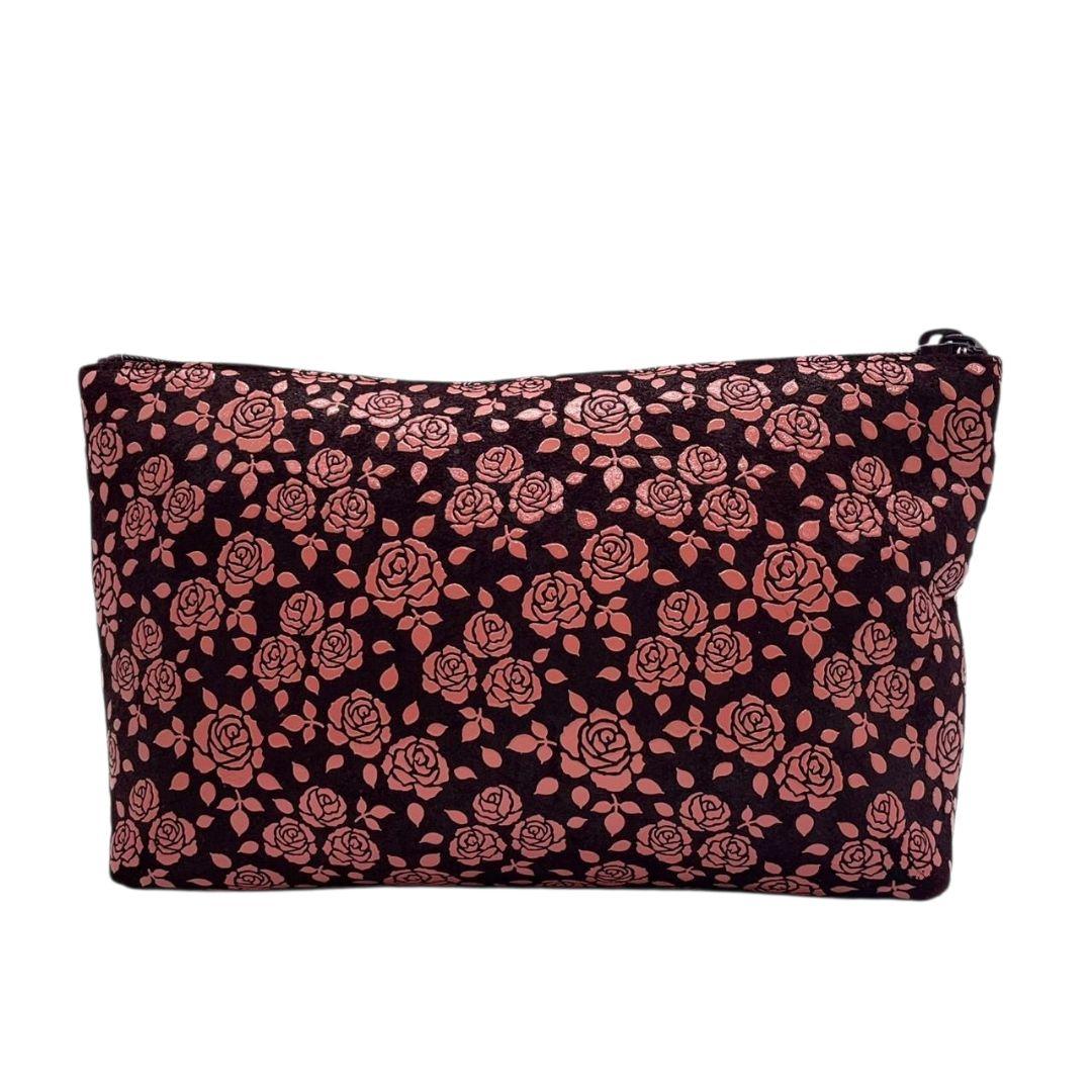 美品 ノーブランド ポーチ ピンク 花柄 バラ柄 小物入れ 化粧ポーチ レザー 本革 スウェード ブラウン 茶色 おしゃれ 可愛い 収納バッグ