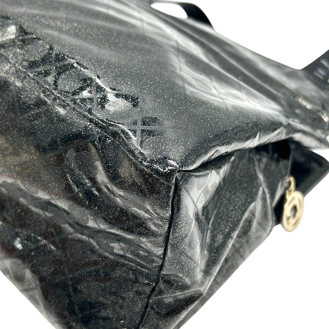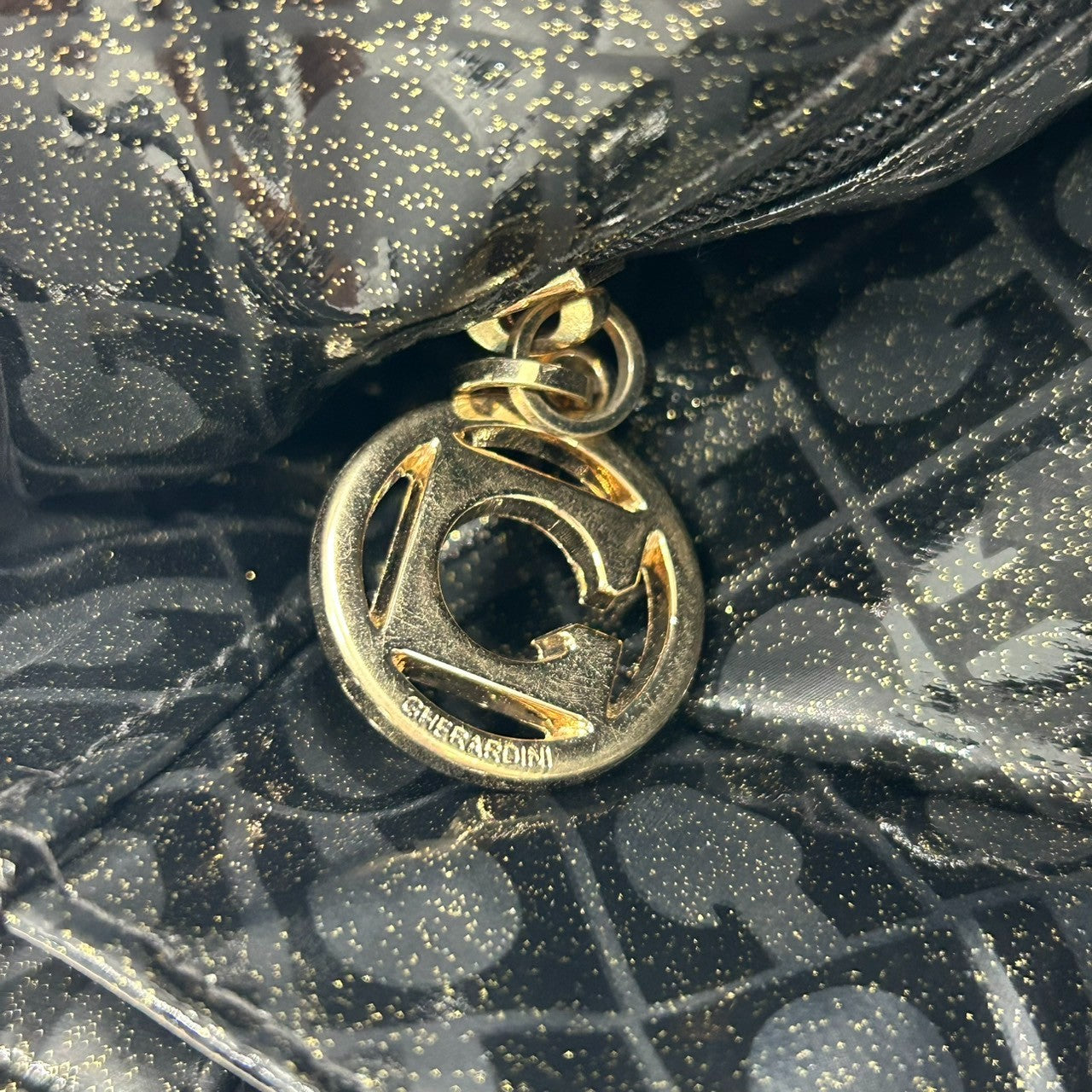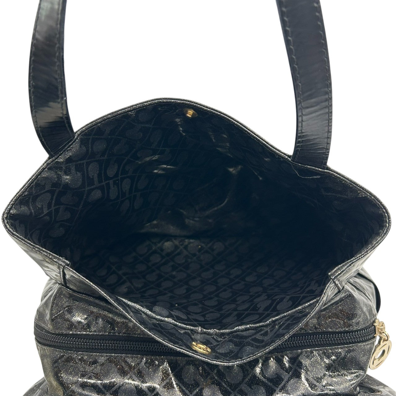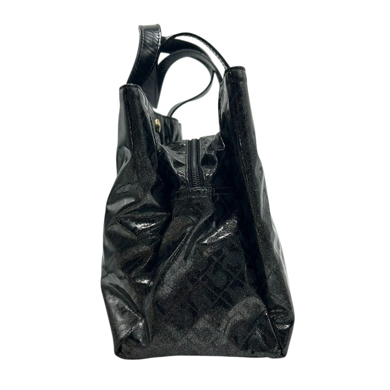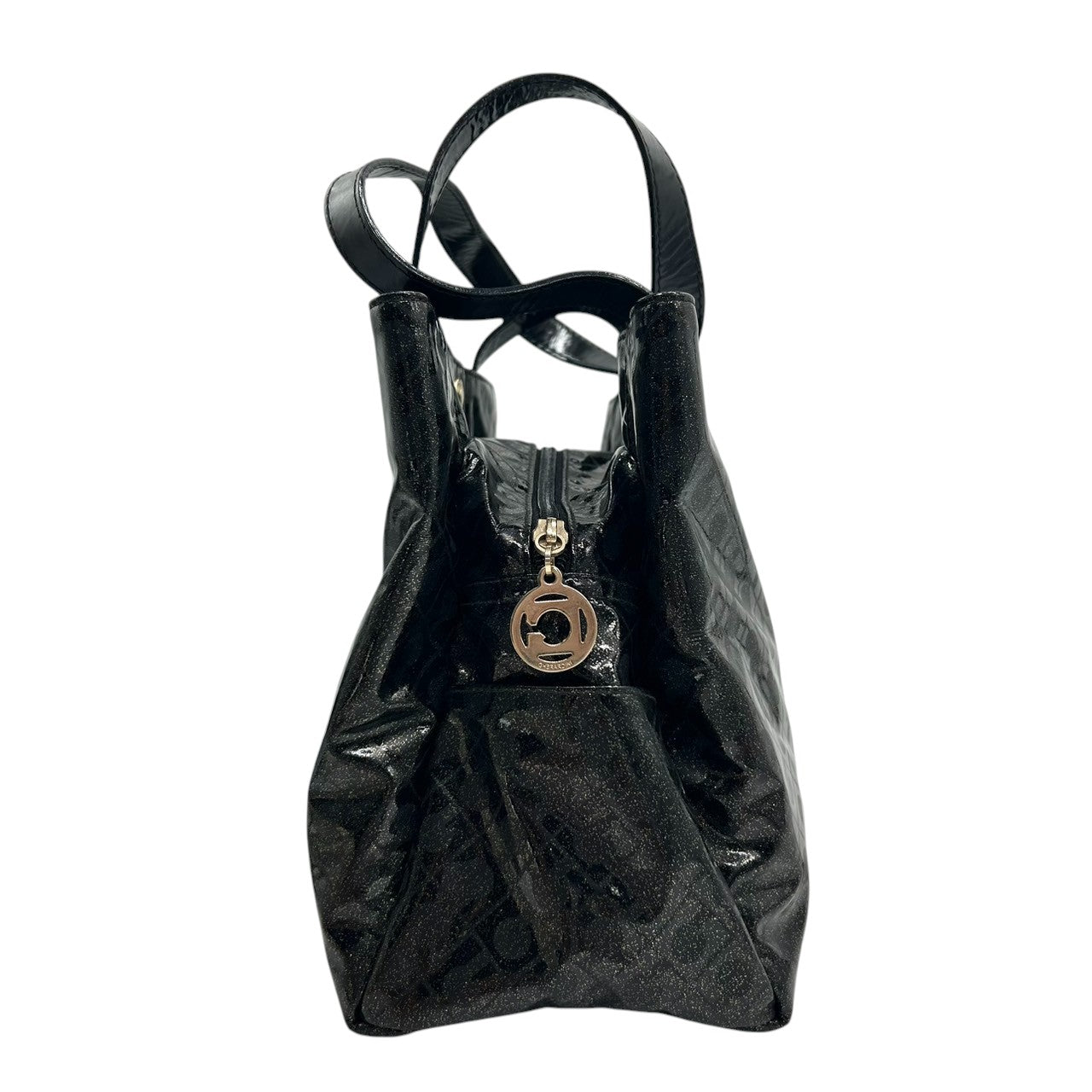【未使用に近い】 ゲラルディーニ GHERARDINI トートバッグ ハンドバッグ ソフティ モノグラム エナメル パテント PVC ブラック ラメ Gロゴチャーム レディース ワンショルダー A4収納可 軽量 自立可 保存袋付き E5