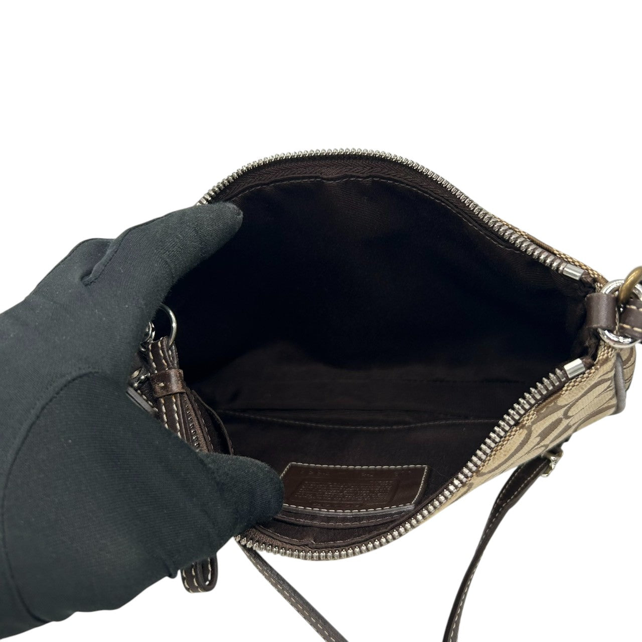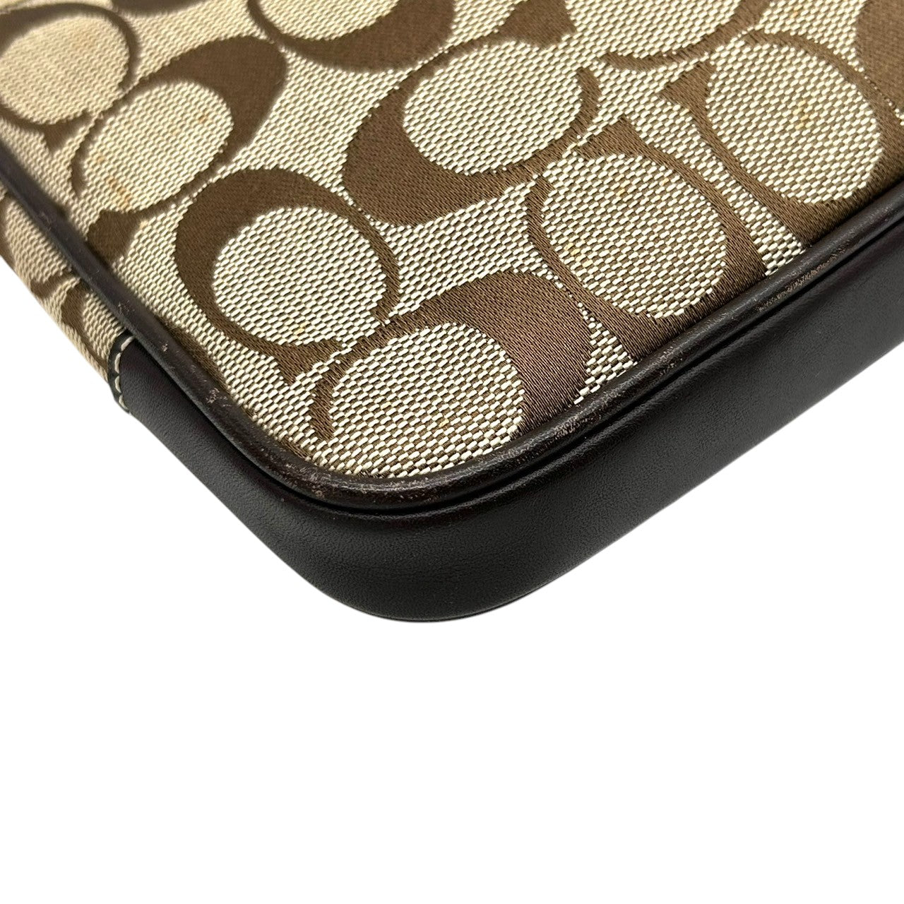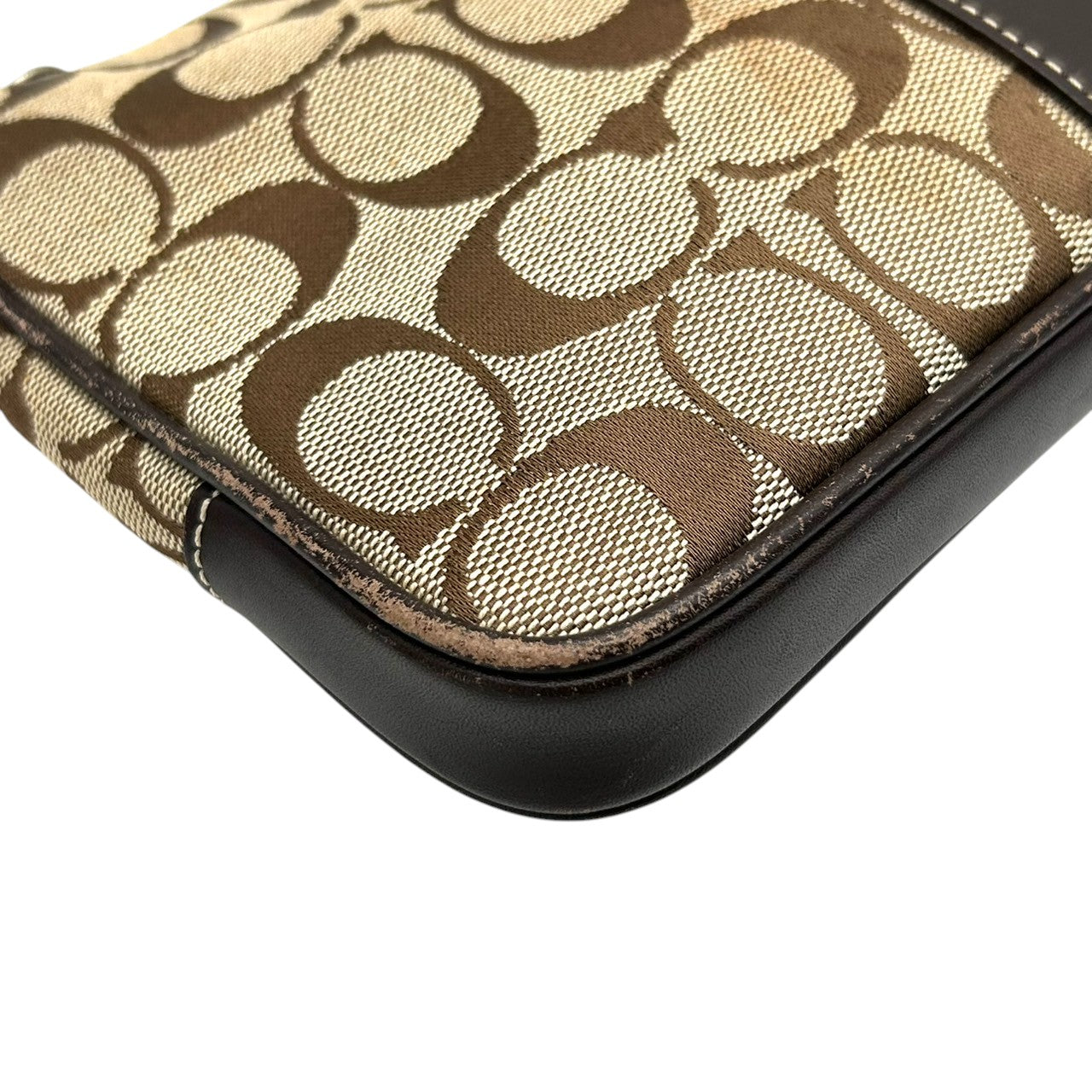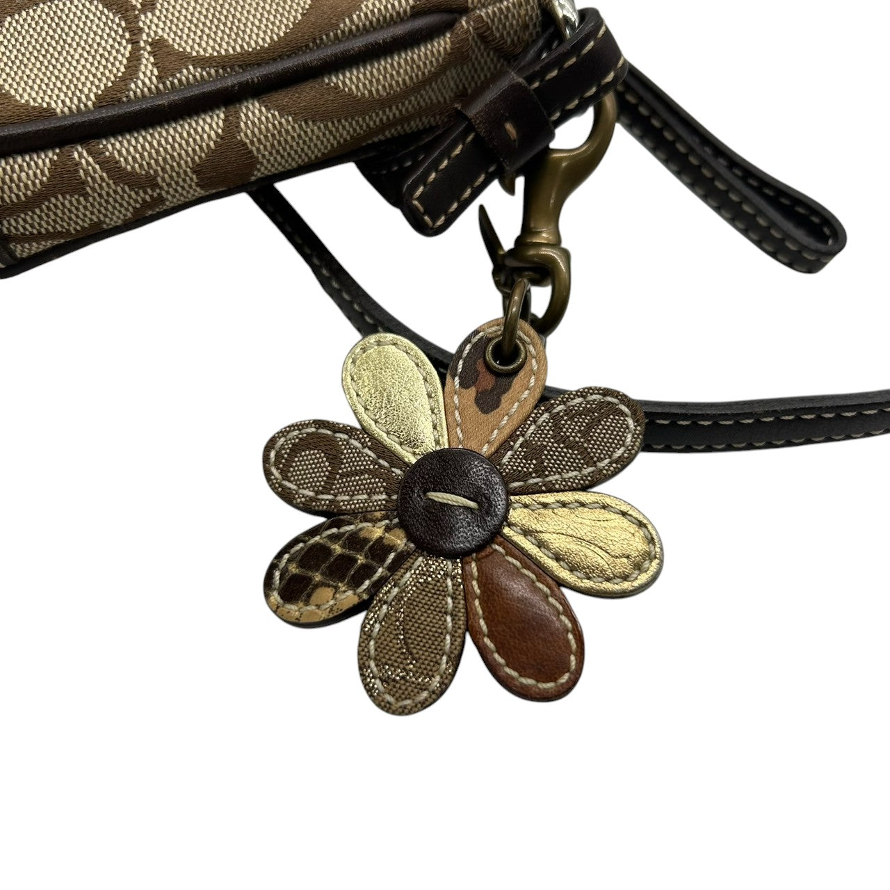 【COACH】コーチ ショルダーバッグ アクセサリーポーチ ポシェット 斜め掛け可 シグネチャー キャンバス レザー ブラウン ベージュ レディース コンパクト クラシックデザイン 人気モデル C6J-6338 フラワーチャーム付き クリーニング済み E8
