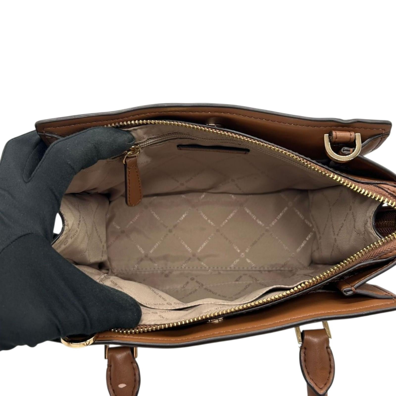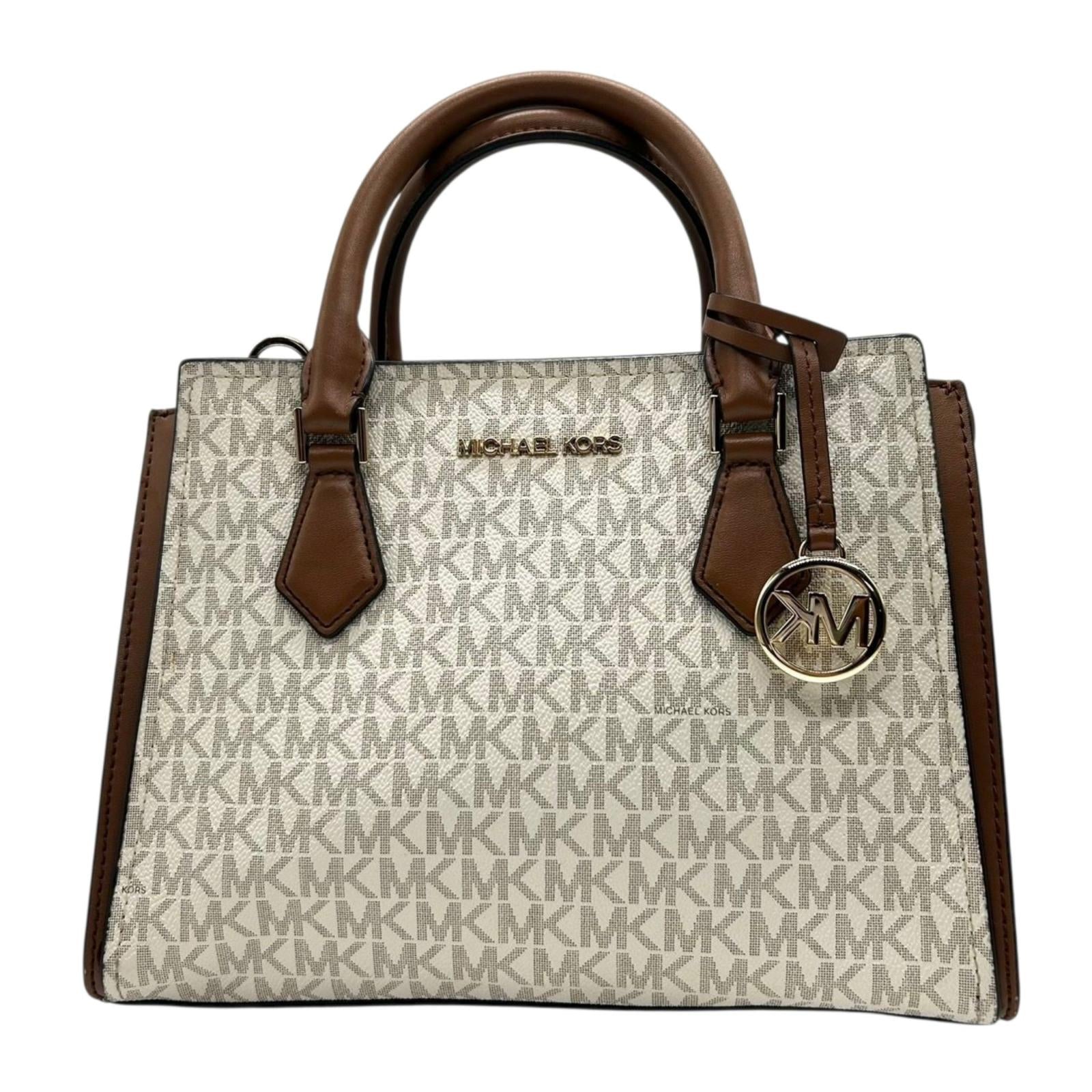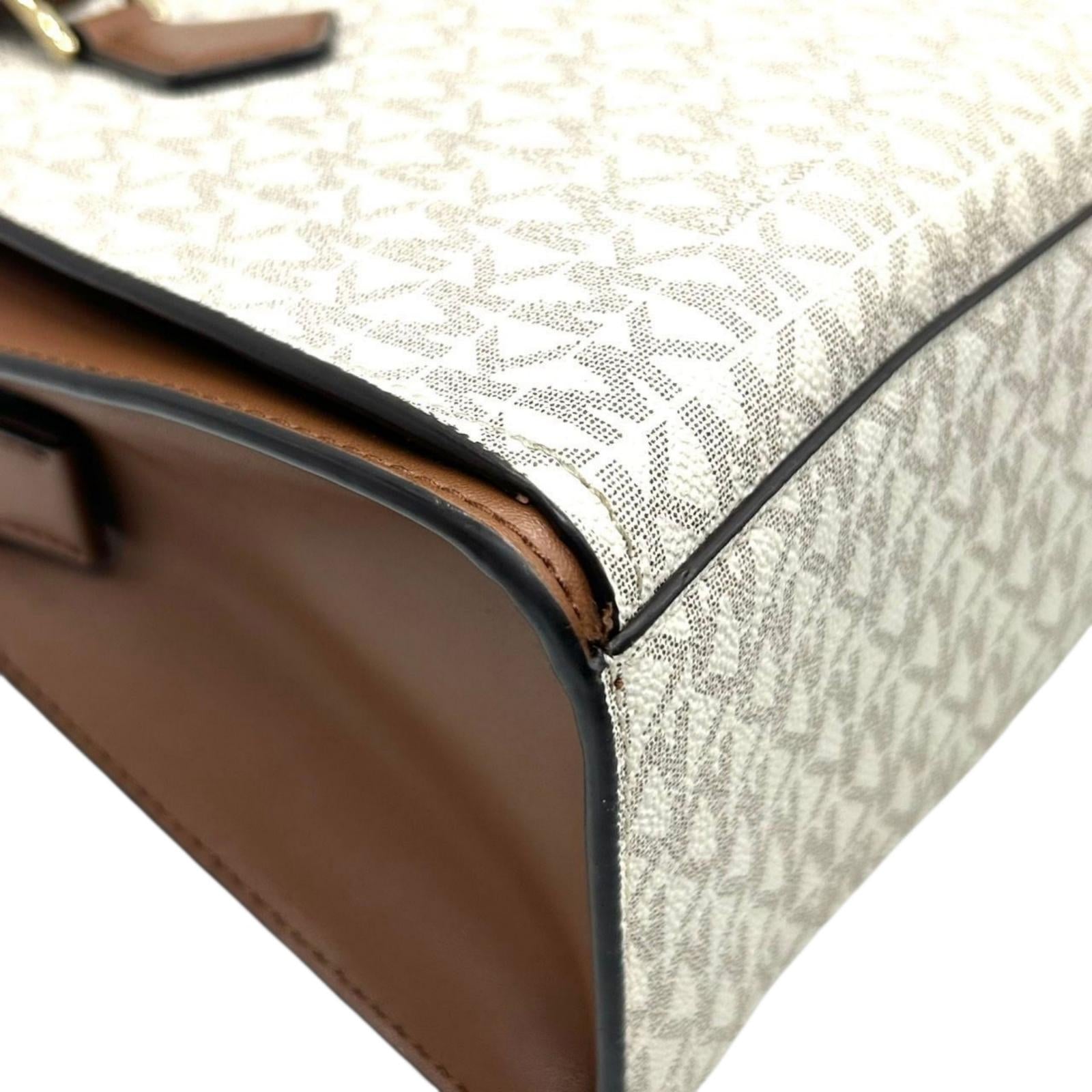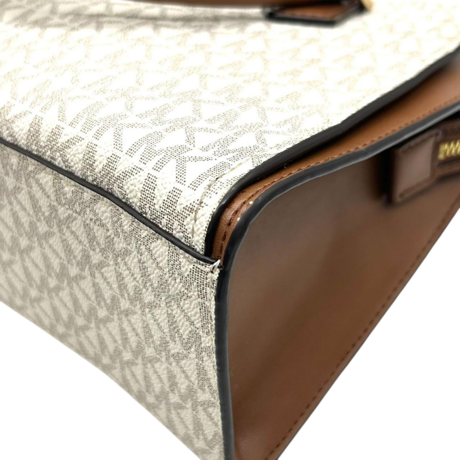 【美品】MICHAEL KORS マイケルコース 2WAY ハンドバッグ ショルダーバッグ シグネチャー MKロゴチャーム PVC レザー ブラウン ベージュ ゴールド金具 エレガント レディース 通勤 通学 クリーニング済み 自立可 s71