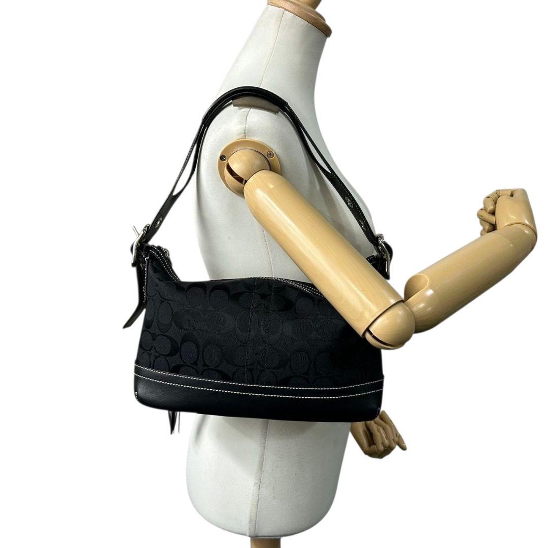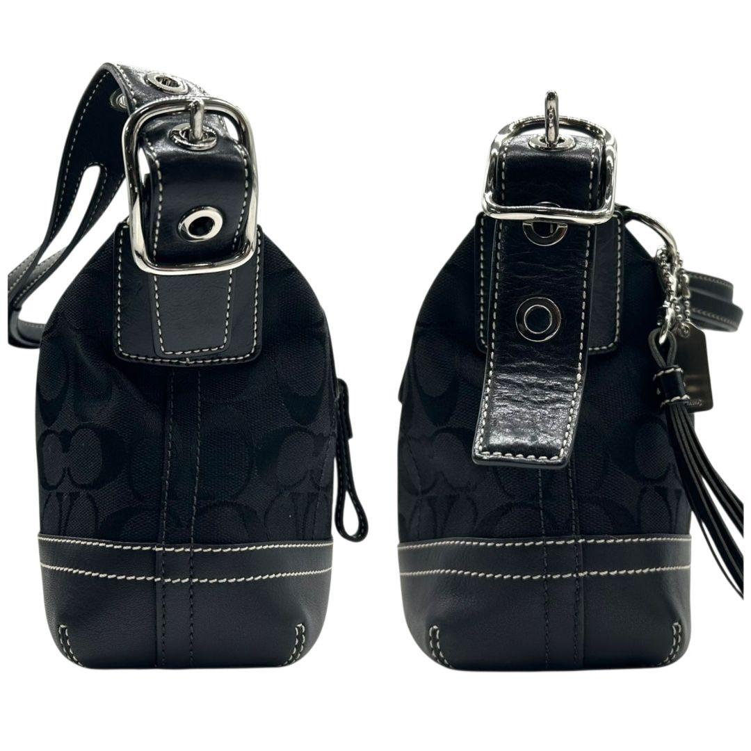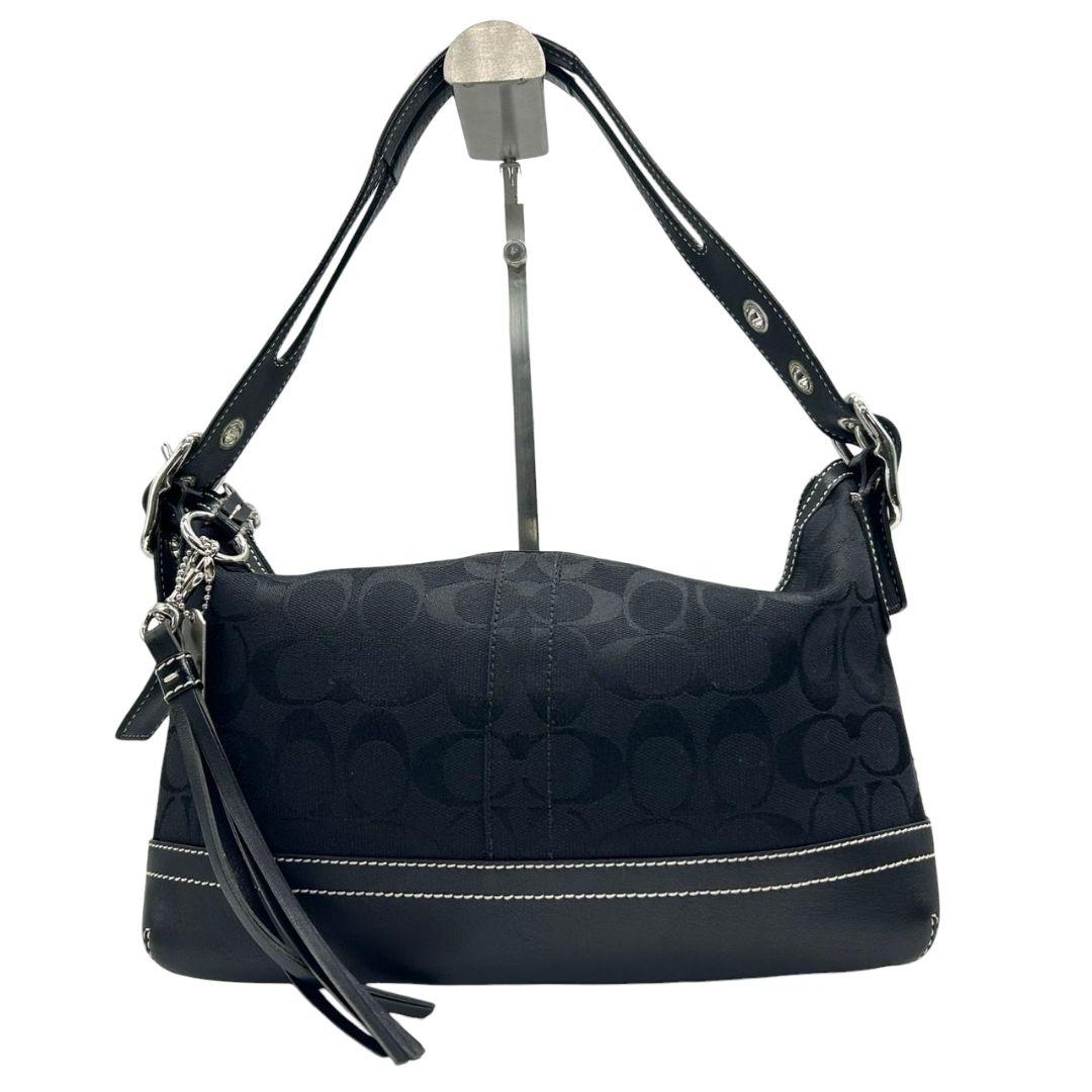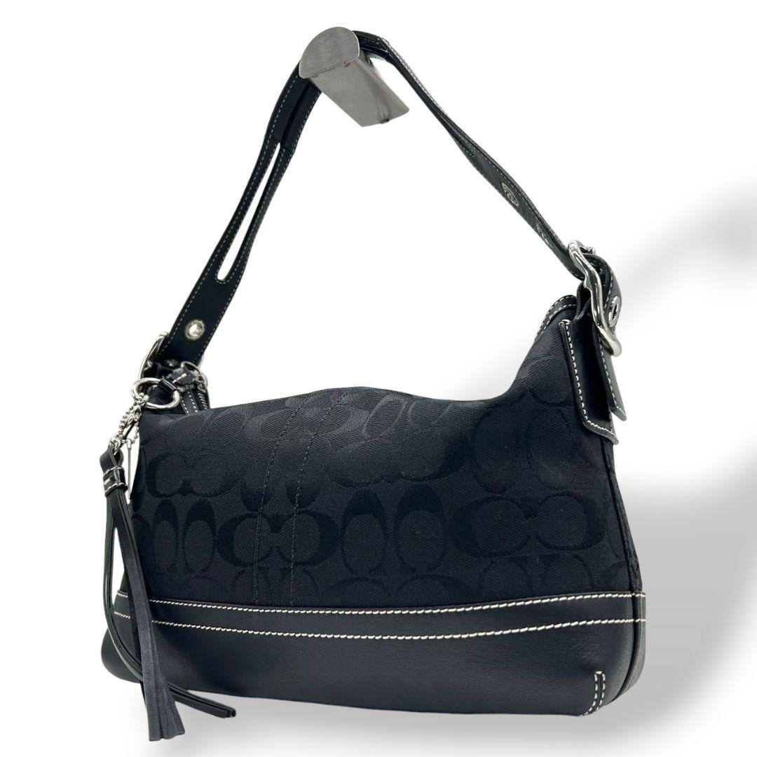 美品 コーチ ハンドバッグ 黒 シグネチャー ワンショルダー キャンバス 9363 肩掛け可 トートバッグ ブラック シルバー金具 レザー 本革 タッセル ロゴタグ COACH E8