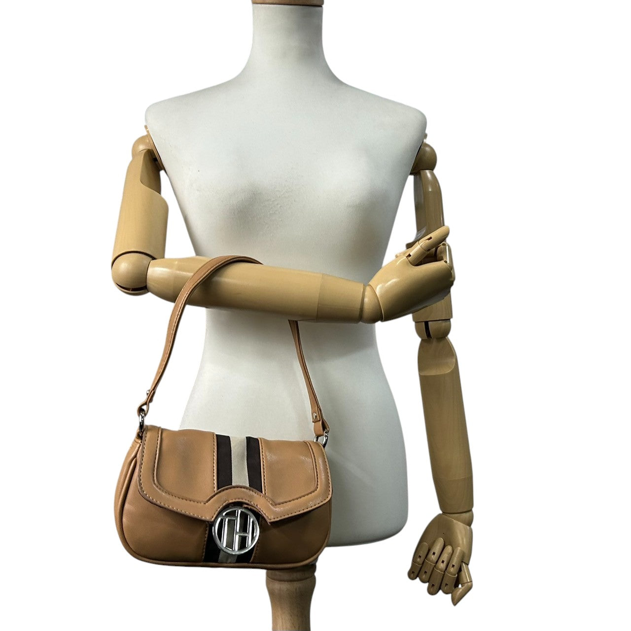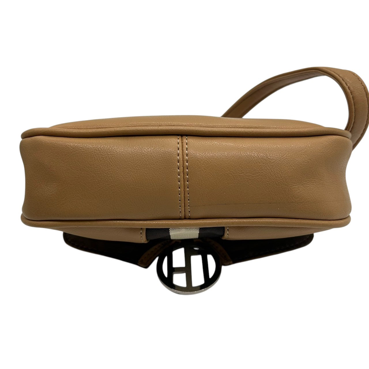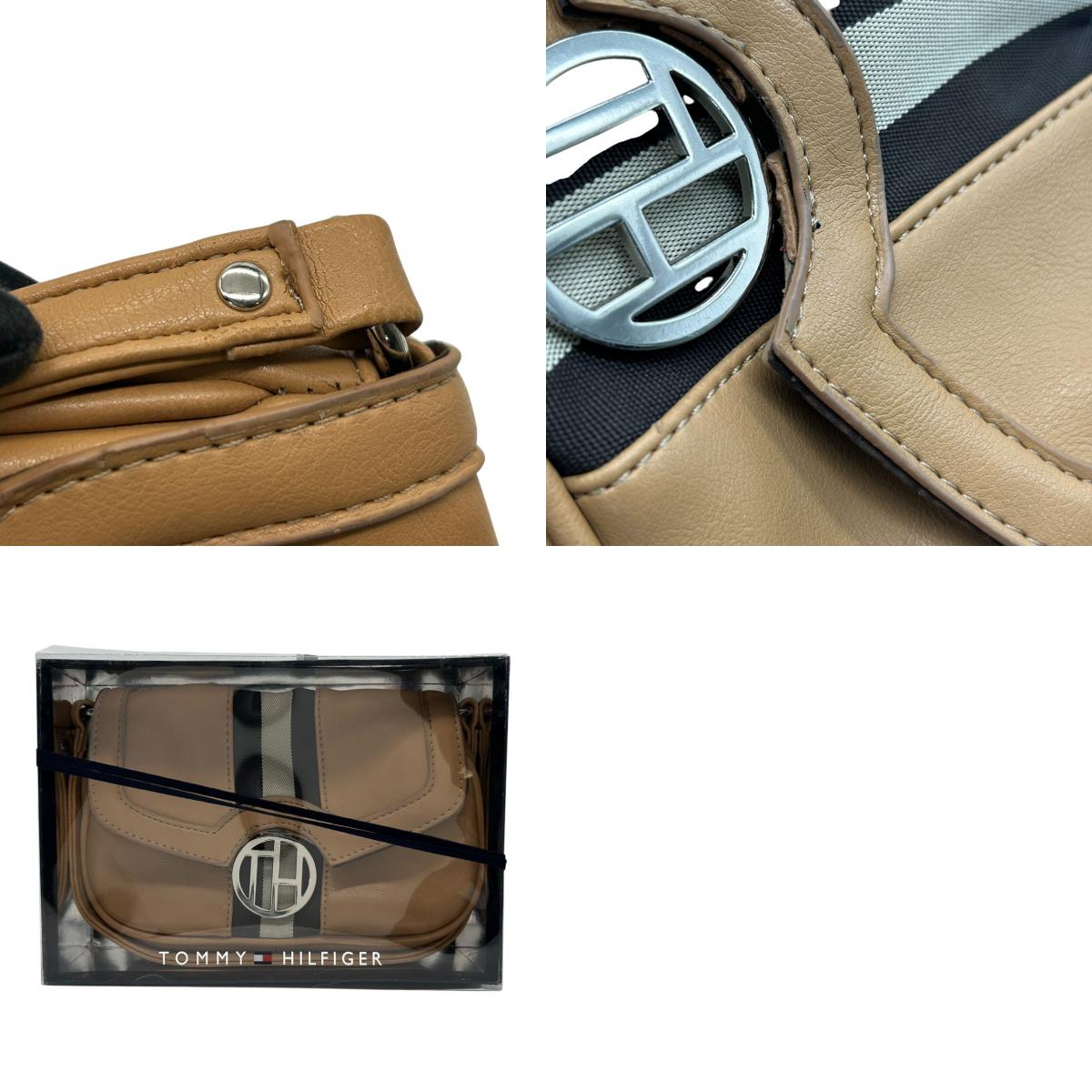トミーヒルフィガー ハンドバッグ ワンショルダー 自立可 THロゴ Y2K 00s ストライプ レザー ベージュ キャメル レディース コンパクト ミニバッグ エレガント カジュアル お出かけ TOMMY HILFIGER 箱付き クリーニング済み R