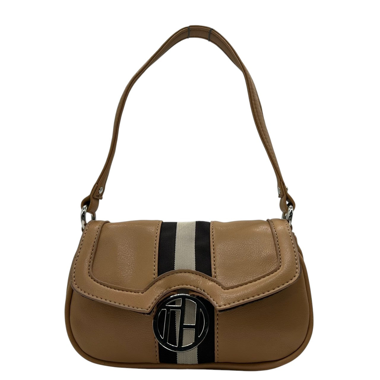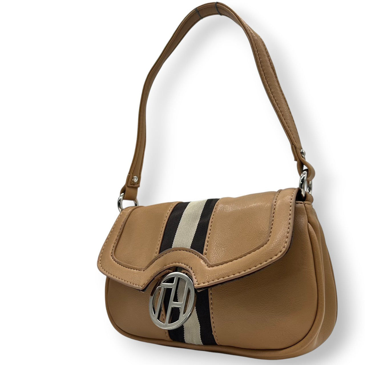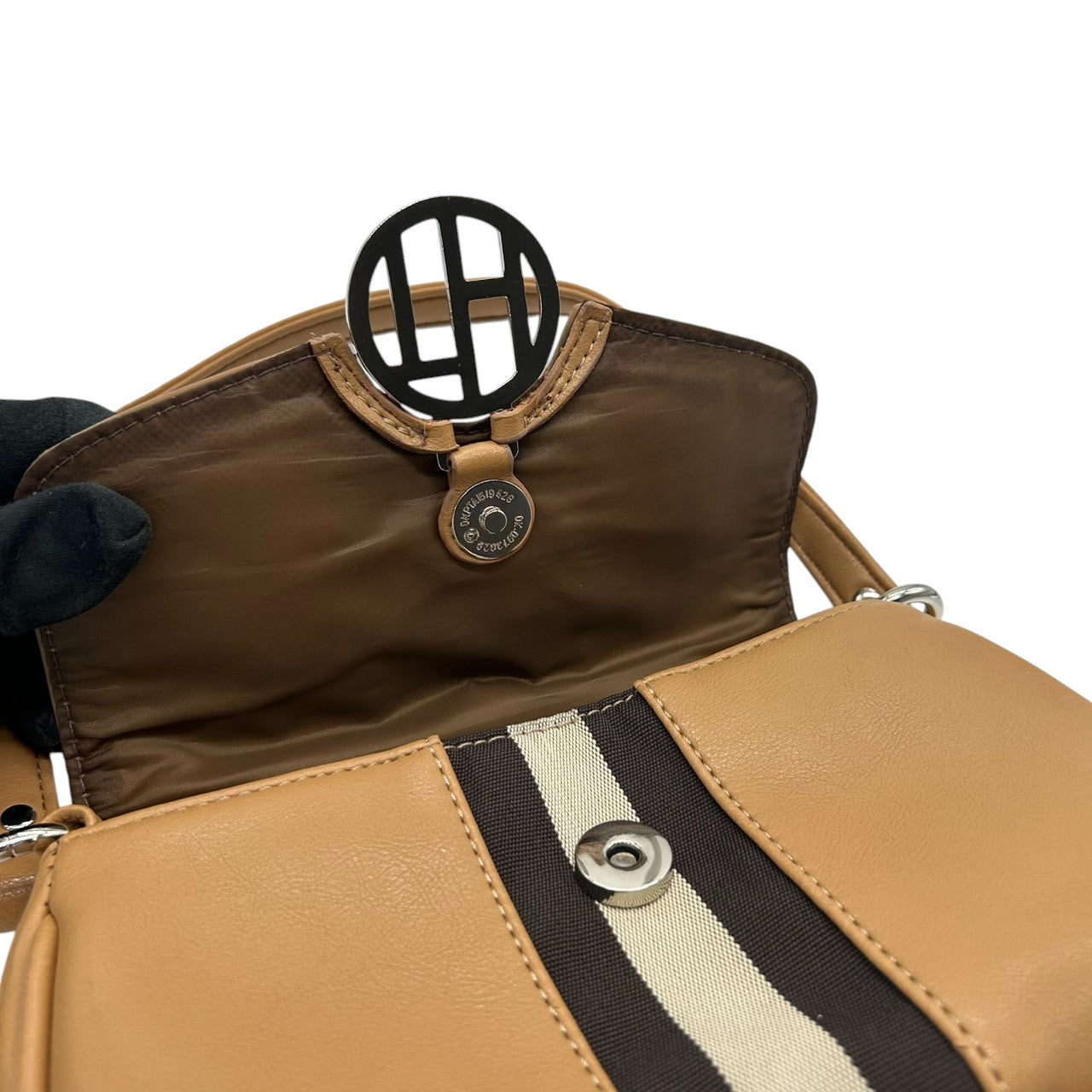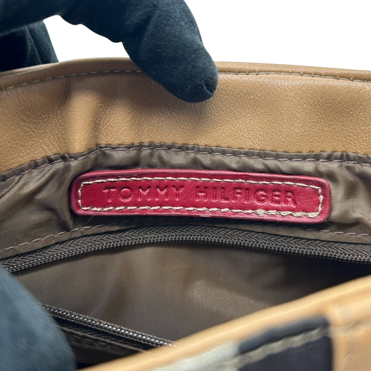 トミーヒルフィガー ハンドバッグ ワンショルダー 自立可 THロゴ Y2K 00s ストライプ レザー ベージュ キャメル レディース コンパクト ミニバッグ エレガント カジュアル お出かけ TOMMY HILFIGER 箱付き クリーニング済み R