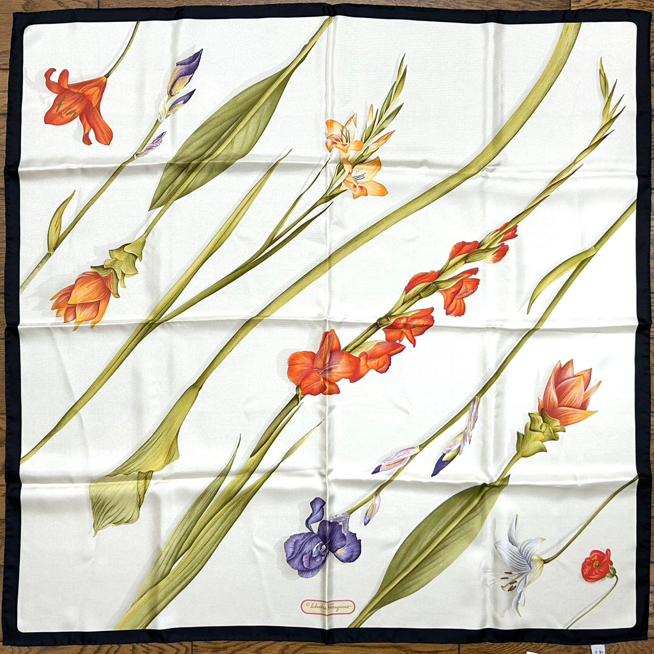 サルヴァトーレフェラガモ Salvatore Ferragamo ヴィンテージ シルクスカーフ 花 フラワープリント 黒 ブラック ホワイト マルチカラー W4