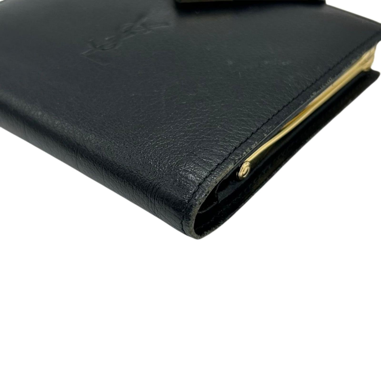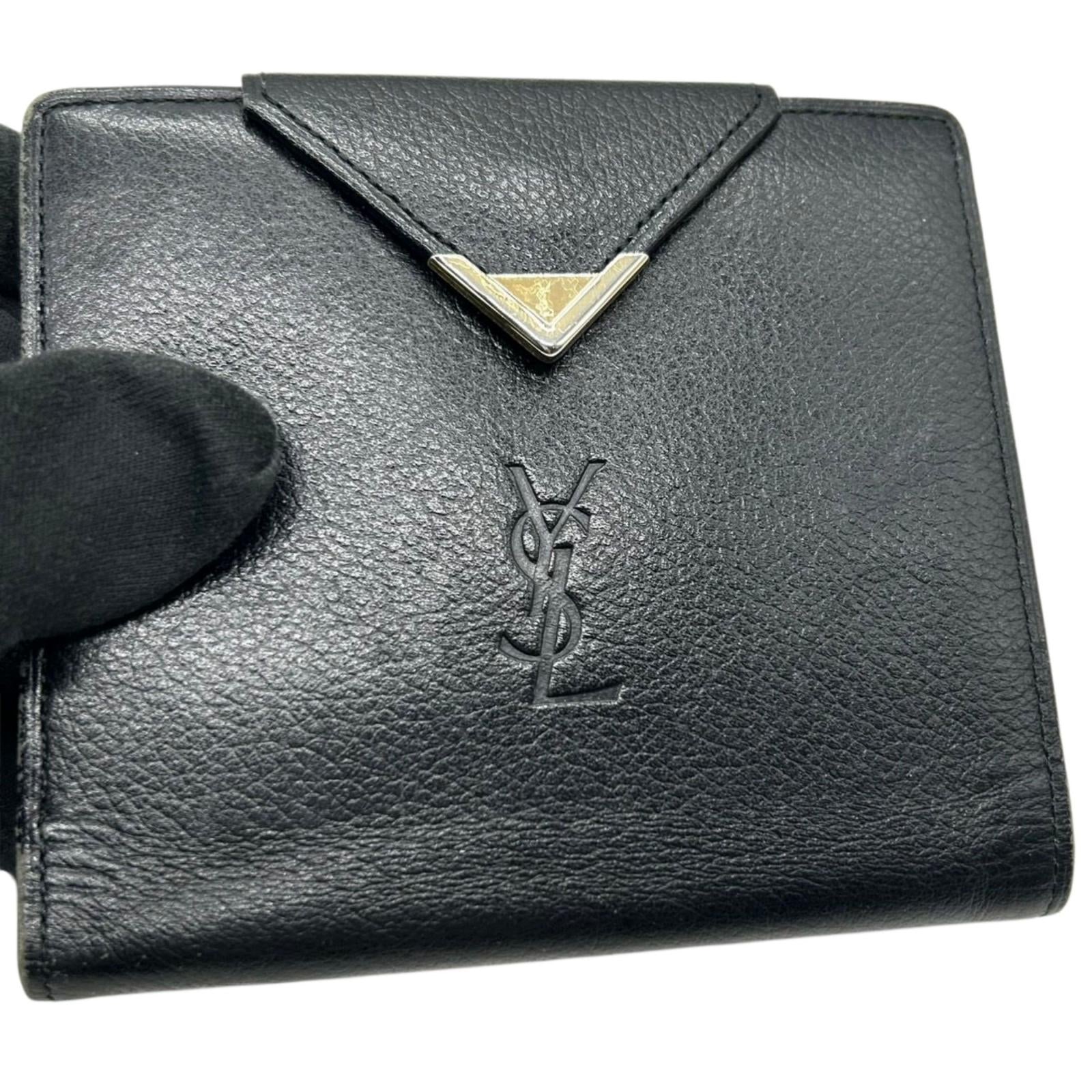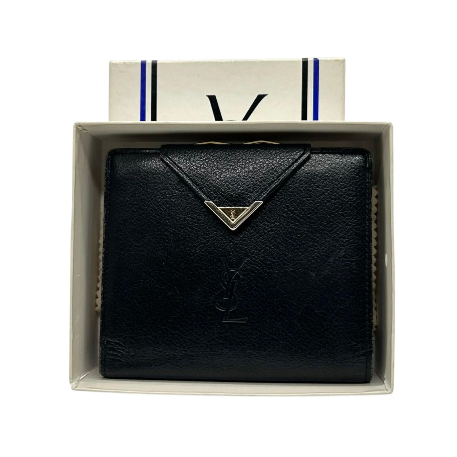 イヴ・サンローラン Yves Saint Laurent 財布 二つ折り YSLロゴ Vステッチ コンパクトウォレット 本革 レザー ブラック 黒 クラシック ヴィンテージ メンズ レディース ユニセックス クリーニング済み w5