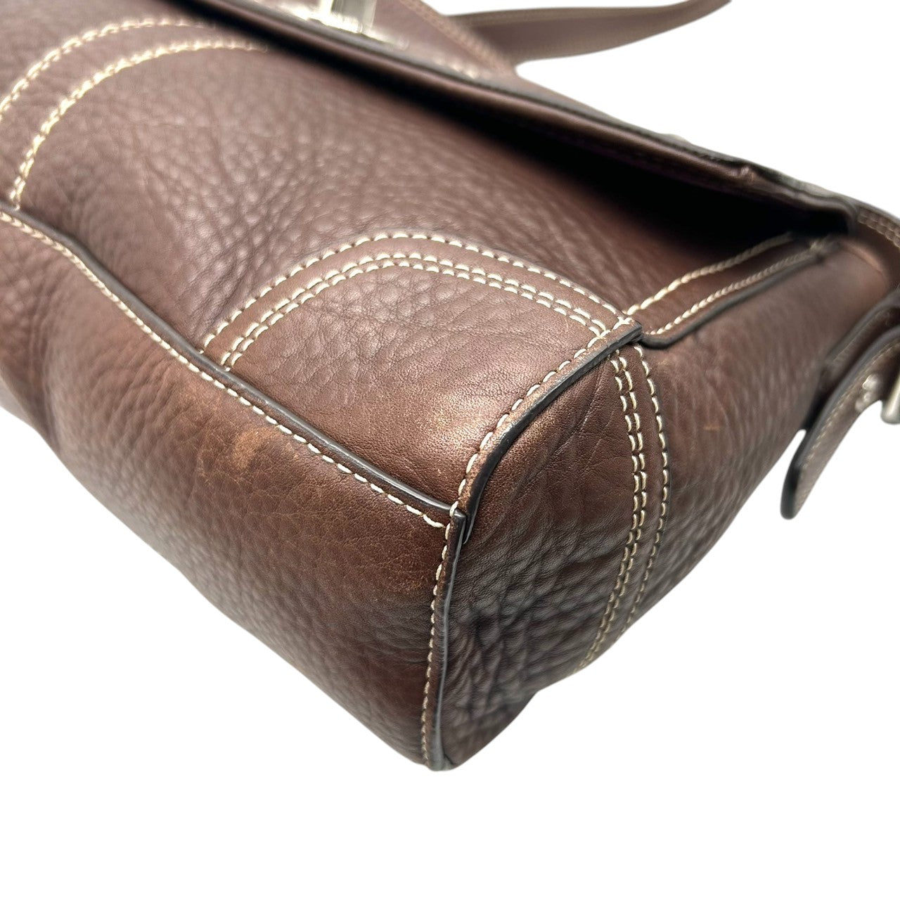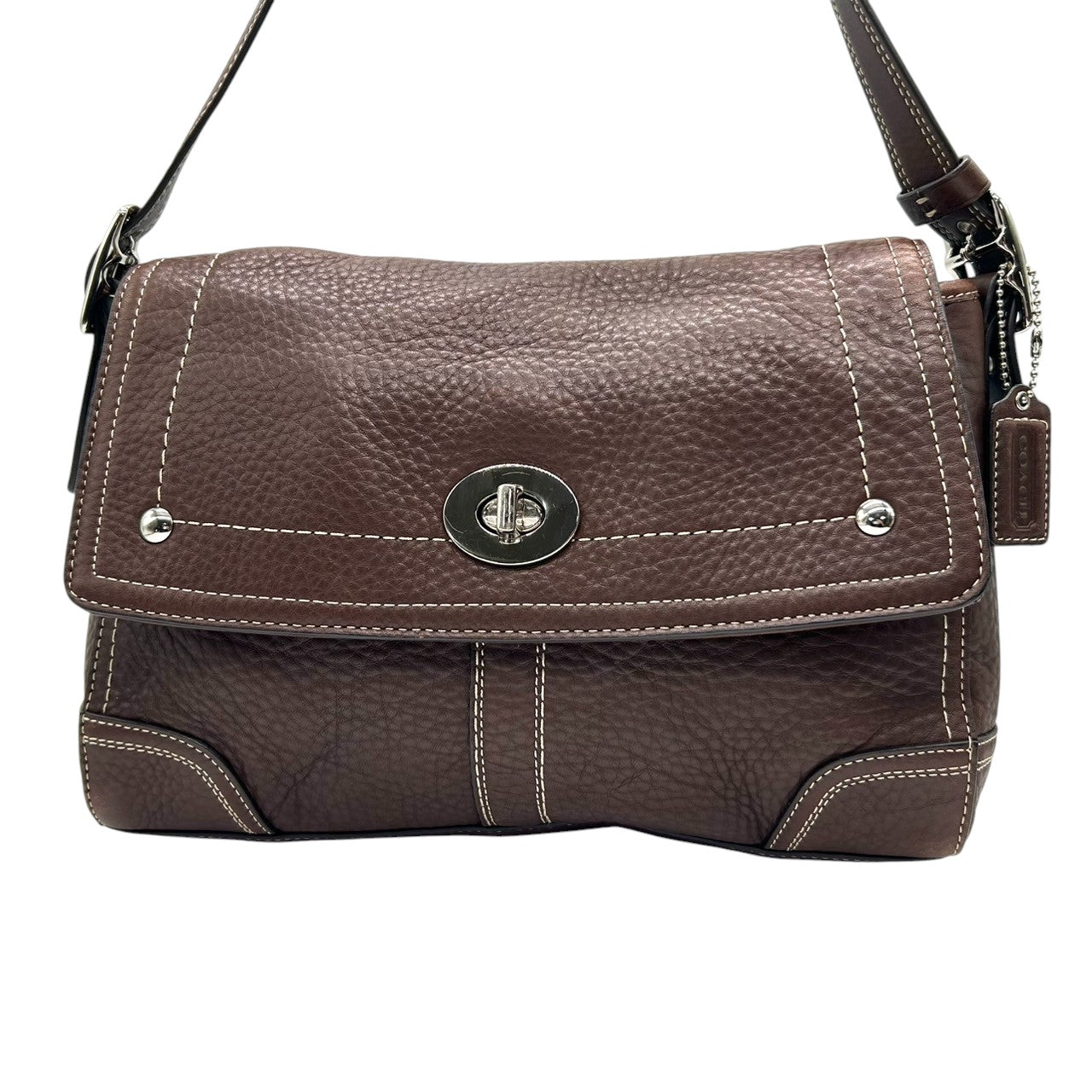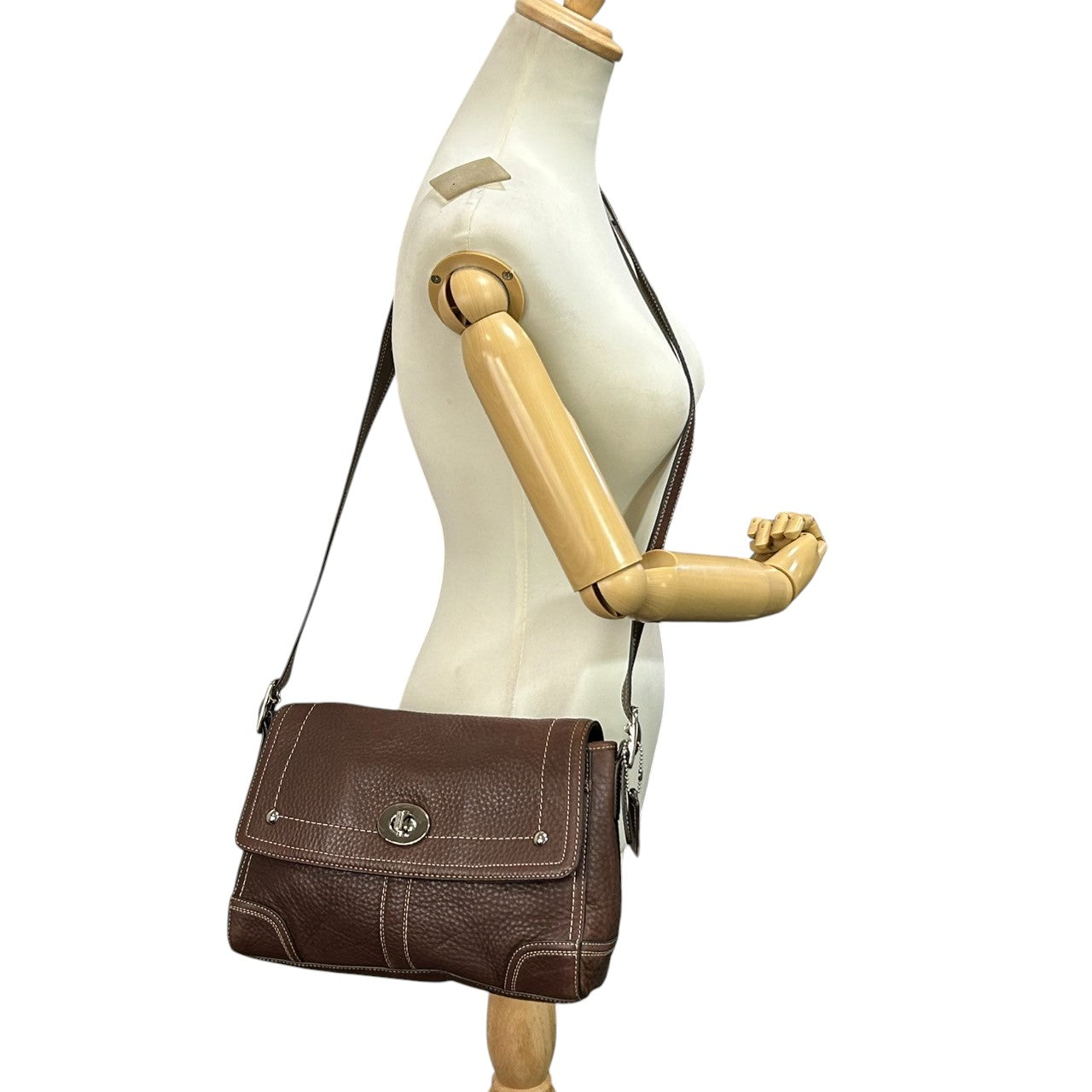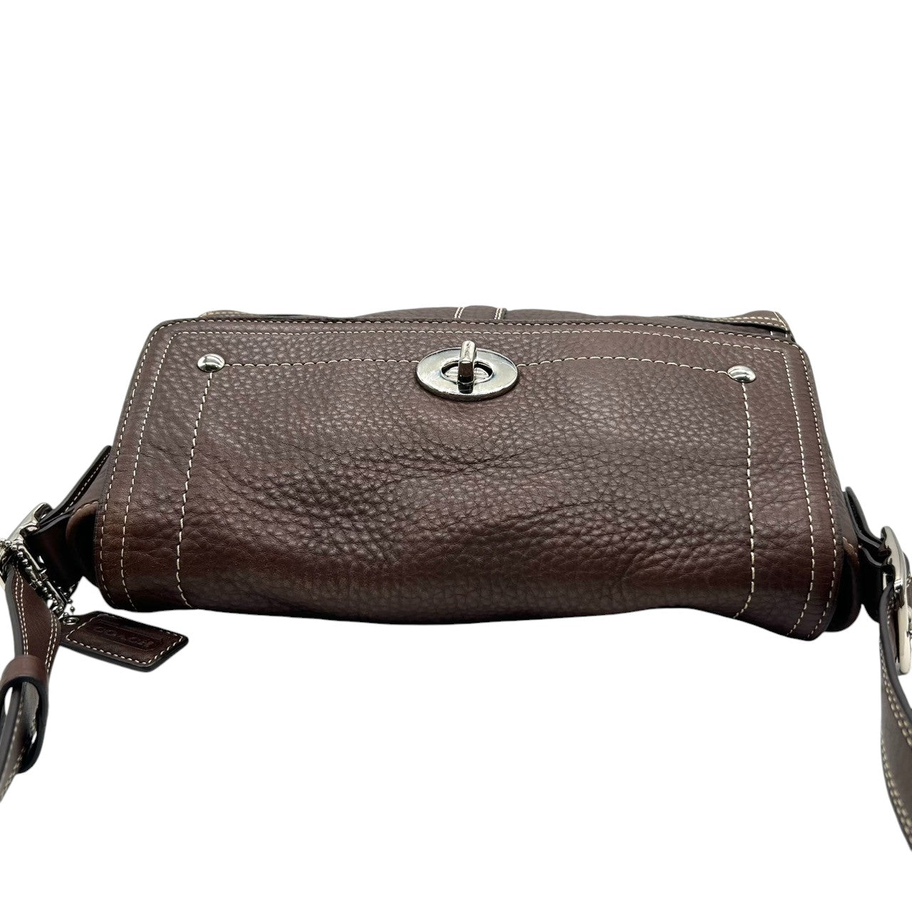 COACH コーチ ショルダーバッグ F13957 斜め掛け可 自立可 レザー 本革 シボ革 ブラウン ターンロック フラップ式 白ステッチ シルバー金具 レディース エレガント クラシック カジュアル 通勤 通学 Y2K 00s s53