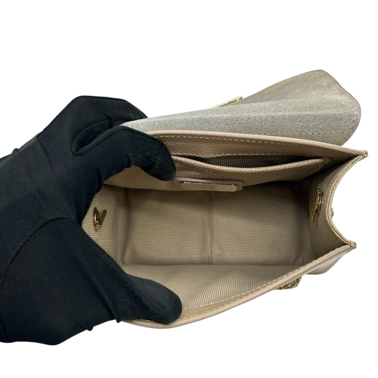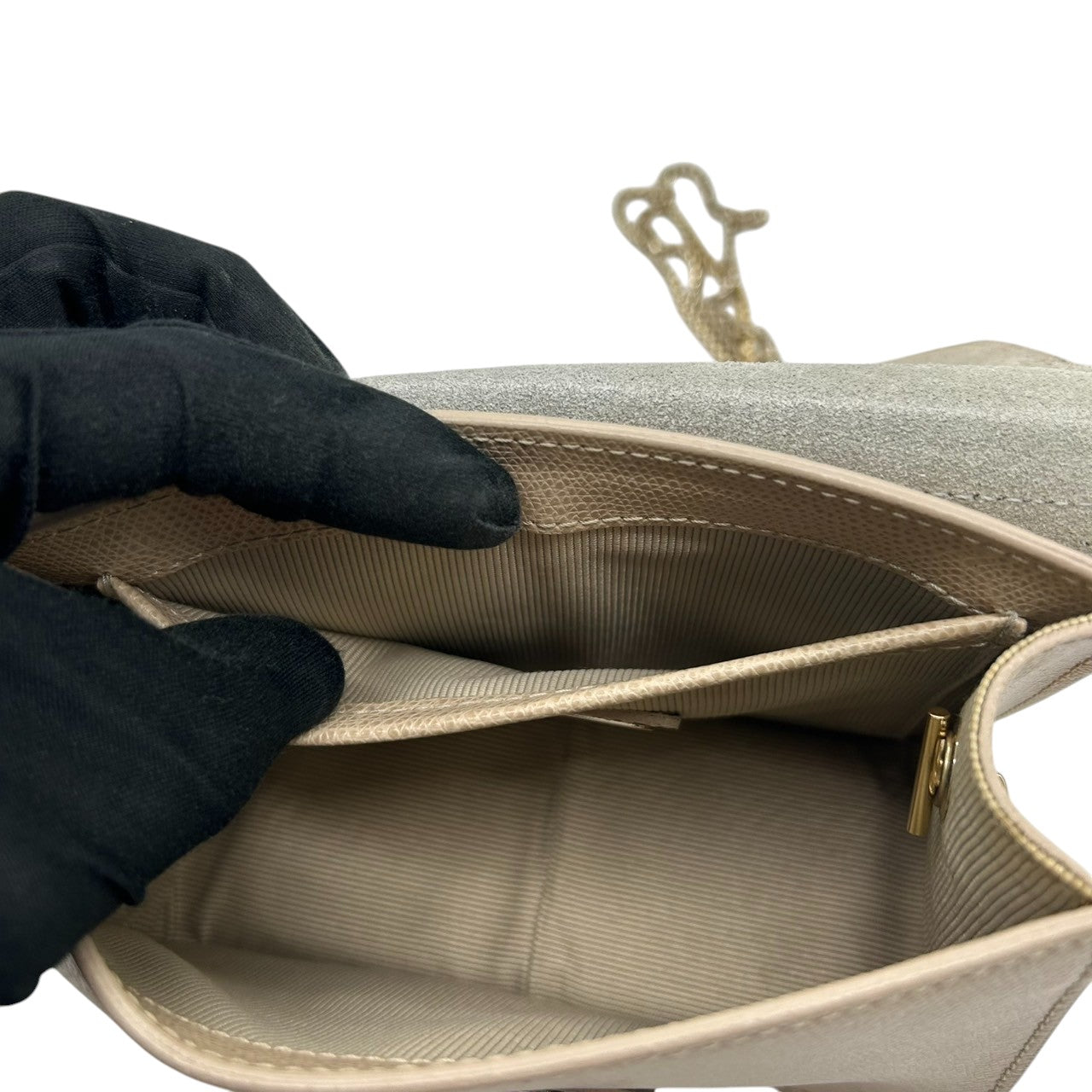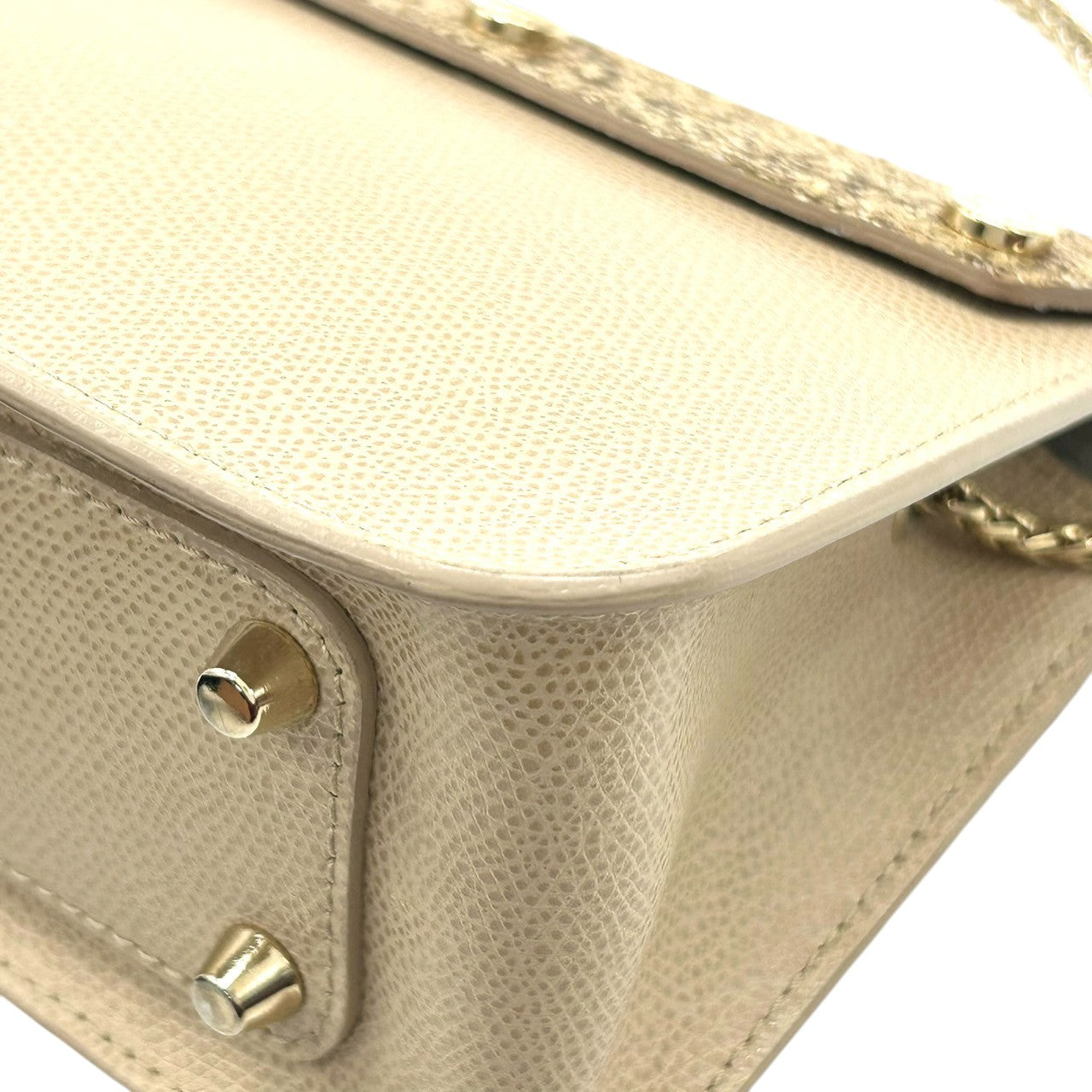 【美品】FURLA フルラ メトロポリス チェーンショルダーバッグ ミニバッグ ポシェット 斜め掛け可 自立可 レザー グリッター ラメ ベージュ ゴールド イタリア製 レディース パーティー エレガント 人気モデル クリーニング済み s63
