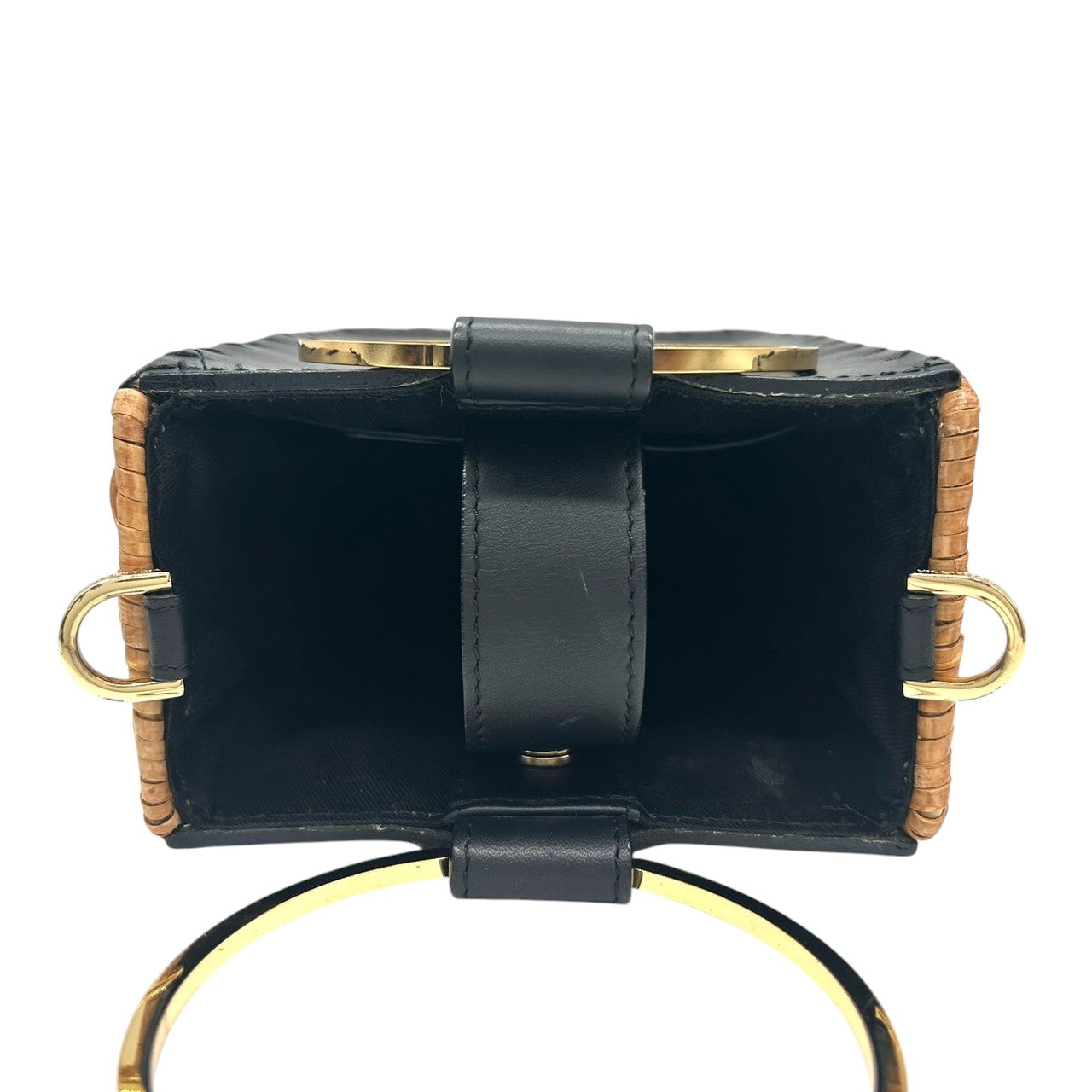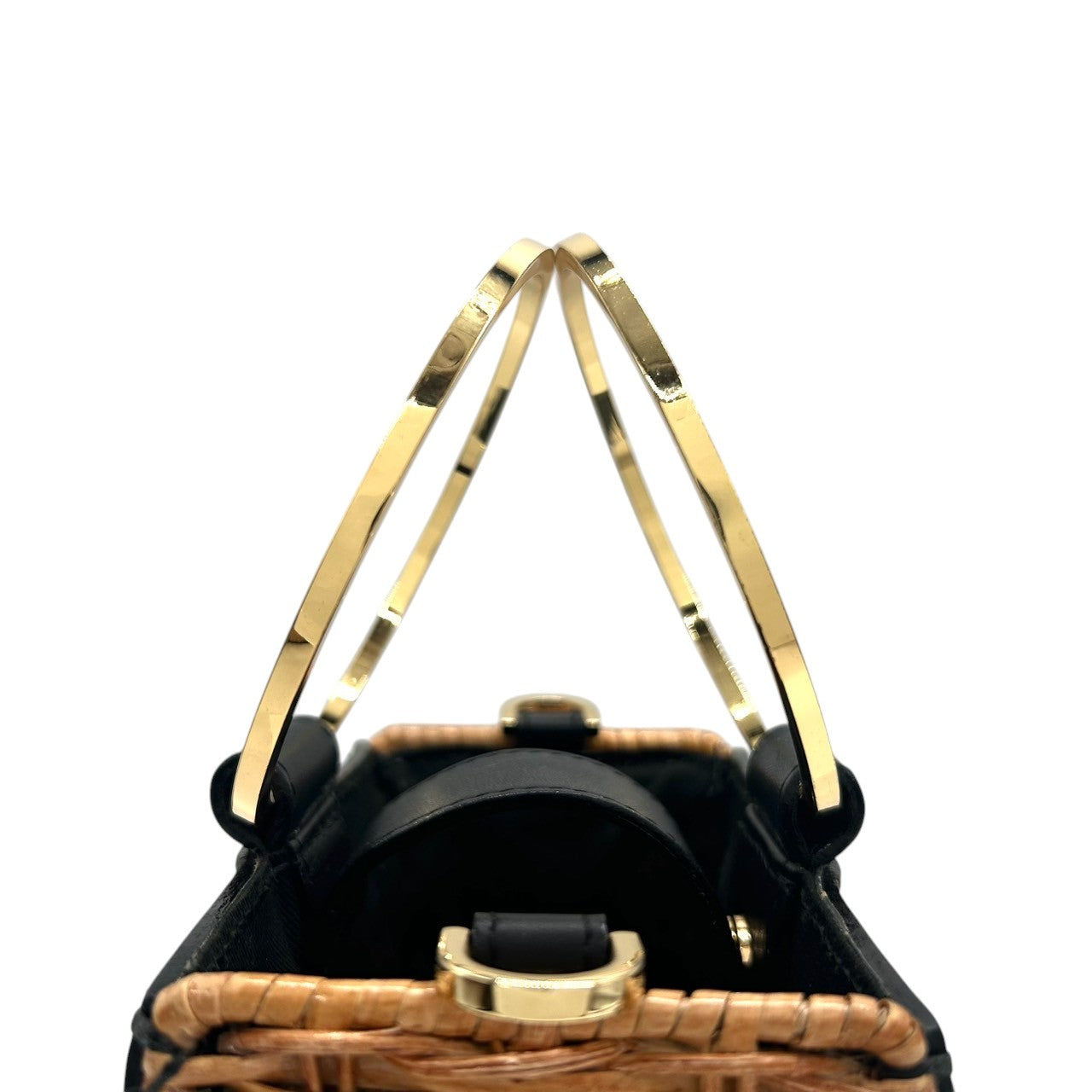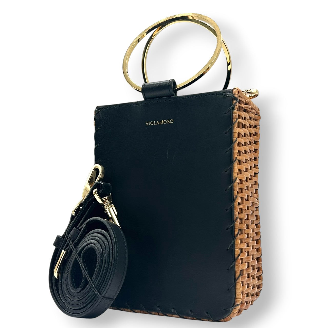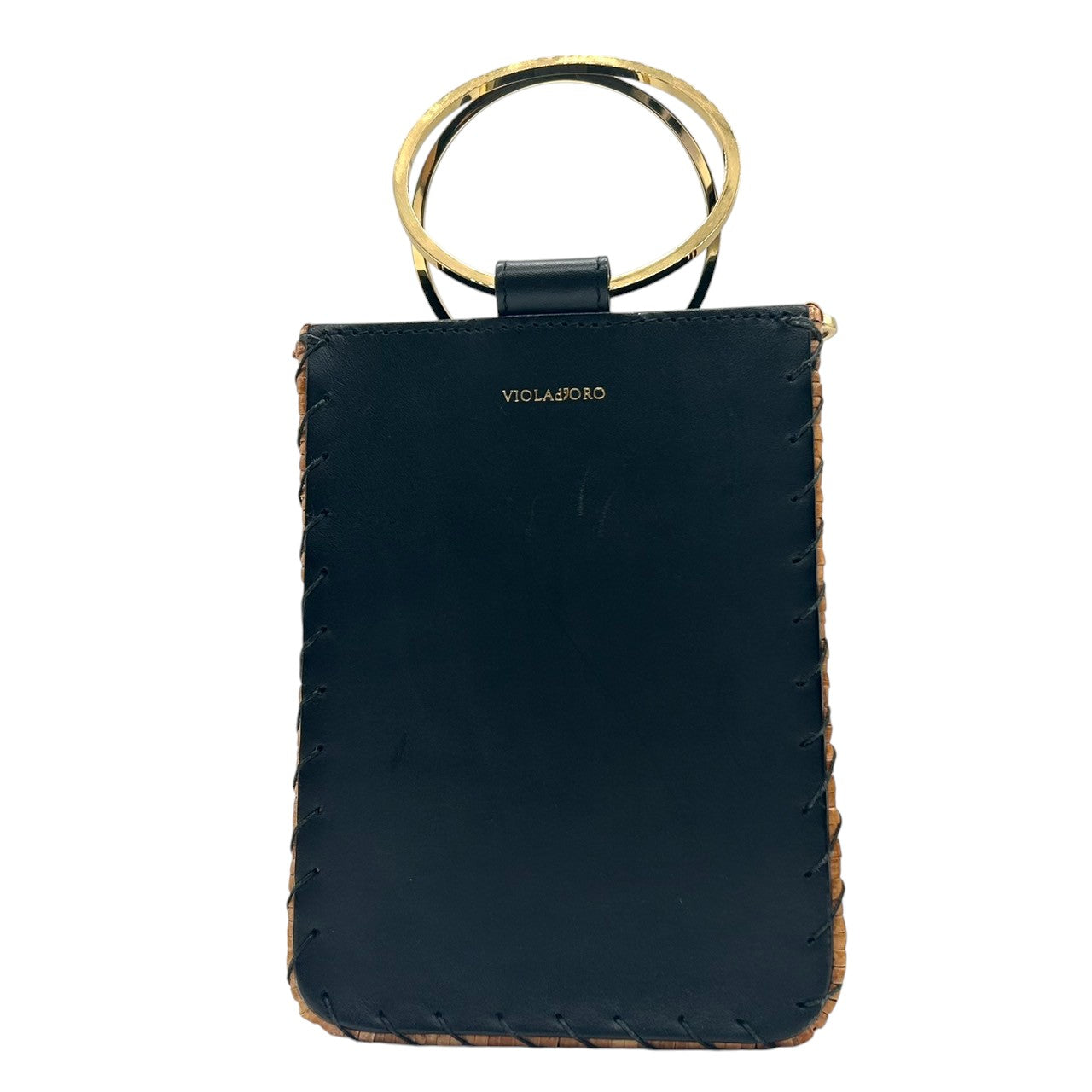 【VIOLA'dORO】ヴィオラドーロ 2WAY ハンドバッグ ショルダーバッグ 斜め掛け可 自立可 かごバッグ スクエア型 ラタン レザー ブラック ゴールド金具 メタルリングハンドル レディース スタイリッシュ モダン クリーニング済み s33