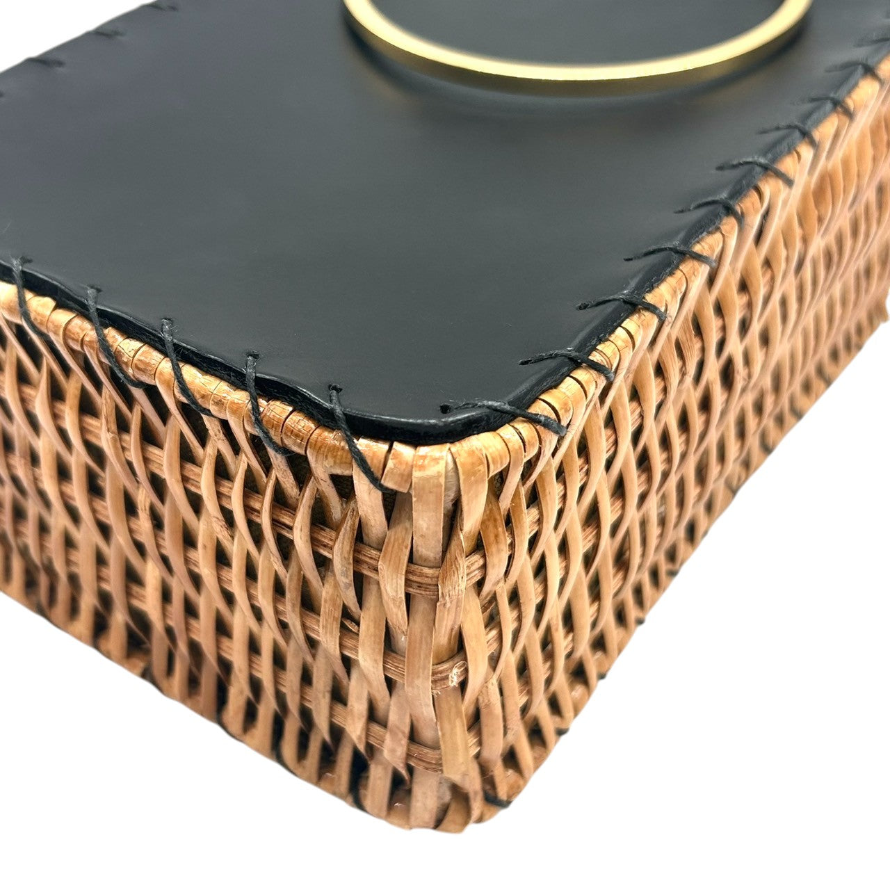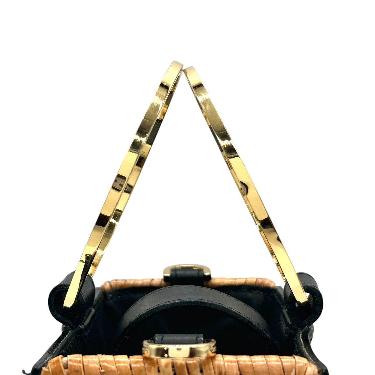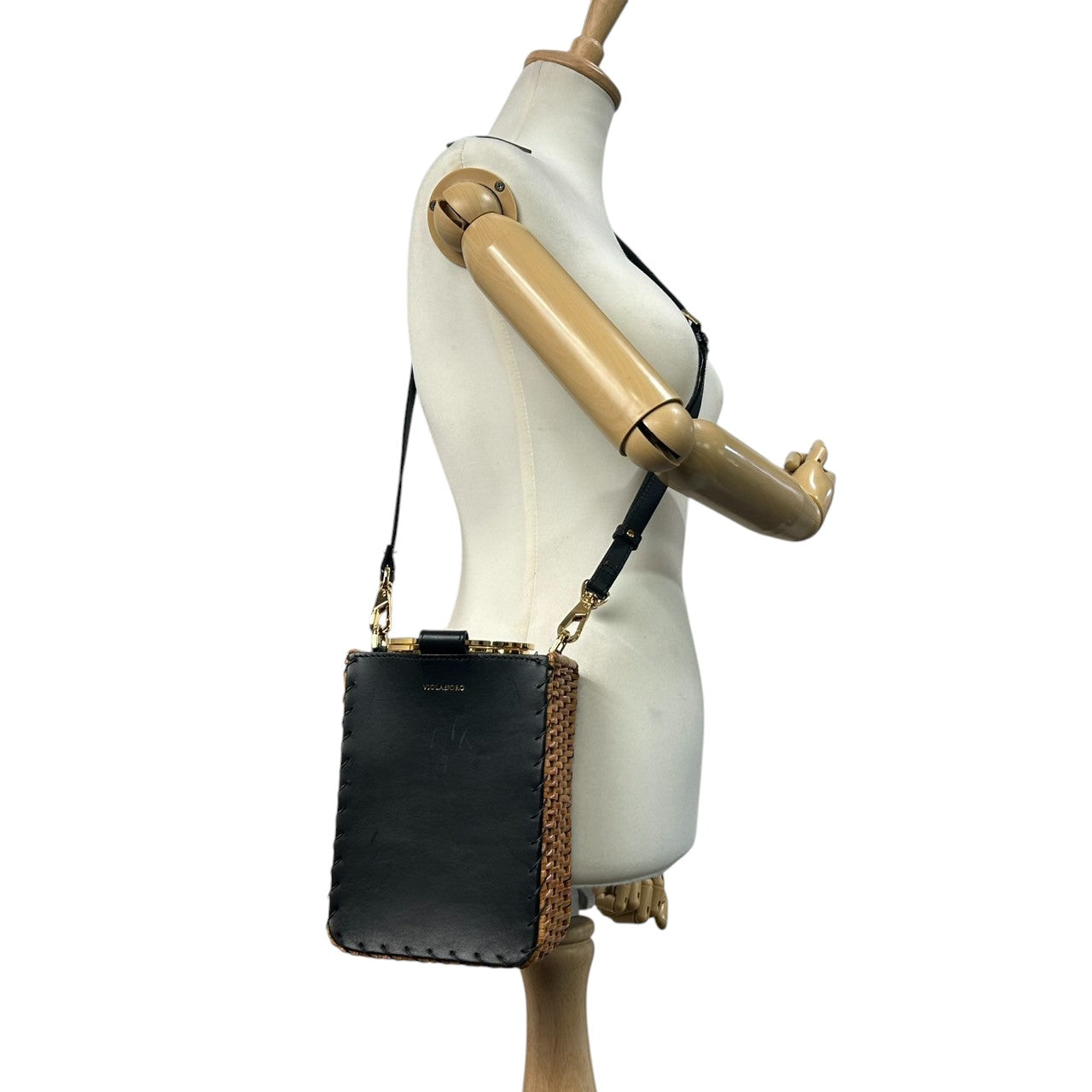 【VIOLA'dORO】ヴィオラドーロ 2WAY ハンドバッグ ショルダーバッグ 斜め掛け可 自立可 かごバッグ スクエア型 ラタン レザー ブラック ゴールド金具 メタルリングハンドル レディース スタイリッシュ モダン クリーニング済み s33