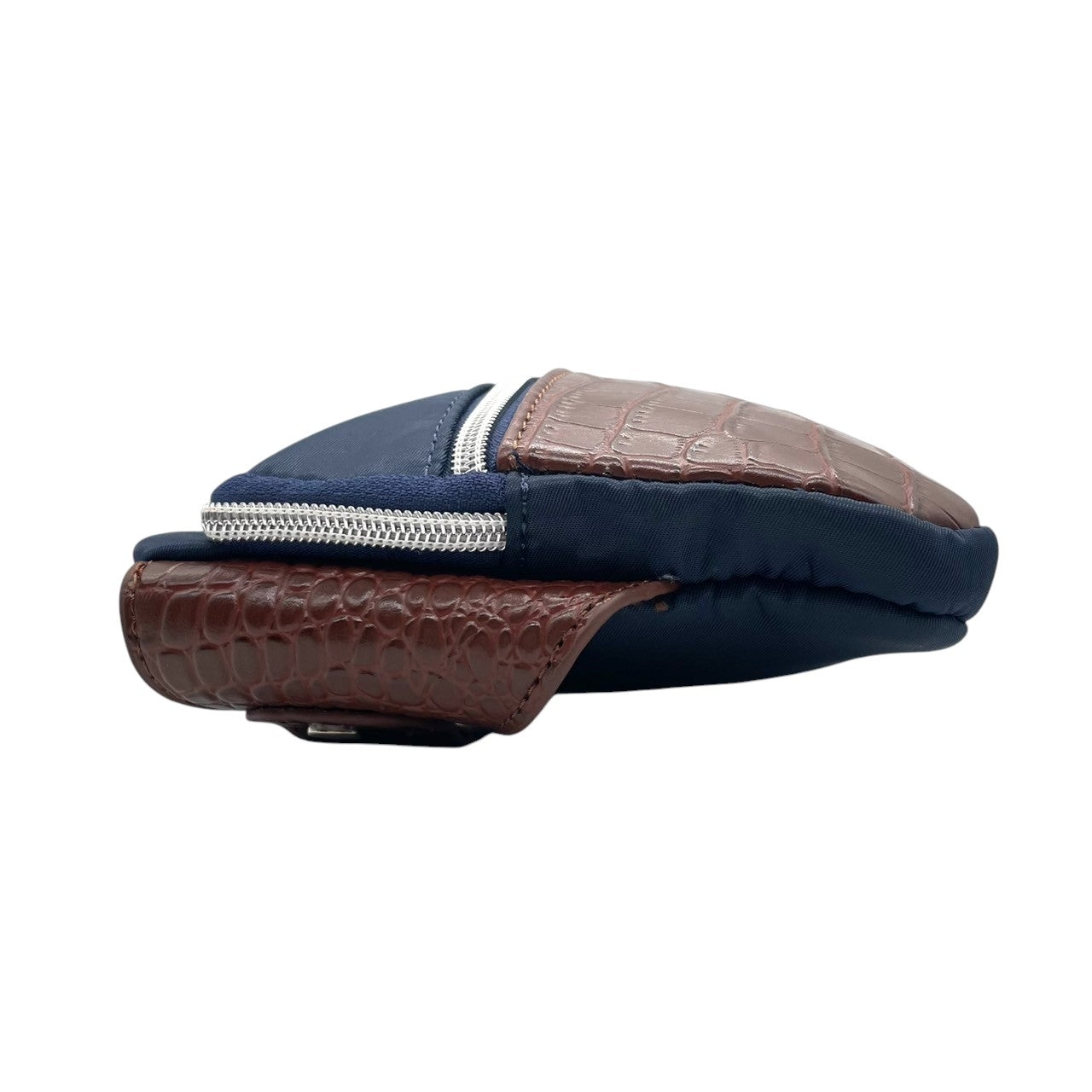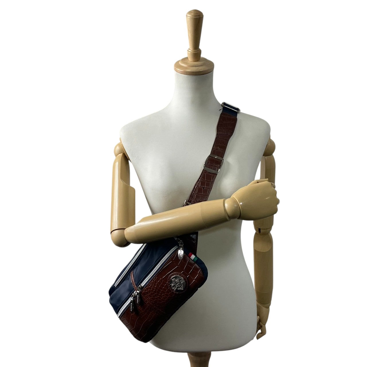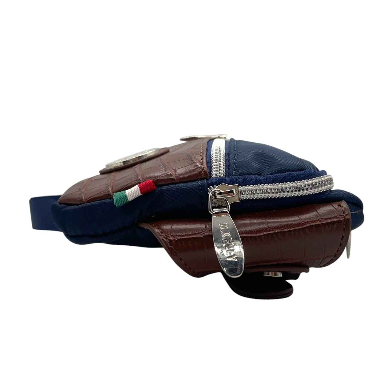 【美品】D.KELLY ディーケリー ボディバッグ ウエストバッグ スリングバッグ ワンショルダー 斜め掛け 型押しレザー ナイロン バイカラー ネイビー ブラウン メンズ レディース ユニセックス 軽量 スタイリッシュ 人気モデル クリーニング済み s1