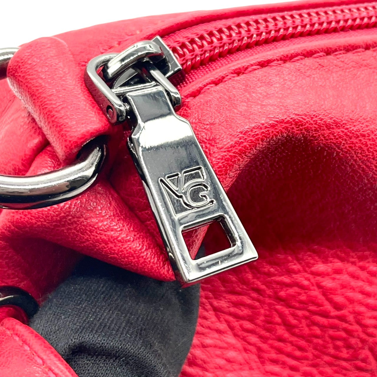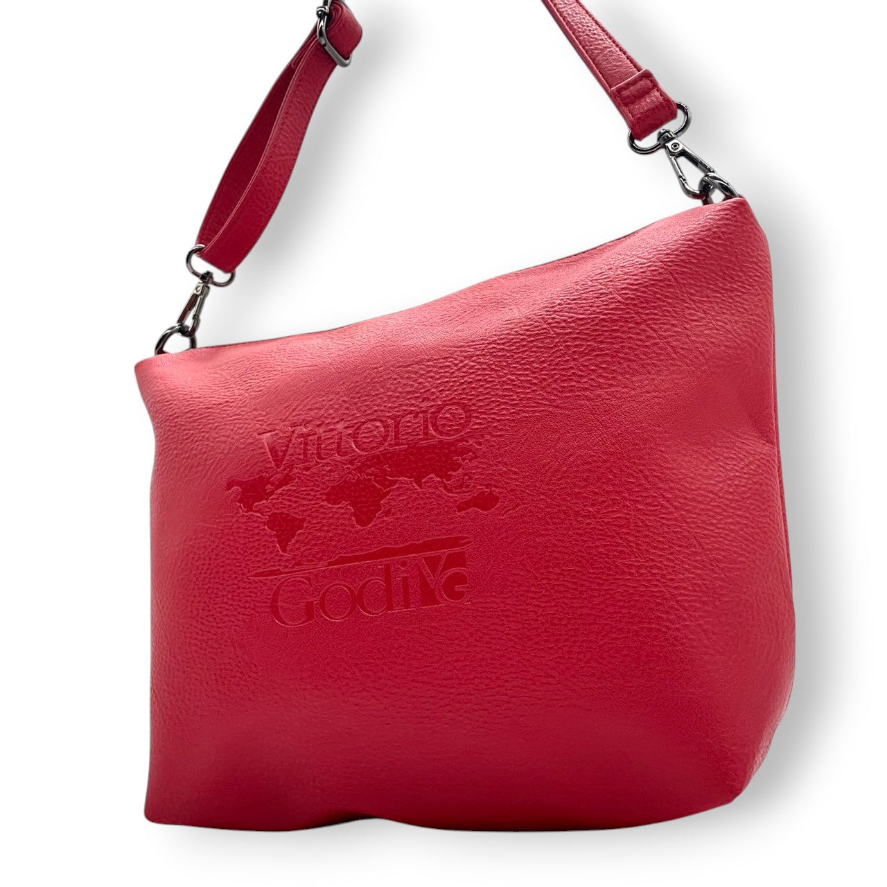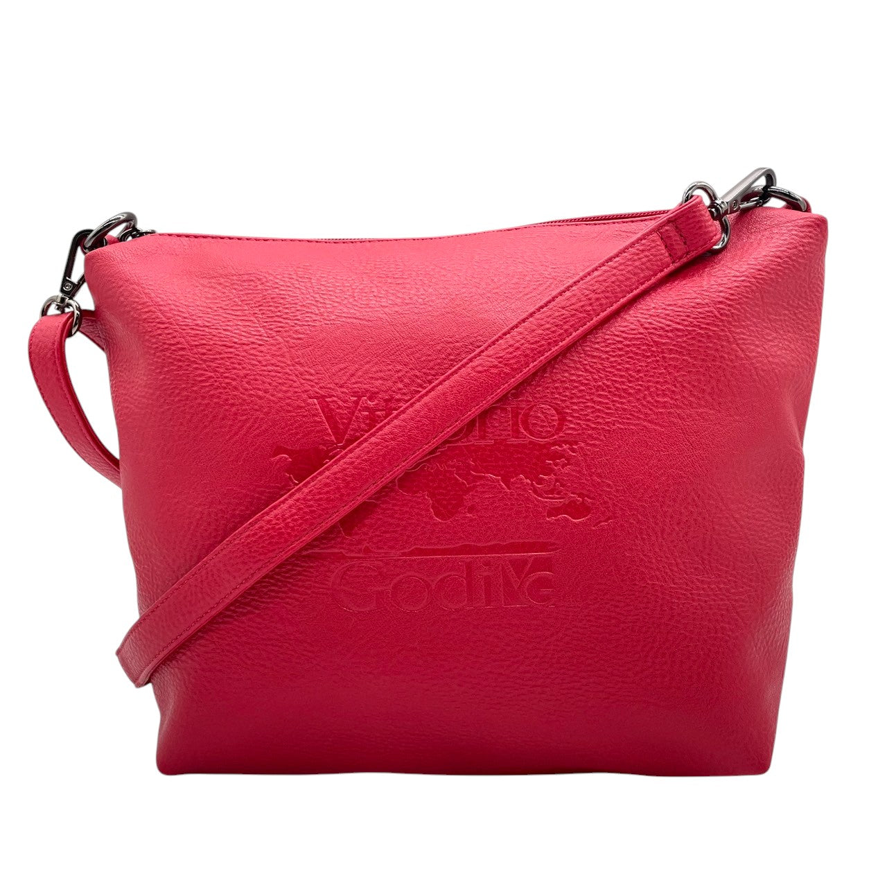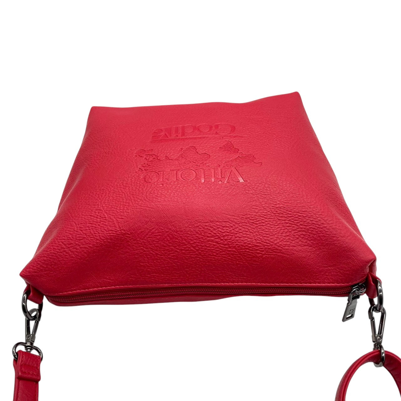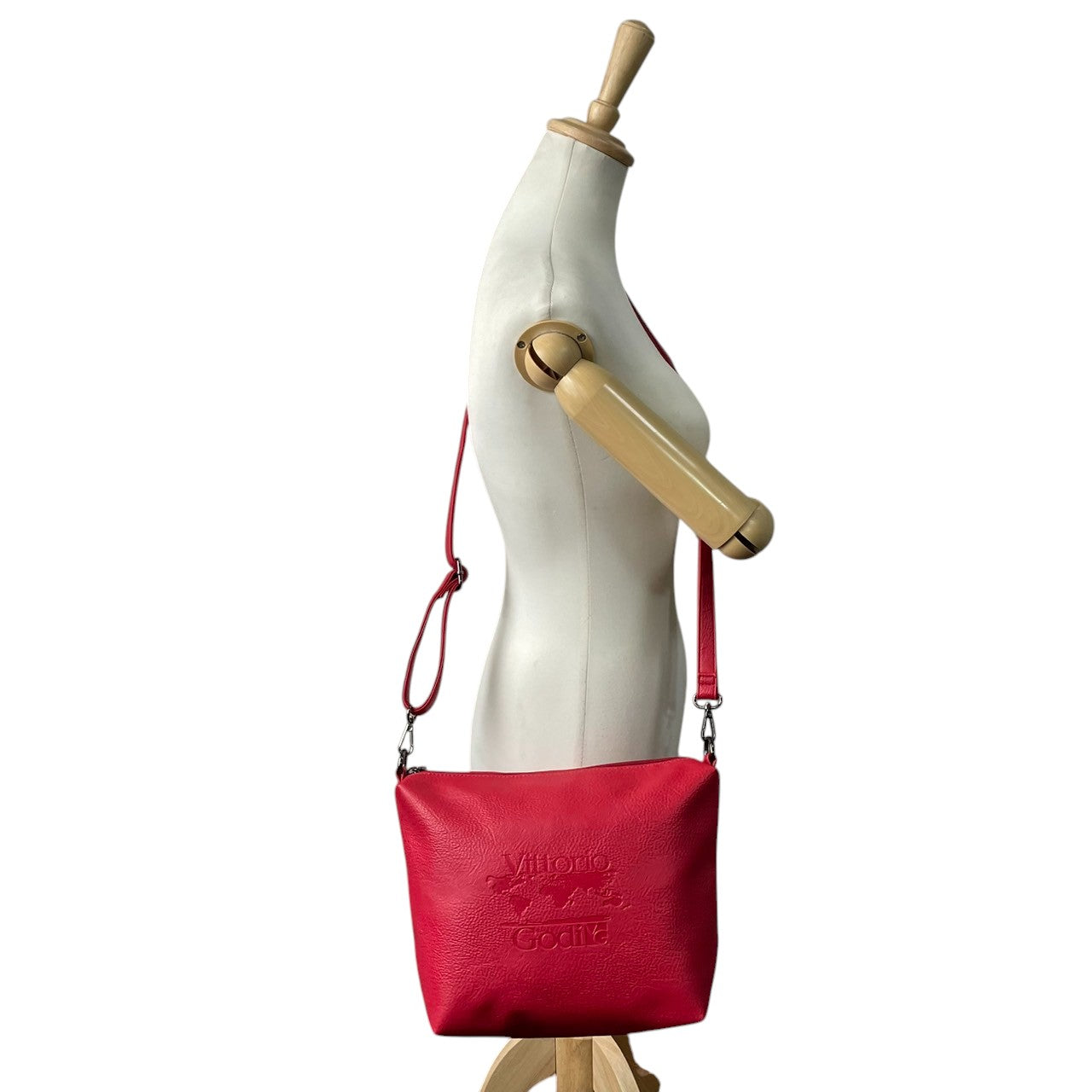 【美品】Vittorio Godi ヴィットリオゴーディ ショルダーバッグ ワンショルダー 斜め掛け可 クロスボディ 本革 レザー シボ革 レッド 赤 ワールドマップ ロゴ型押し レディース カジュアル エレガント クリーニング済み u3