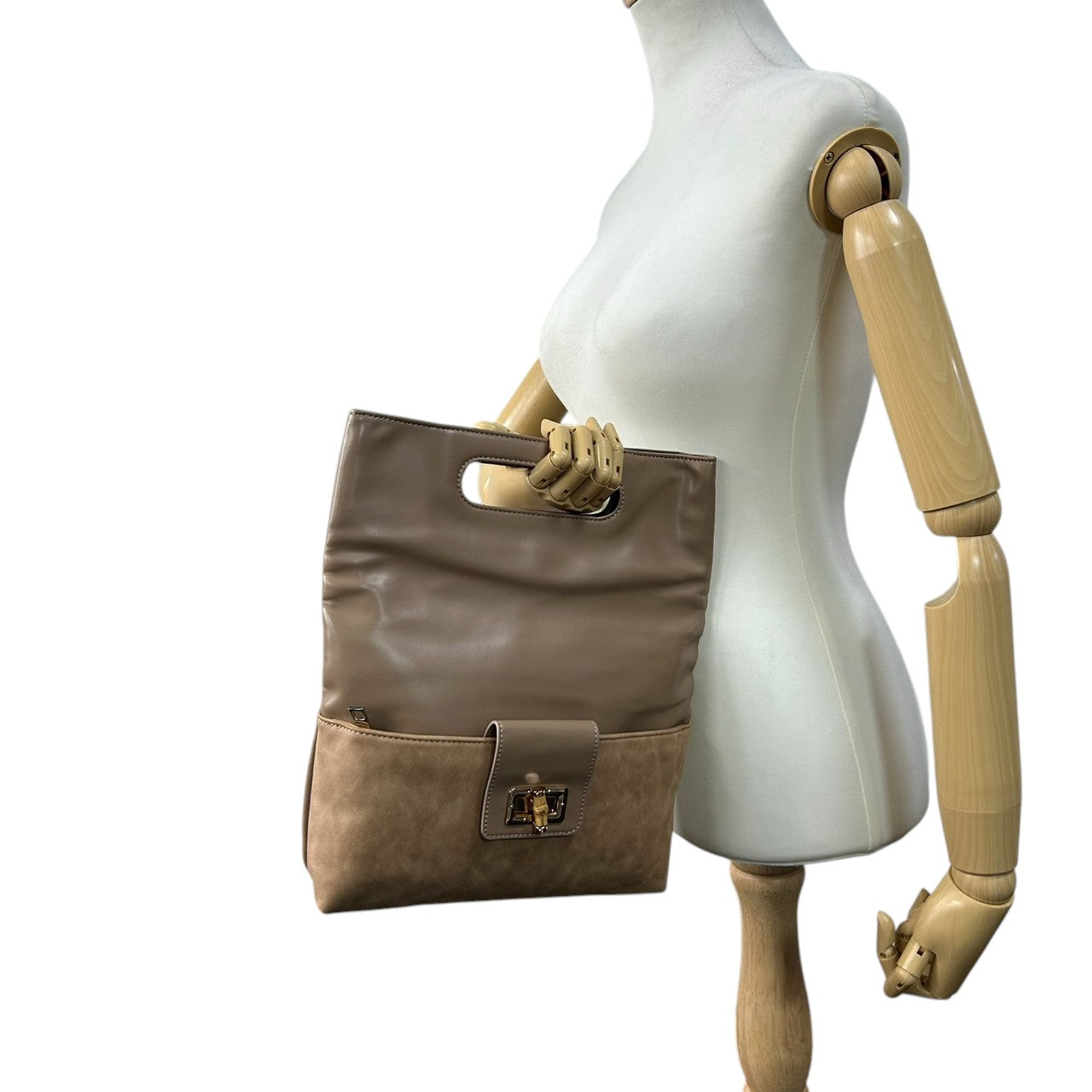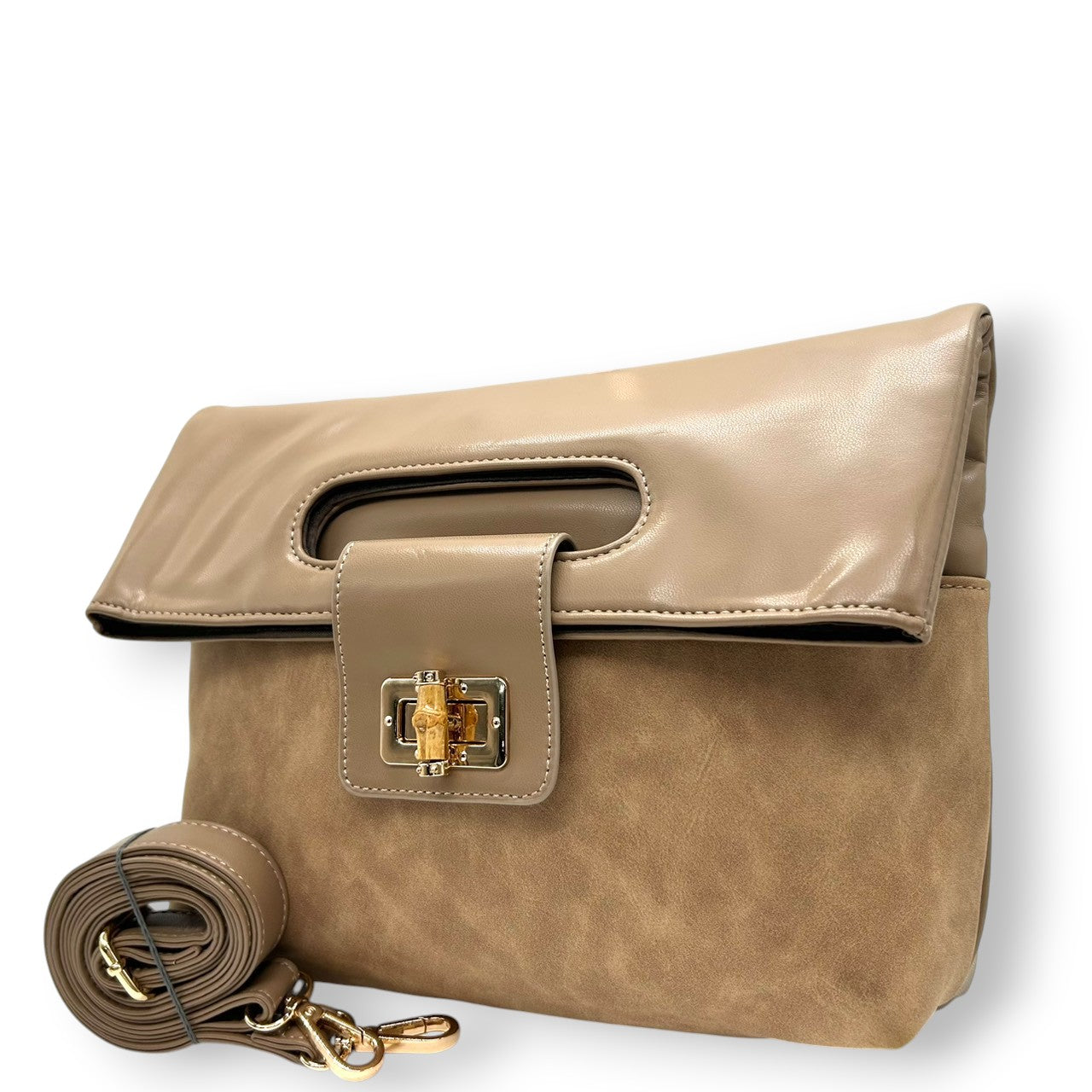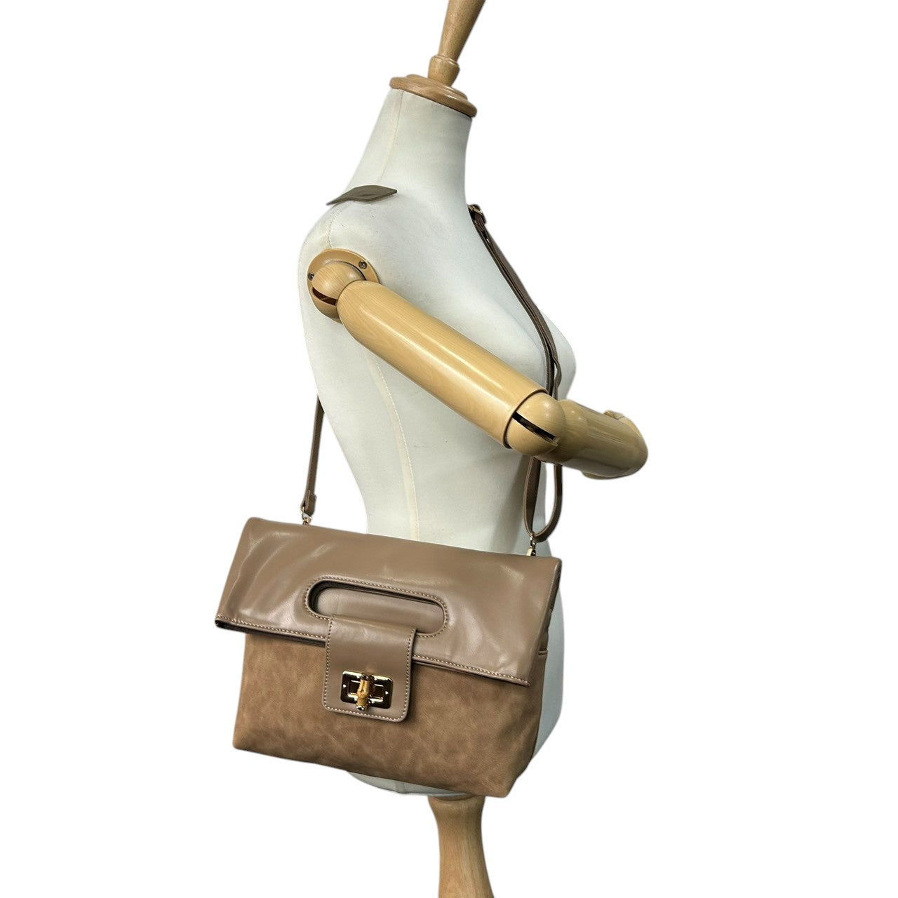 【美品】PAPILLONNER パピヨネ 2WAY クラッチバッグ ショルダーバッグ ハンドバッグ 斜め掛け可 レザー スエード ベージュ系 バンブー ターンロック レディース エレガント スタイリッシュ 人気モデル クリーニング済み s54