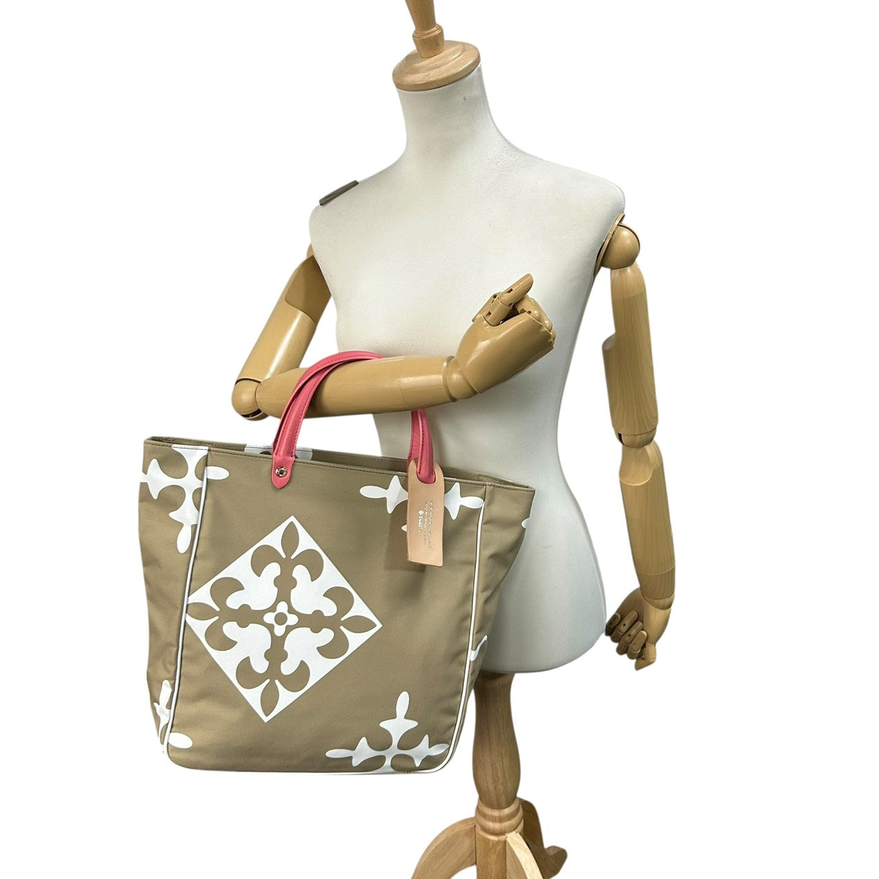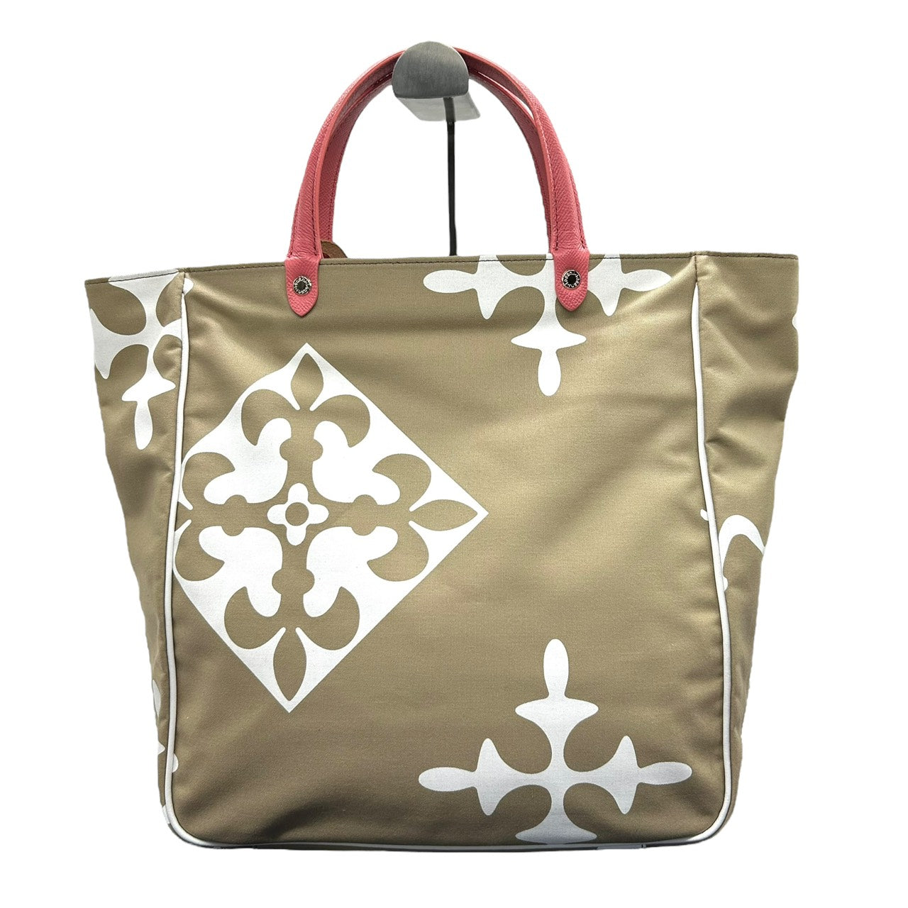 | 商品説明 | russet(ラシット)のトートバッグです。 ブランドらしいモノグラム調デザインをアレンジした幾何学模様が華やかで上品な印象。 軽量で耐久性のあるナイロン素材に、レザーハンドルを組み合わせ高級感をプラスしています。 A4サイズが入る実用的なサイズ感で、通勤・通学・お出かけなど幅広いシーンに活躍。 柔らかなベージュトーンにピンクのハンドルが女性らしいアクセントになったトートバッグです。 |