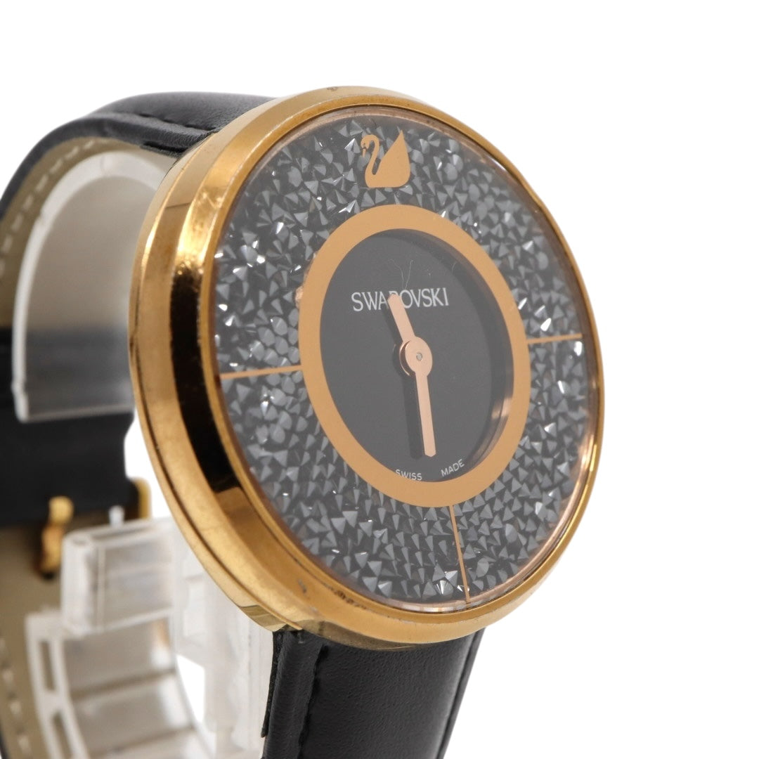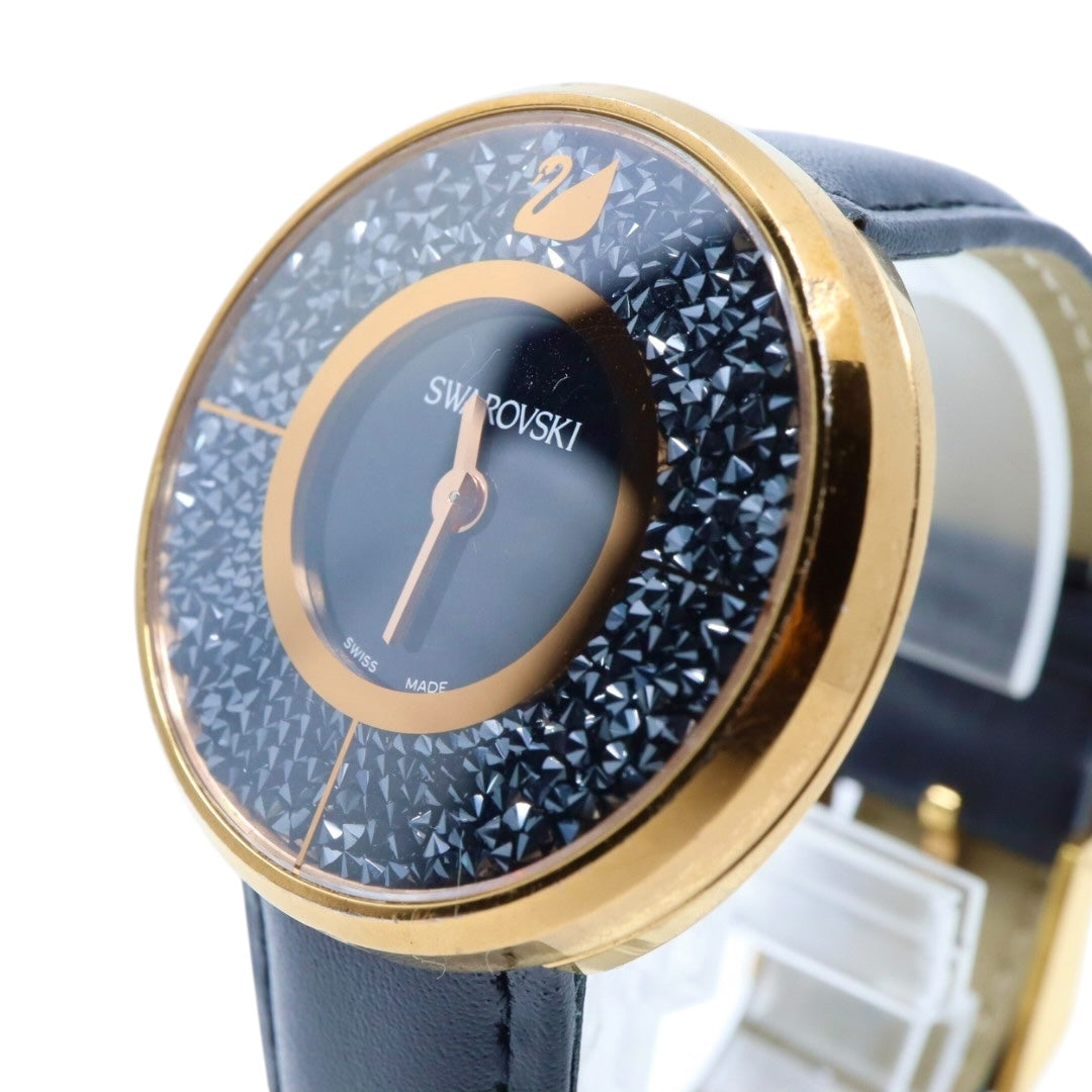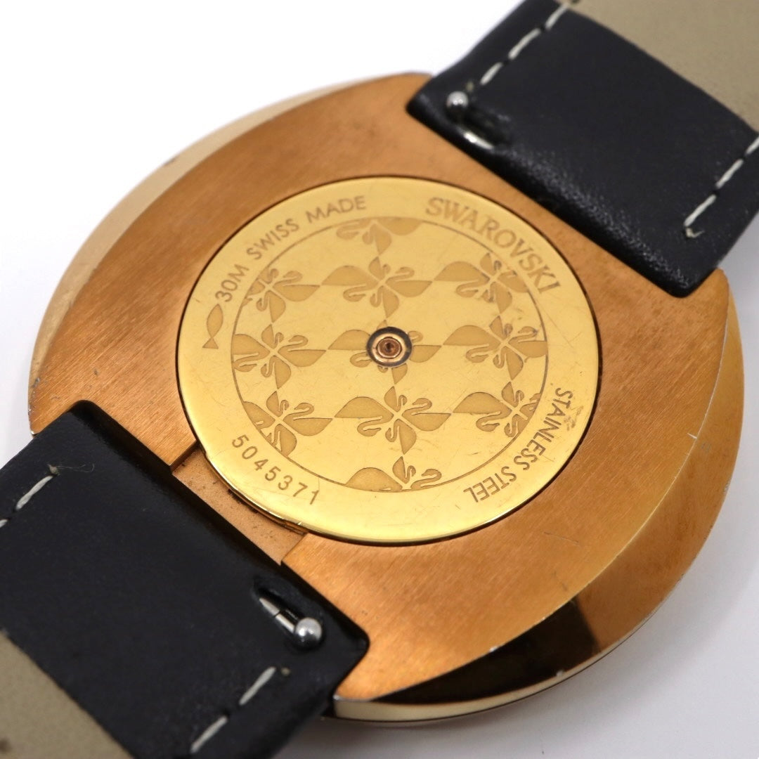 極美品 電池交換済 スワロフスキー 腕時計 5045371 レディース クオーツ ゴールド ブラックレザーベルト クリスタル アナログ ドレスウォッチ エレガント ラグジュアリー スワンロゴ スイス製 クリーニング済み G3
